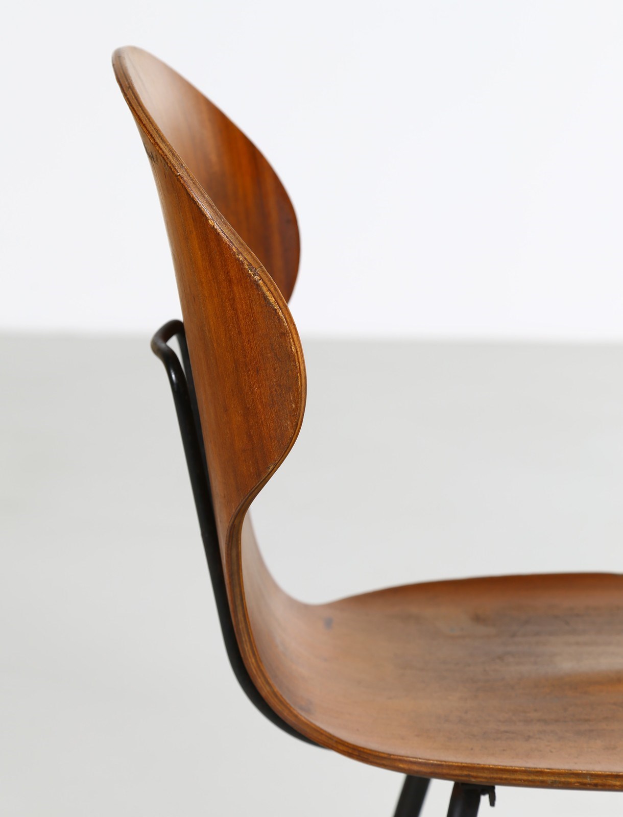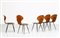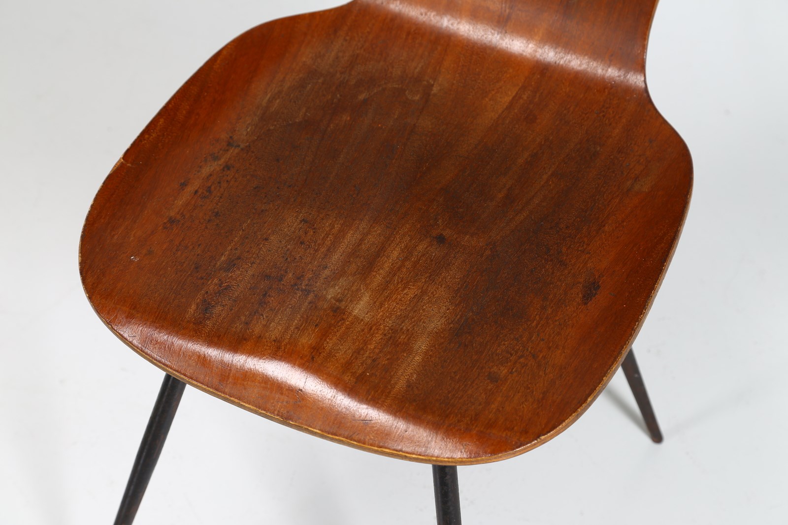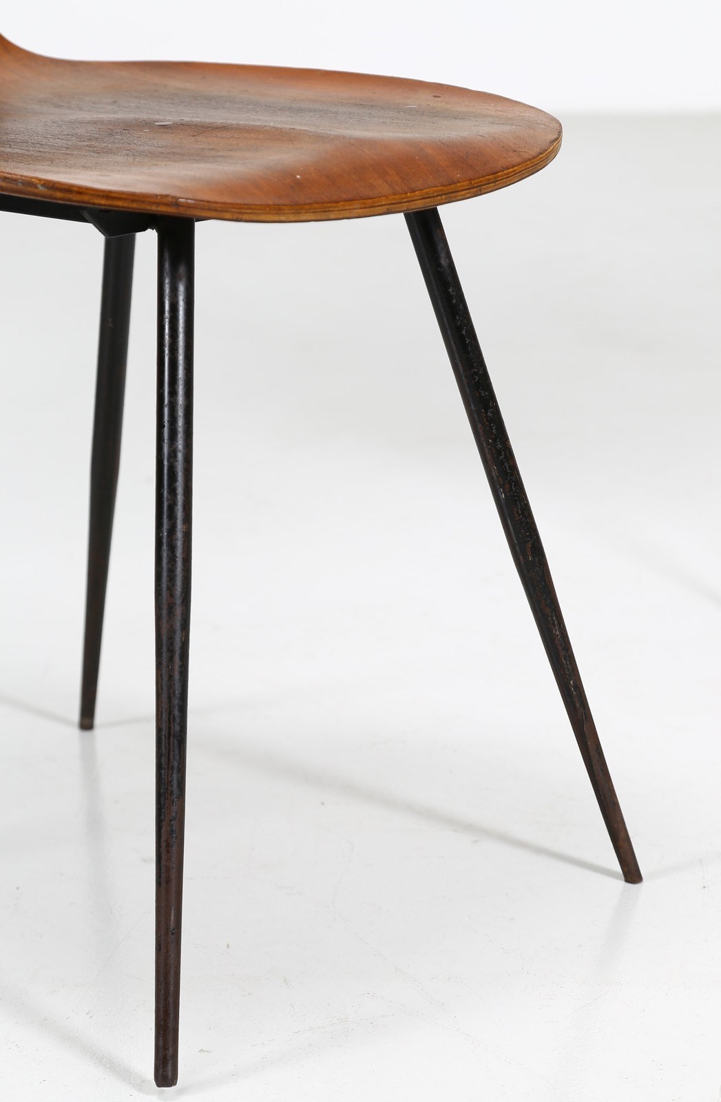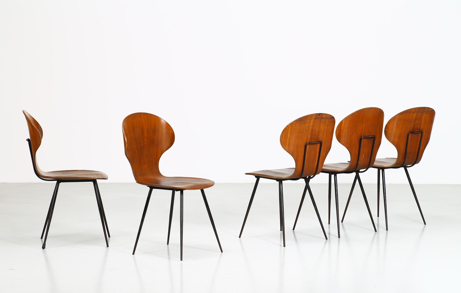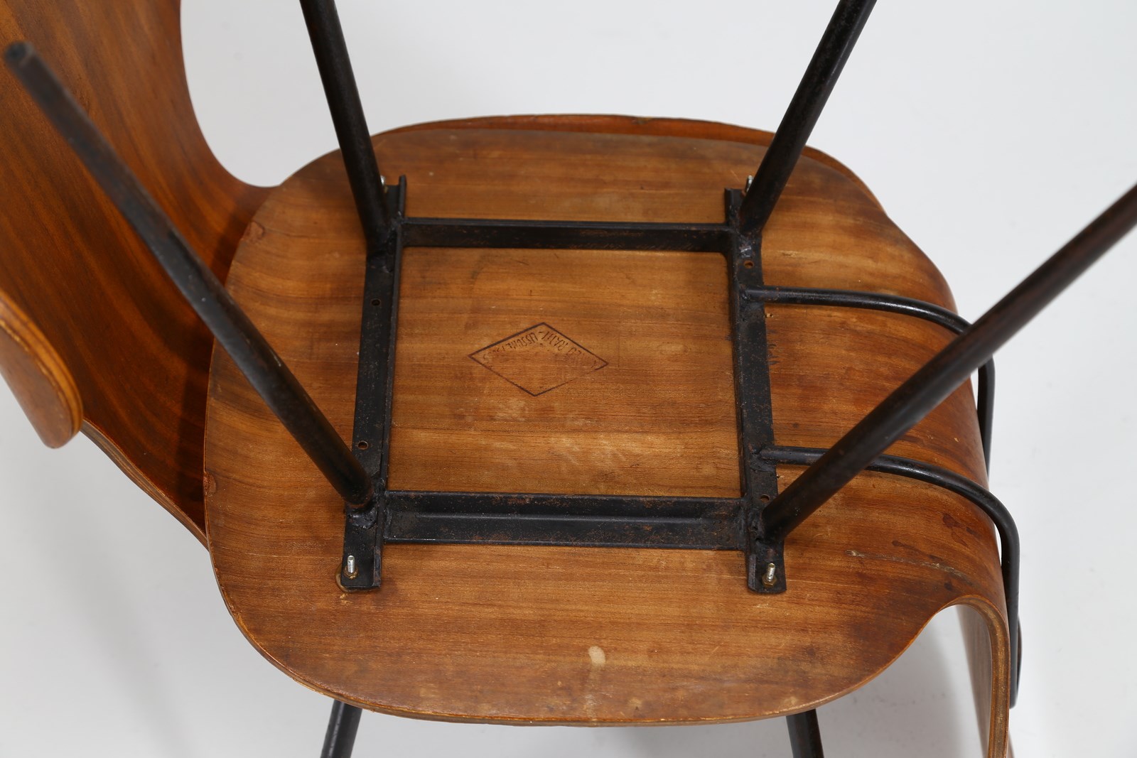 RATTI CARLO Cinque sedie. Metallo laccato, legno. Cm 44,50 x 83,00 x 45,00. Cinque sedie in legno curvato, struttura in metallo, anni 50. Marchio presente "Carlo Ratti, Lissone 75085"Pubblicazioni: M.De Giorgi, 45-63. Abitare Segesta, P. 44, f. 23,24 - Domus, n. 389, aprile 1962, p. 40