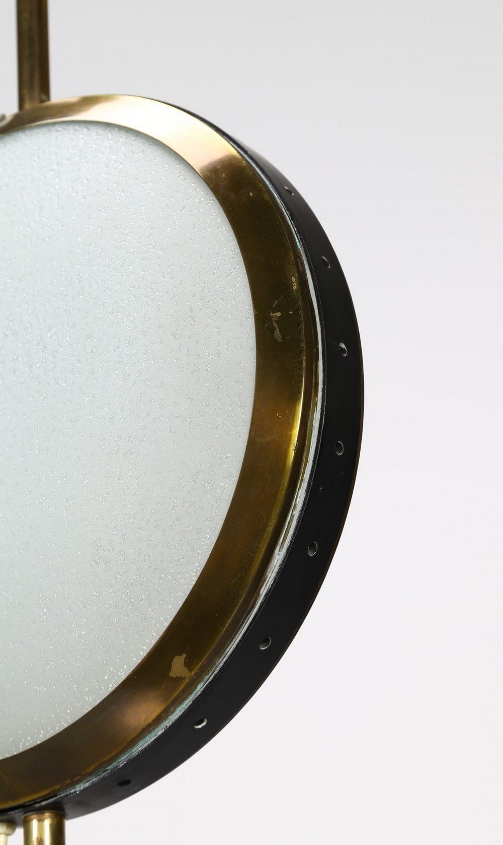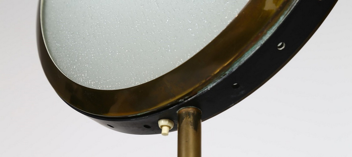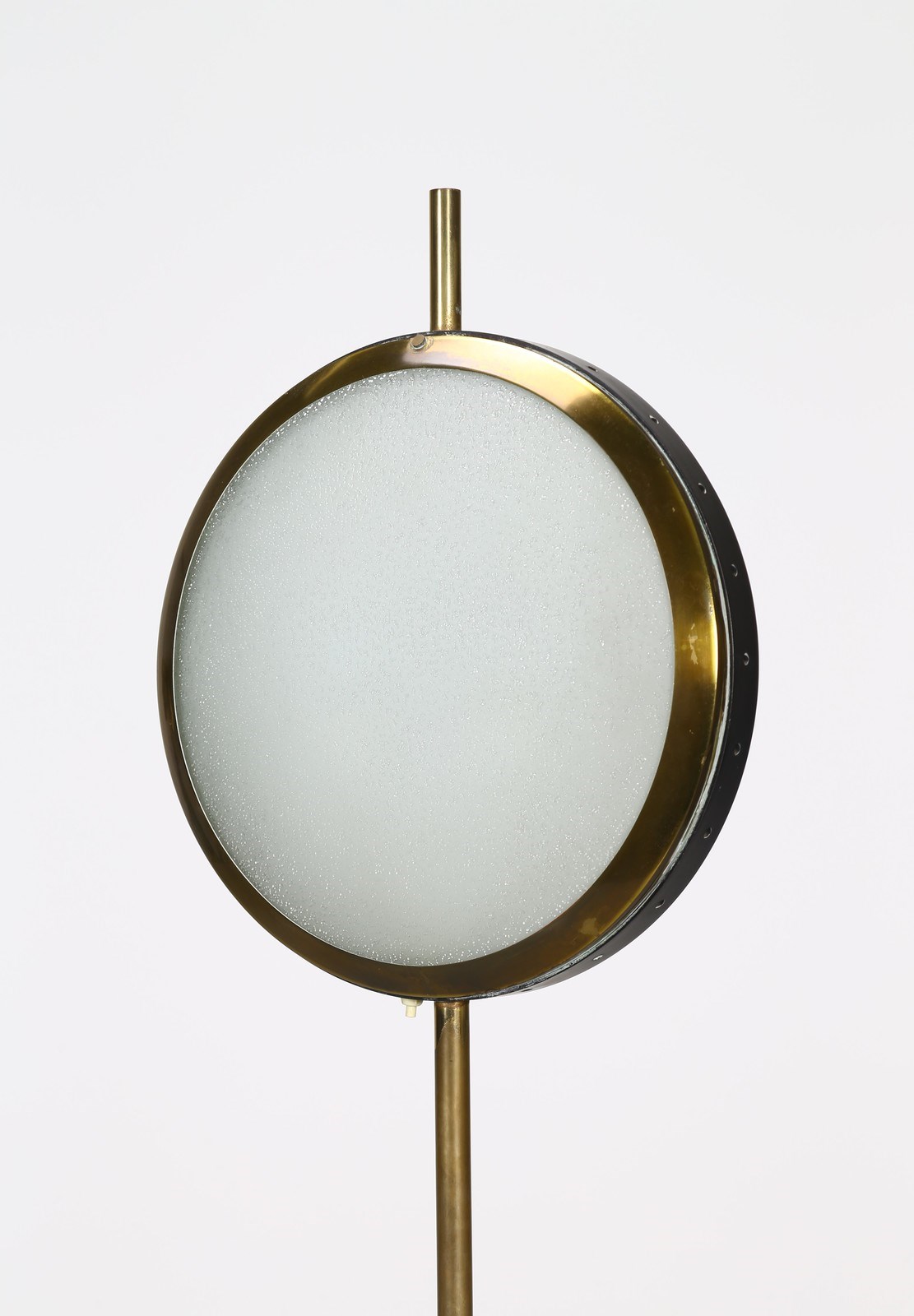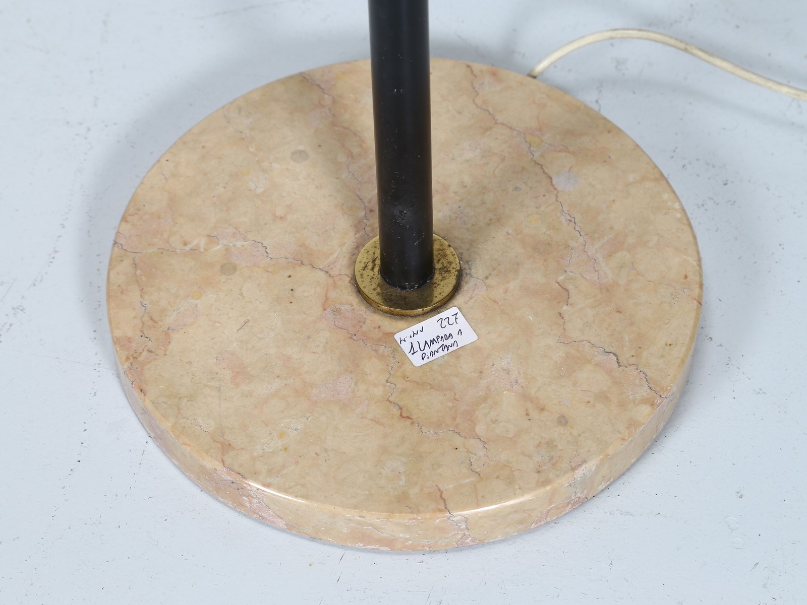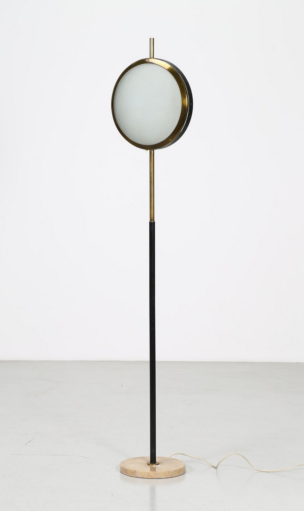 STILNOVO Lampada da terra. Ottone, metallo e marmo. Cm 40,00 x 180,00 x 27,00. Lampada da terra, anni 50. Base in marmo, stelo in metallo laccato nero e ottone, diffusore in vetro e ottone.