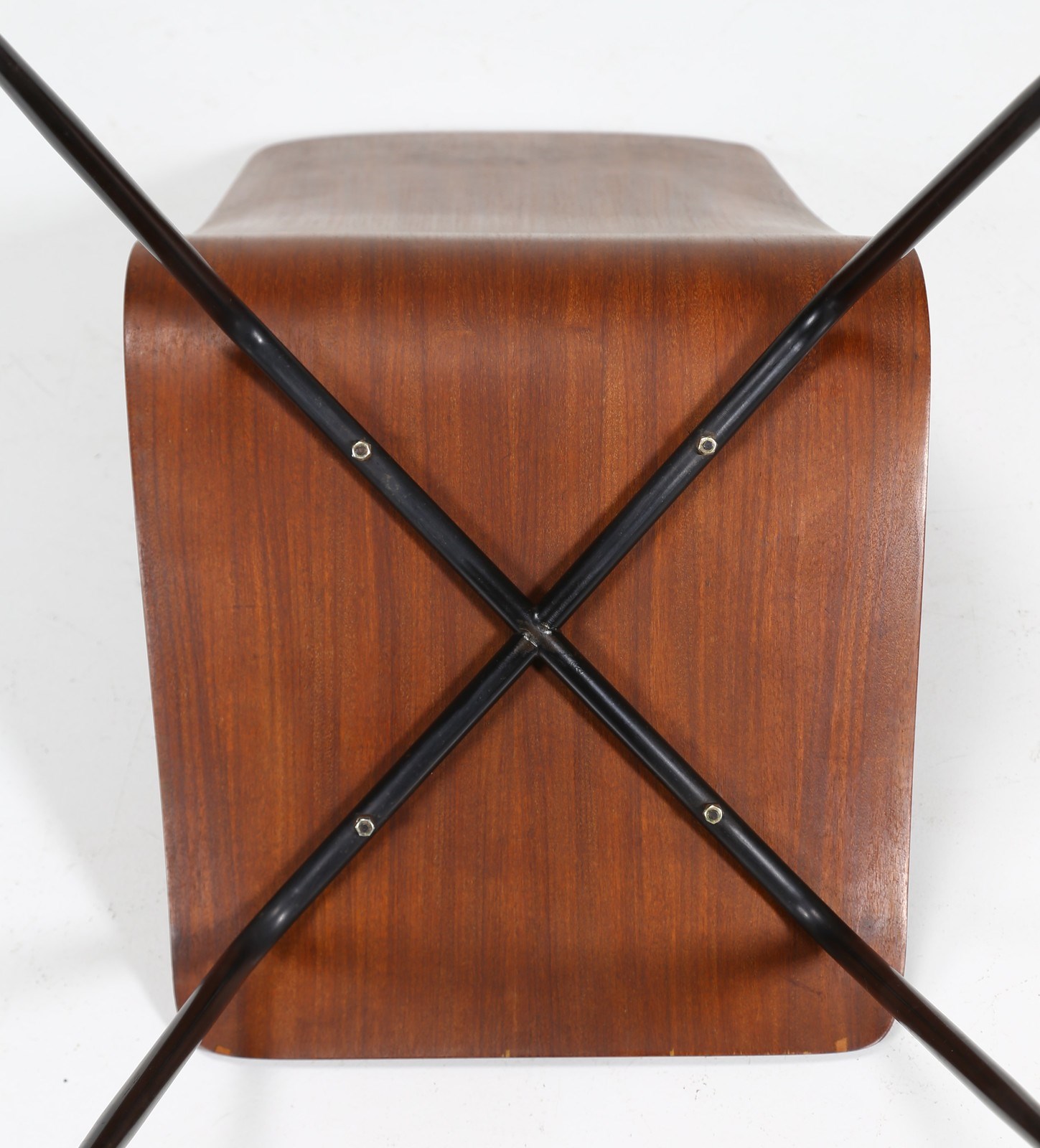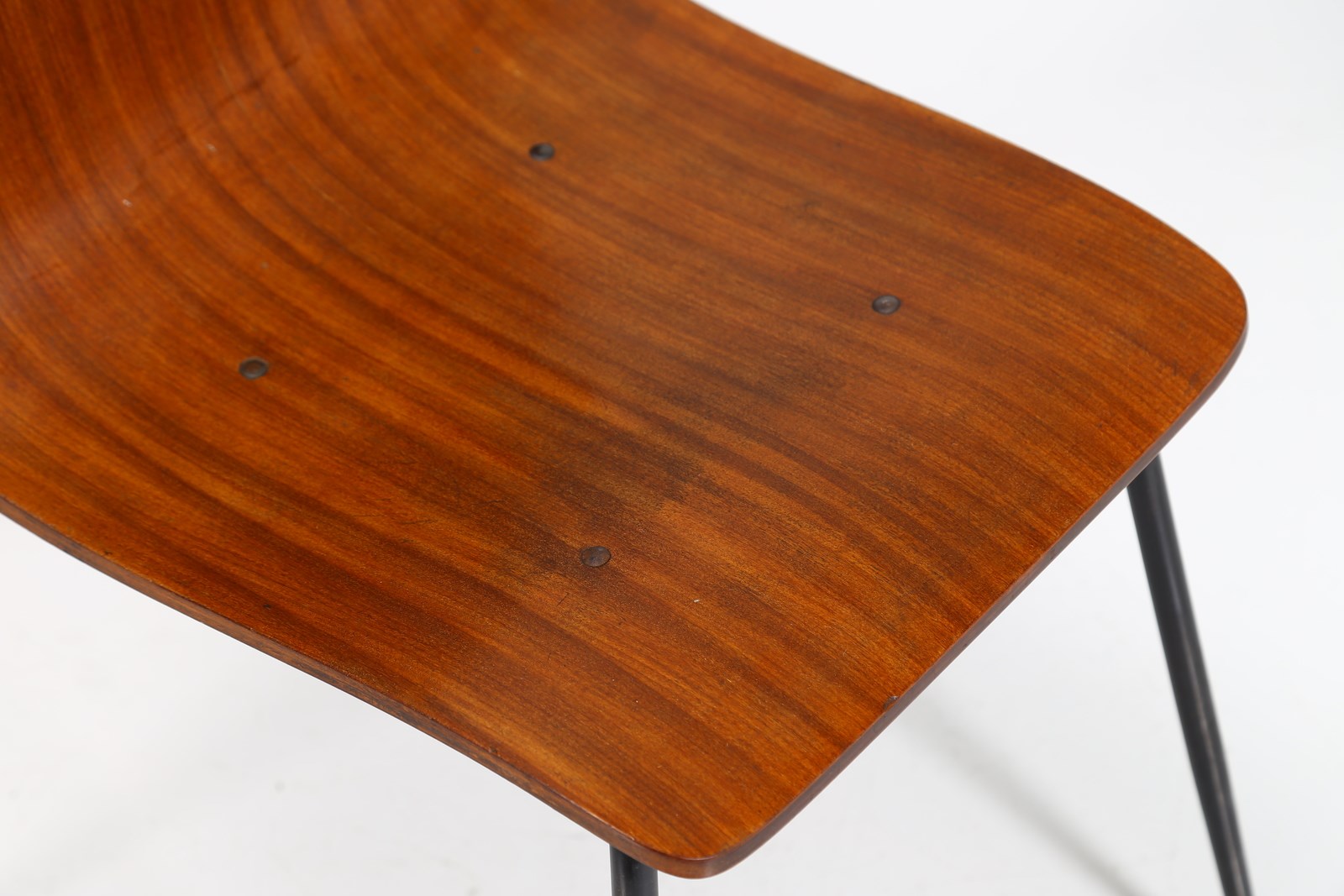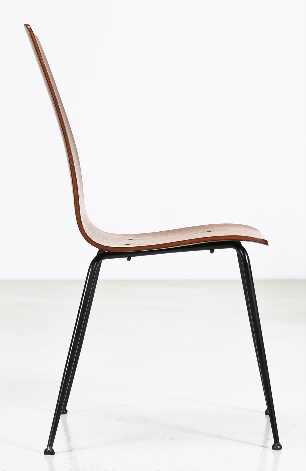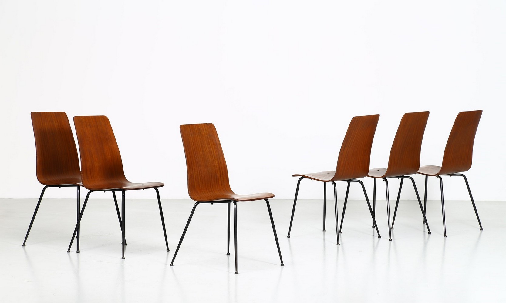 RATTI CARLO Sei sedie. Metallo laccato, legno. Cm 37,50 x 83,00 x 47,00. Sei sedie in legno curvato, struttura in metallo, anni 50.