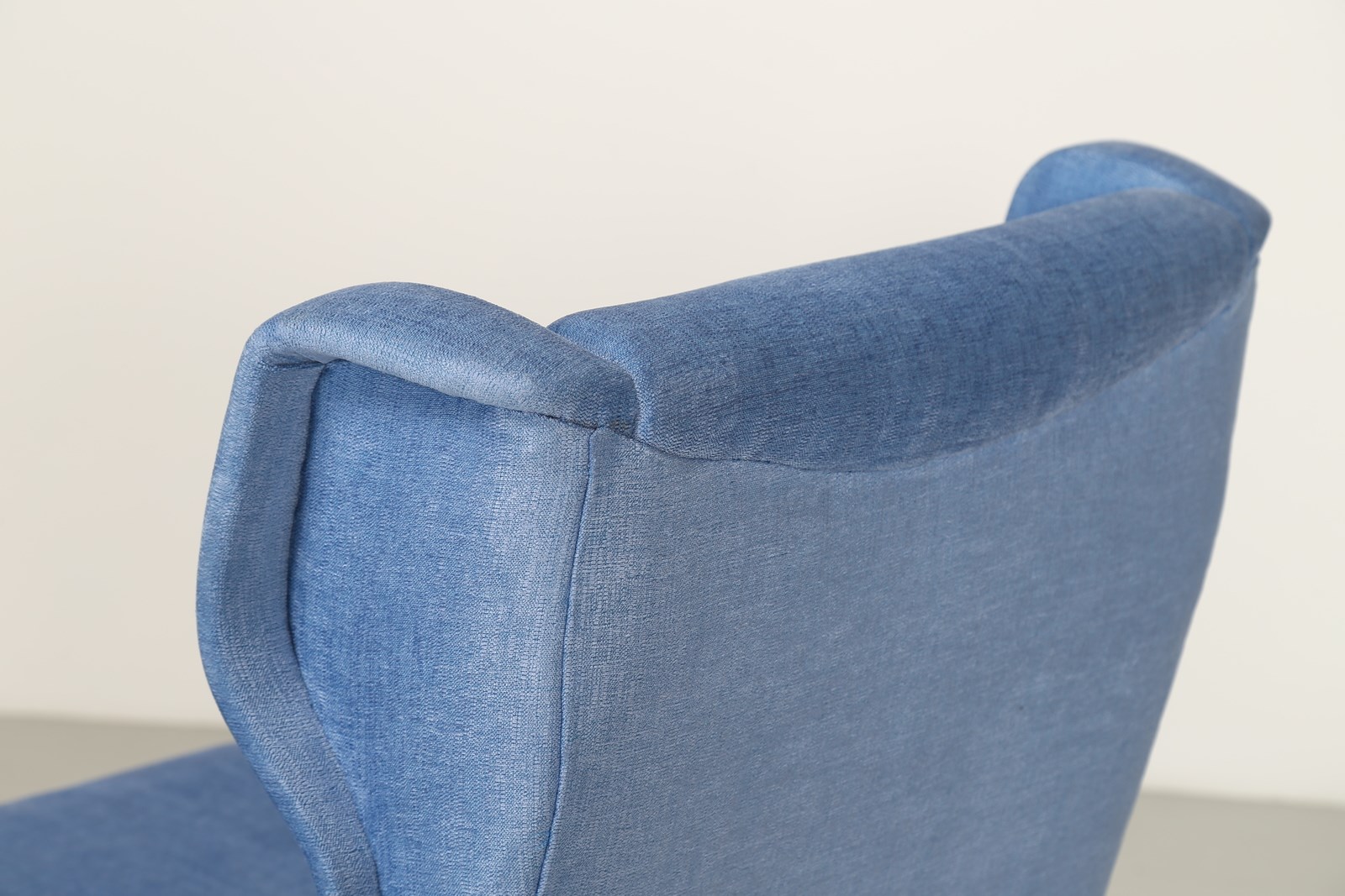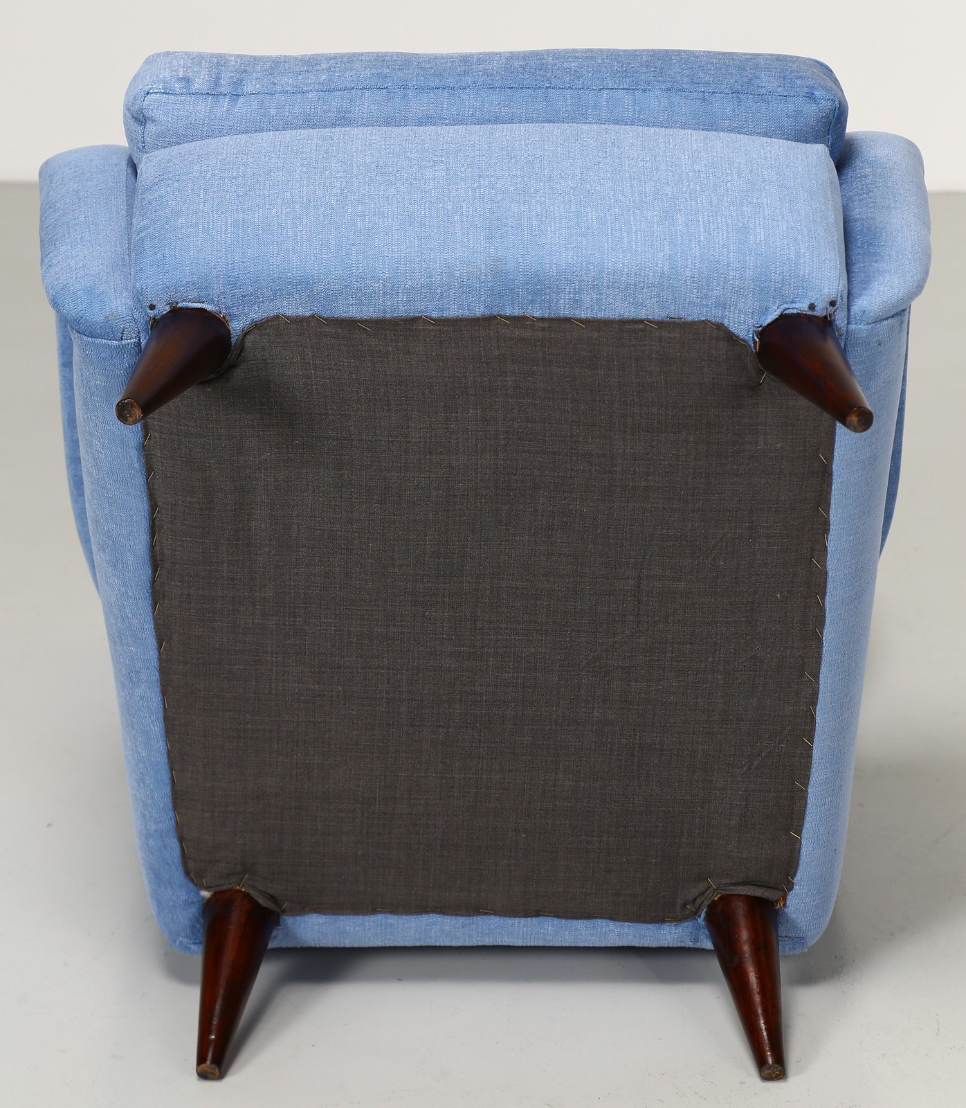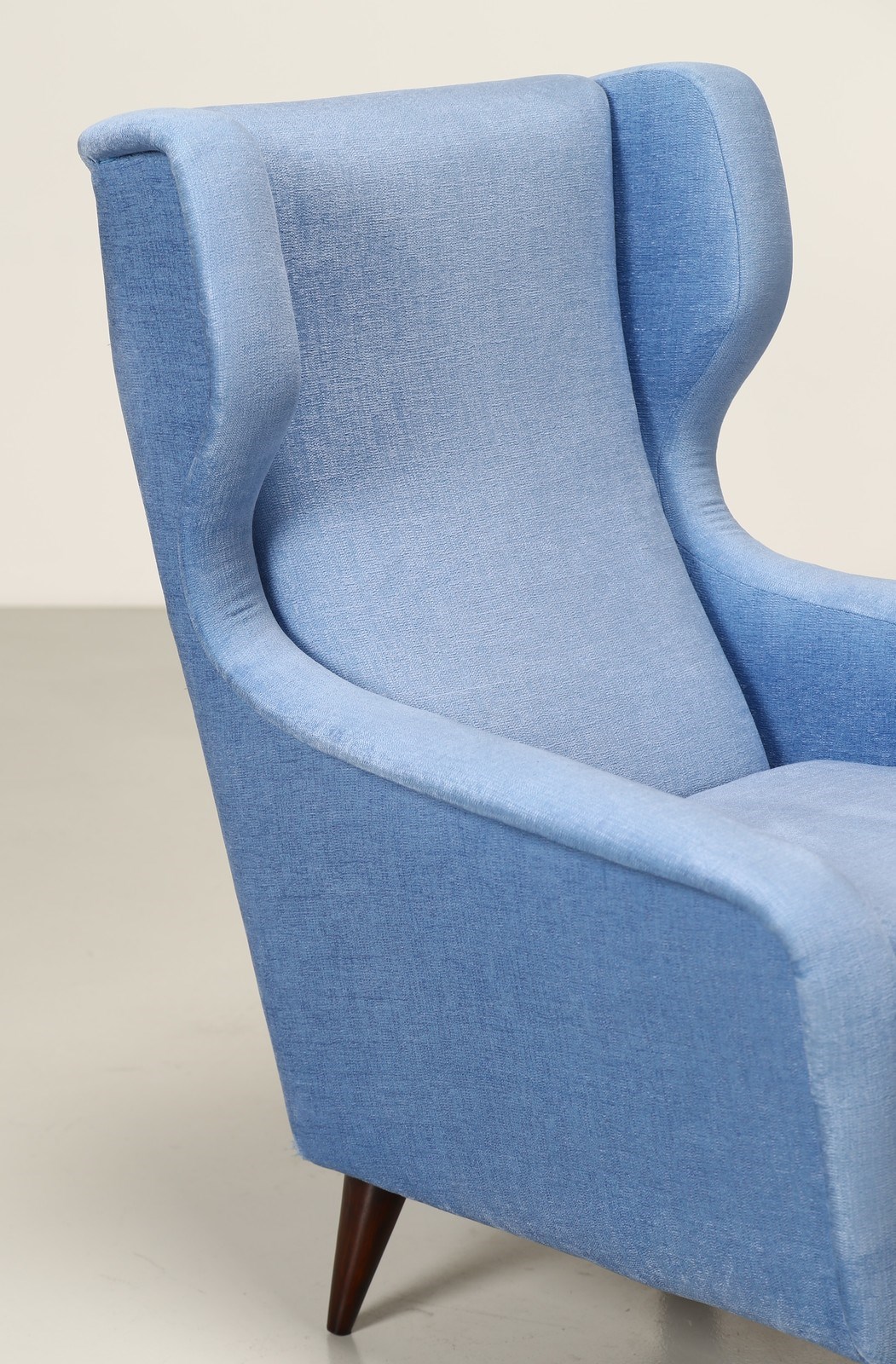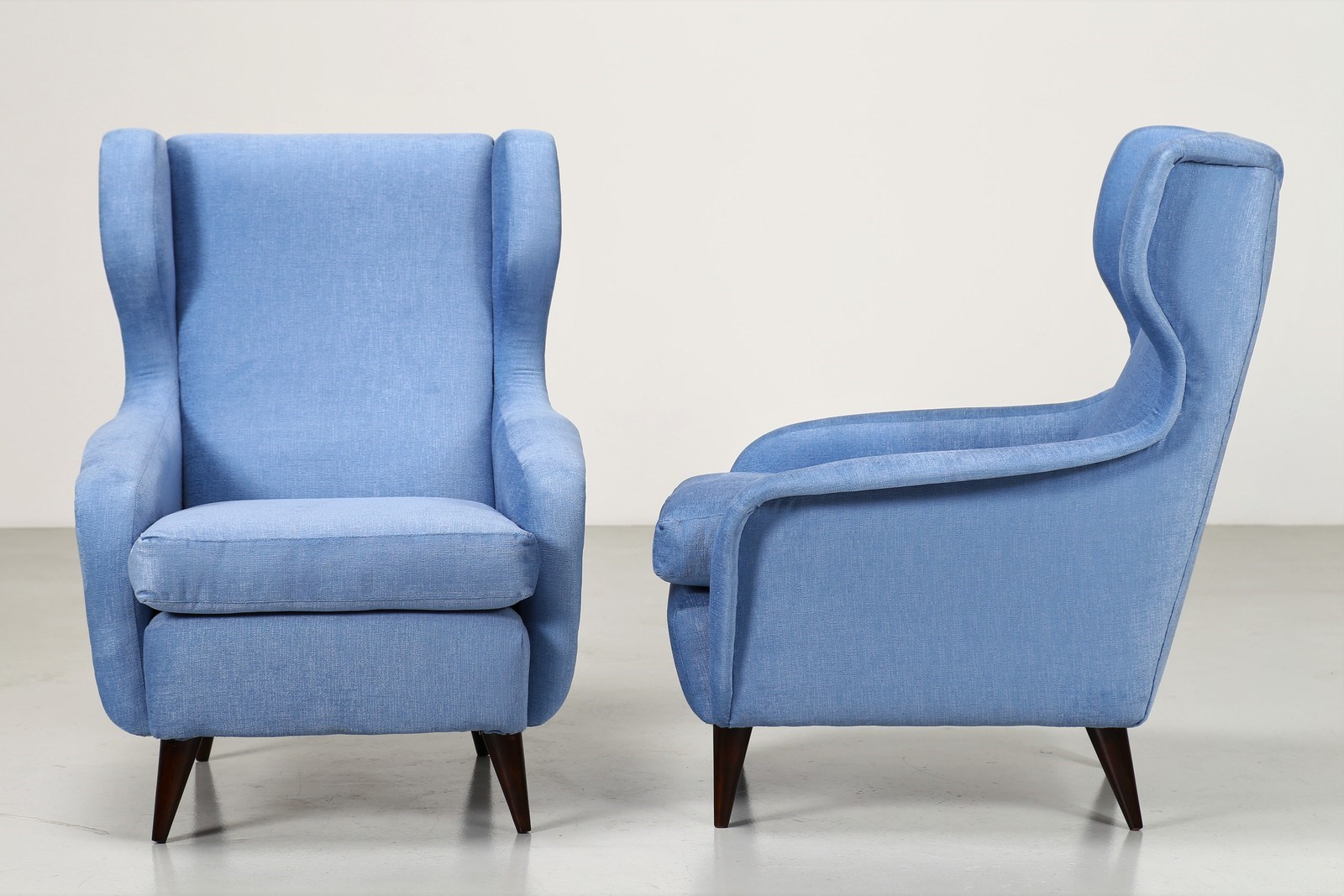 RENATO ANGELI Coppia di poltrone. Legno e tessuto. Cm 73,00 x 98,00 x 88,00. Coppia di poltrone con struttura in legno e rivestimento in tessuto, anni 50.