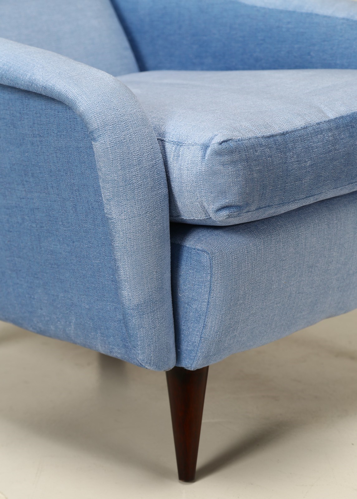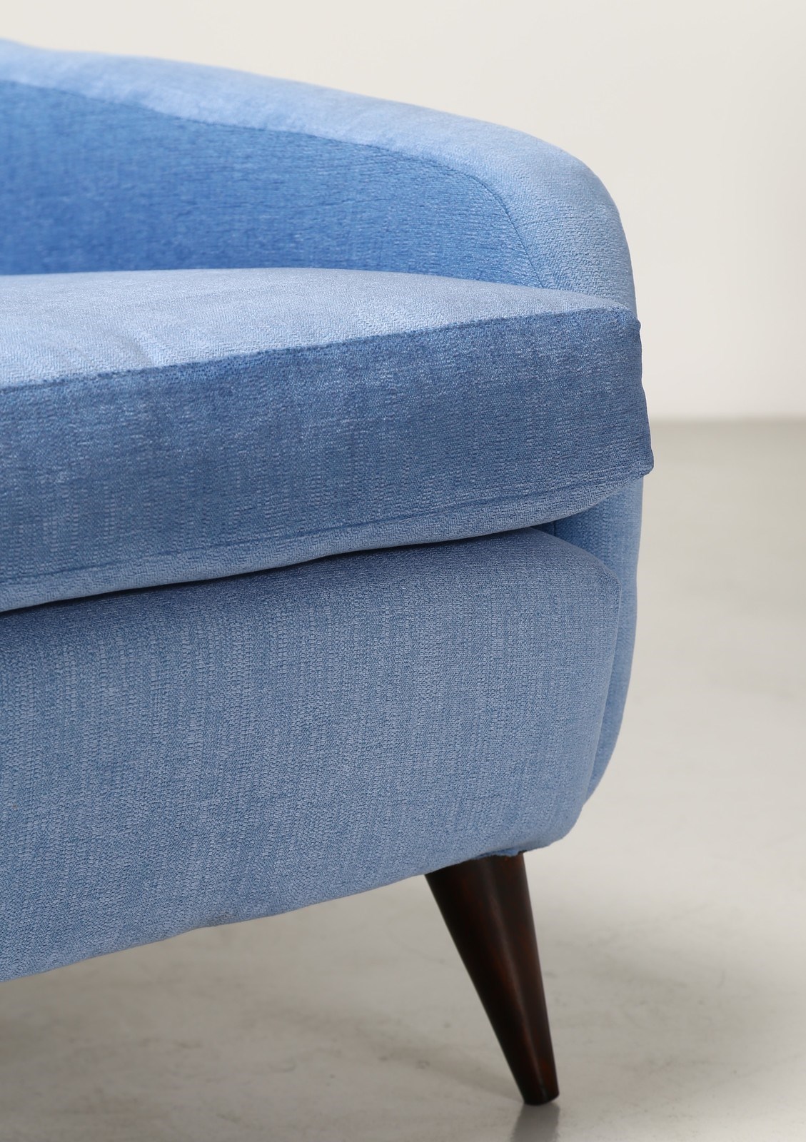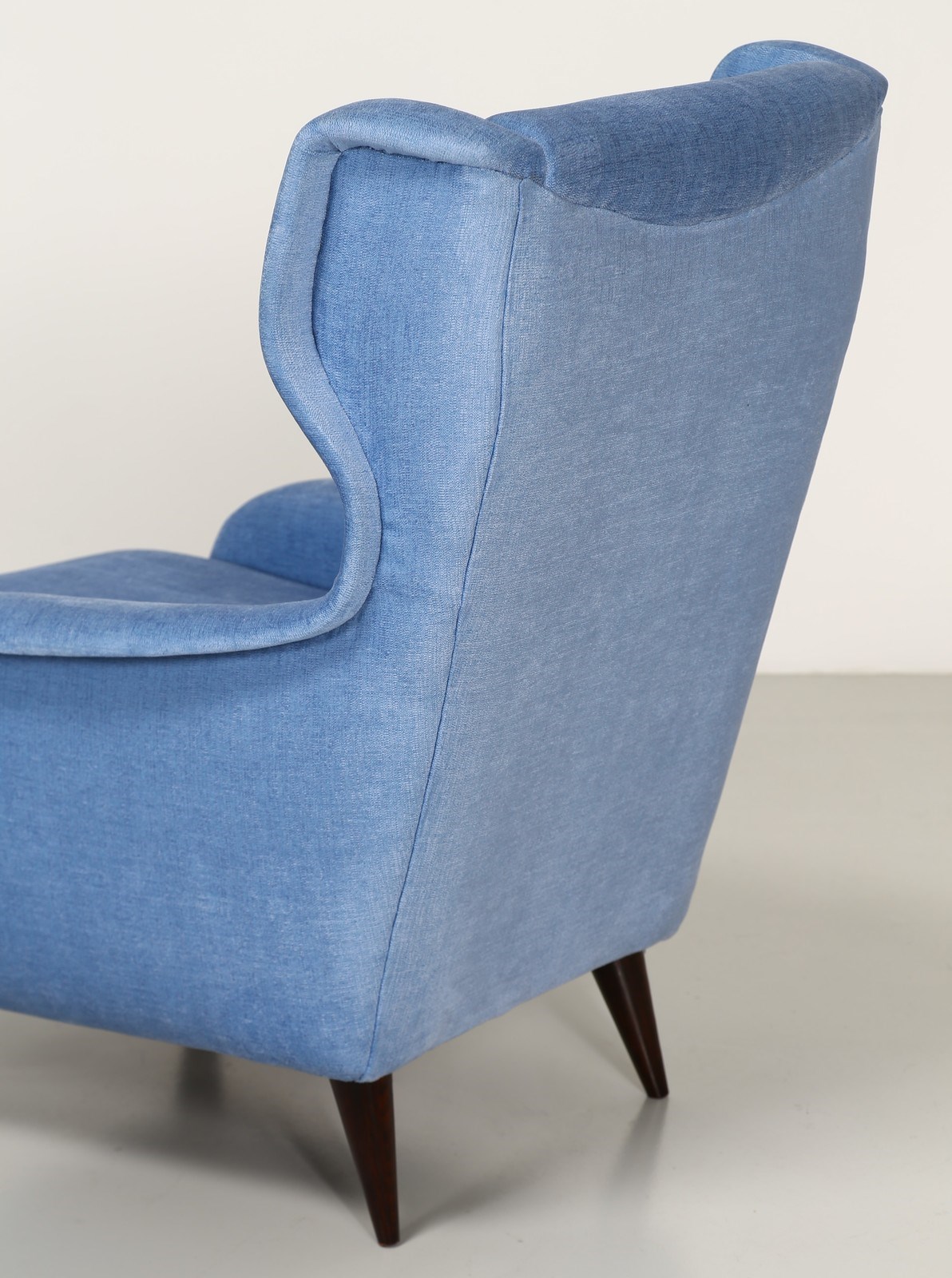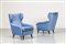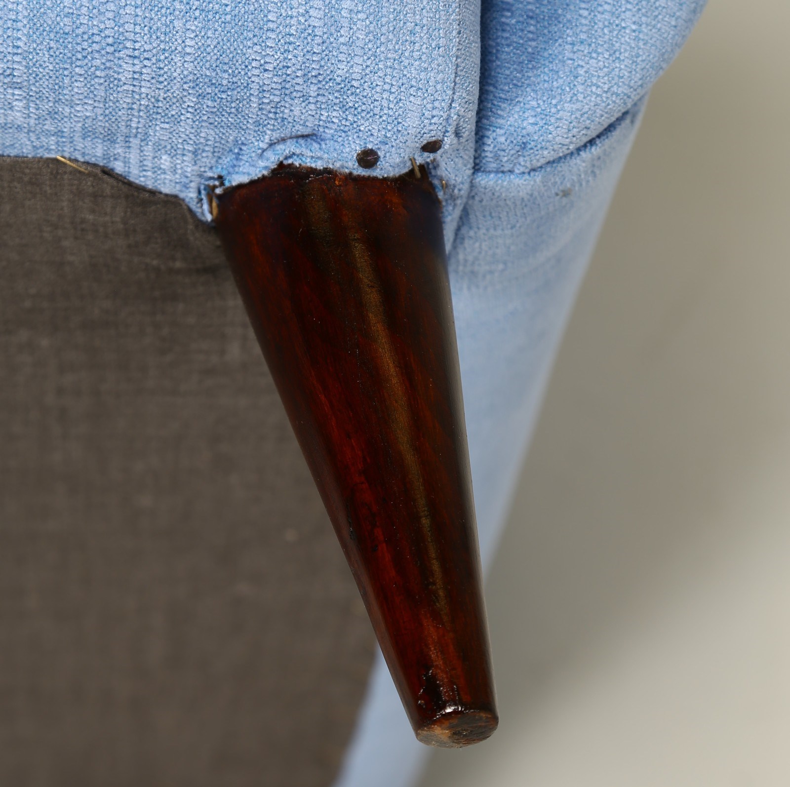 RENATO ANGELI Coppia di poltrone. Legno e tessuto. Cm 73,00 x 98,00 x 88,00. Coppia di poltrone con struttura in legno e rivestimento in tessuto, anni 50.