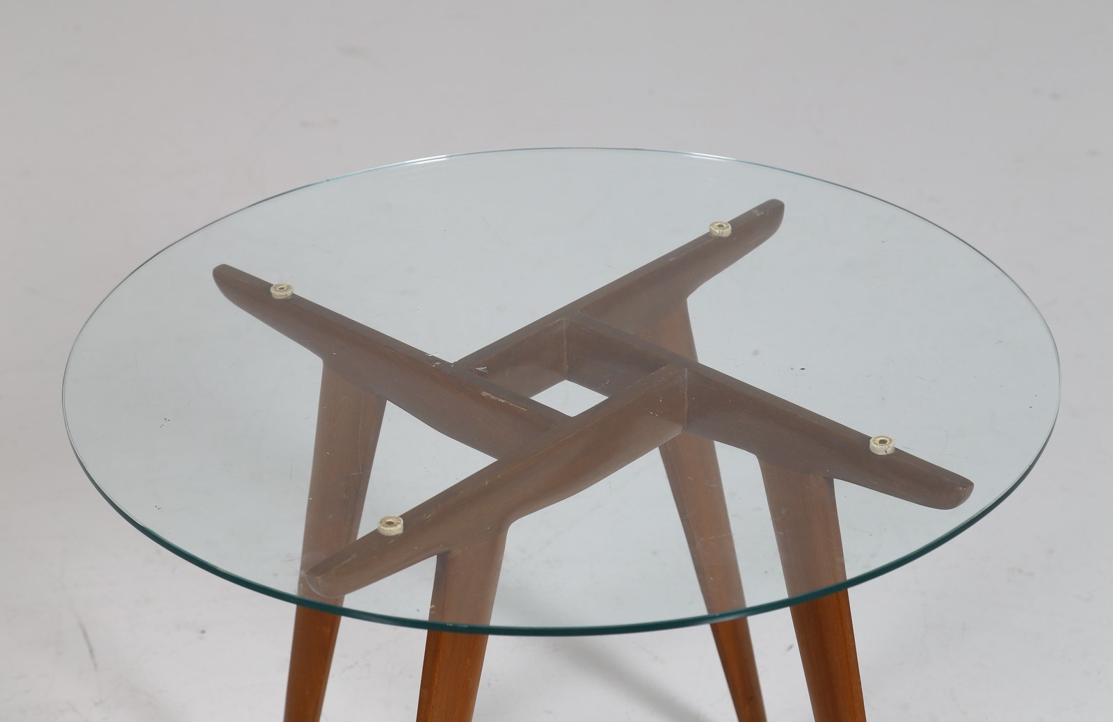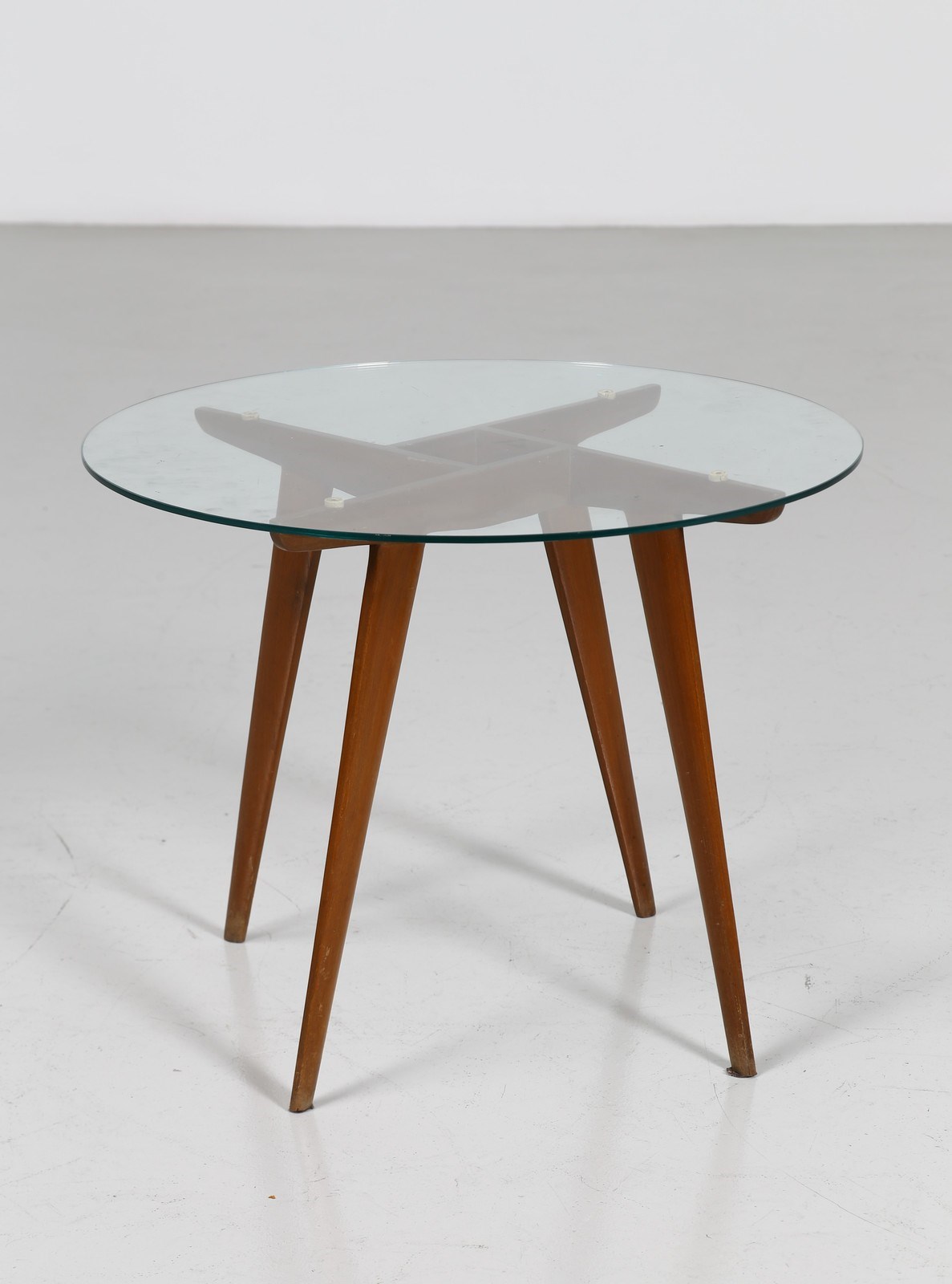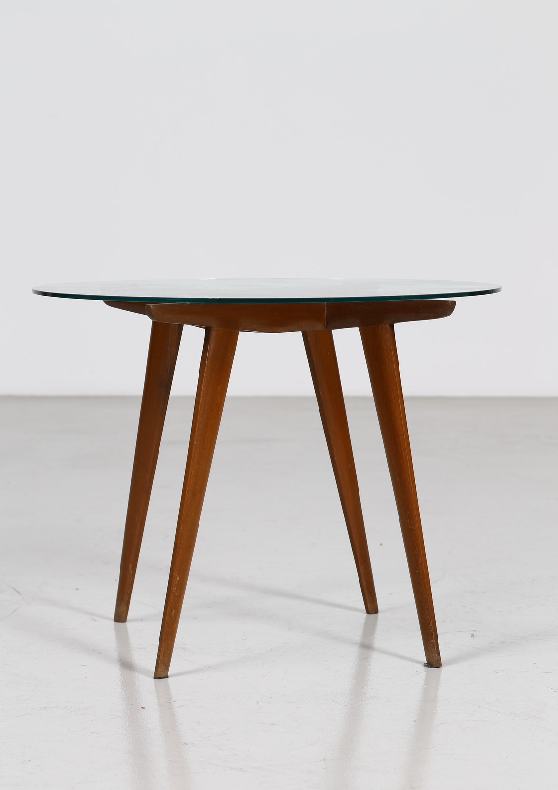 PONTI GIO (1891 - 1979) Tavolino. Legno e vetro. Cm 59,50 x 46,00 x 59,50. Tavolino da caffè in legno con piano in vetro, per Dassi, anni 50. Pubblicazioni: Domus, n. 317, aprile 1956, pubblicità mobili Dassi