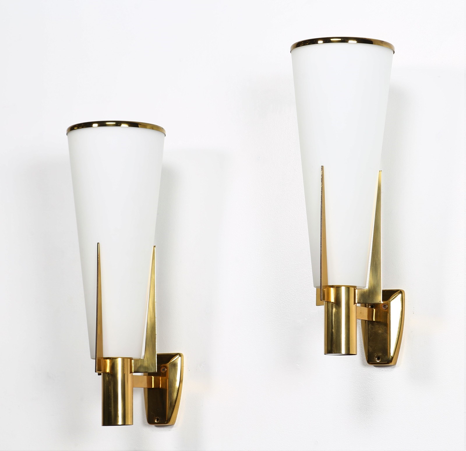 STILNOVO Coppia di applique. Ottone, vetro satinato. Cm 25,00 x 49,00 x 18,00. Coppia di lampada da parete modello 2021/1, anni 60. Marchio Stilnovo presente. Base in ottone e diffusore in vetro satinato. Pubblicazioni: catalogo Stilnovo anni '60, p. 44