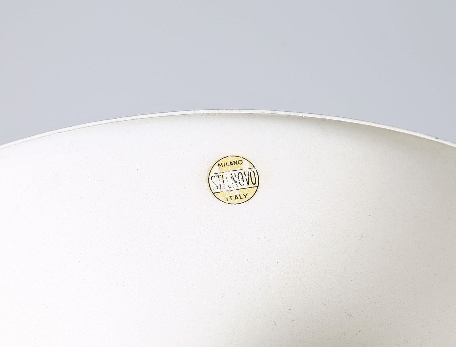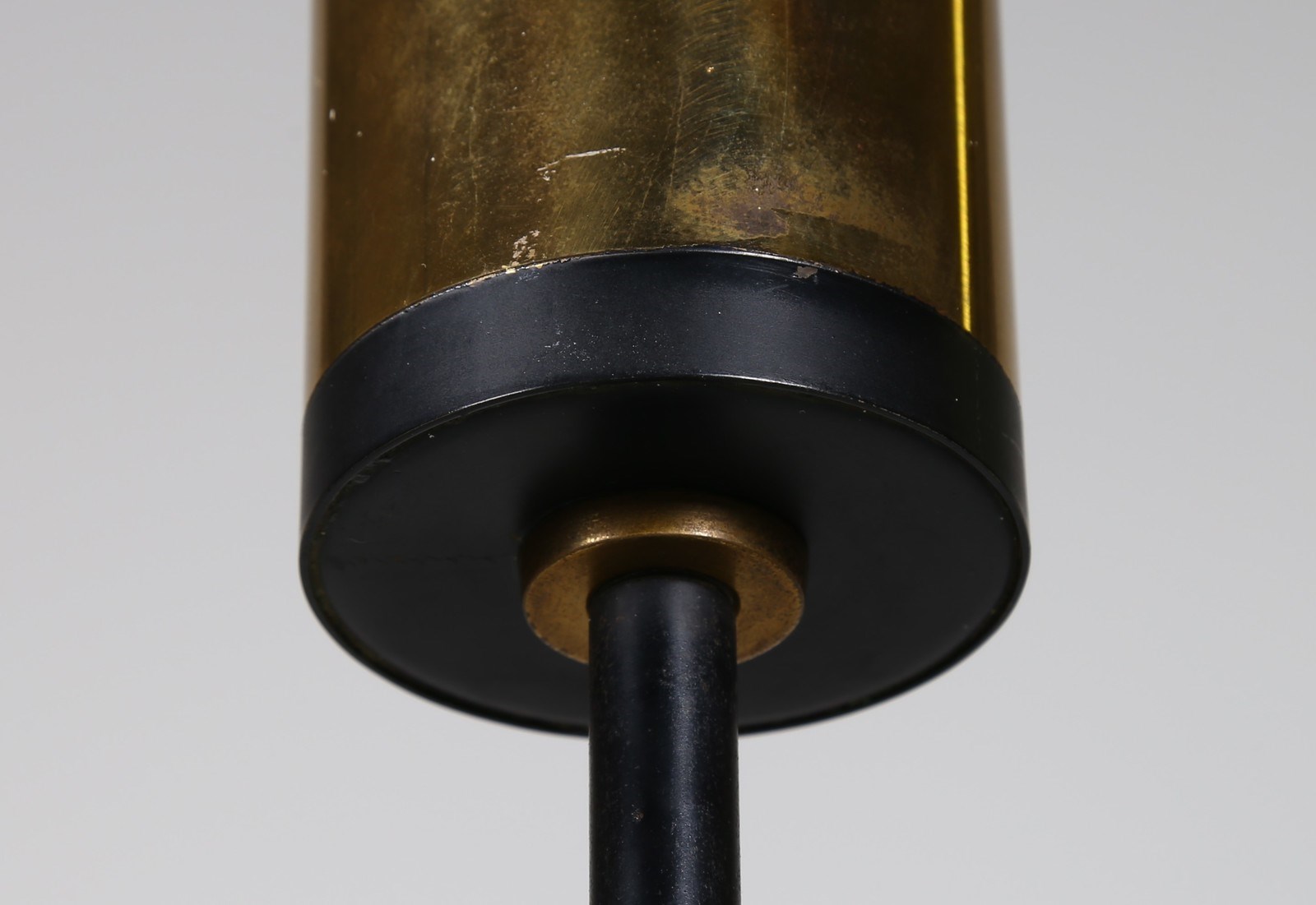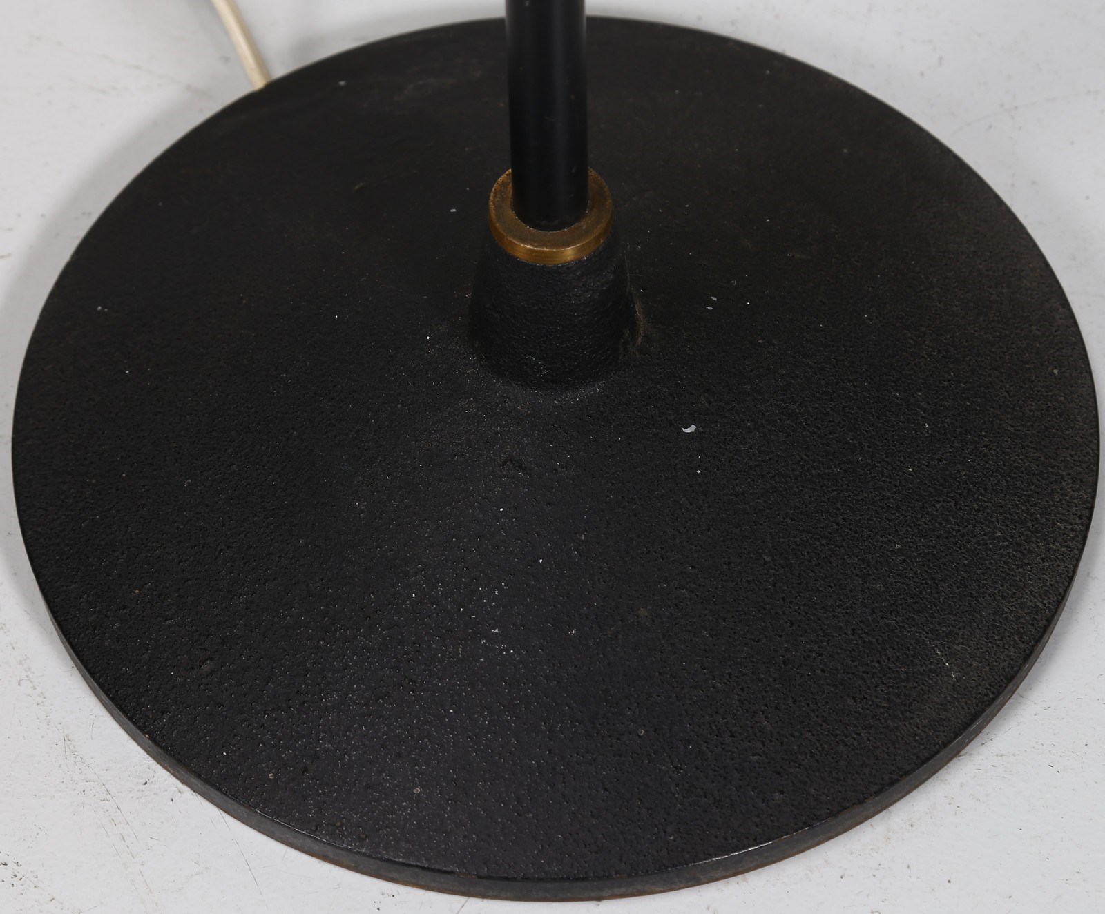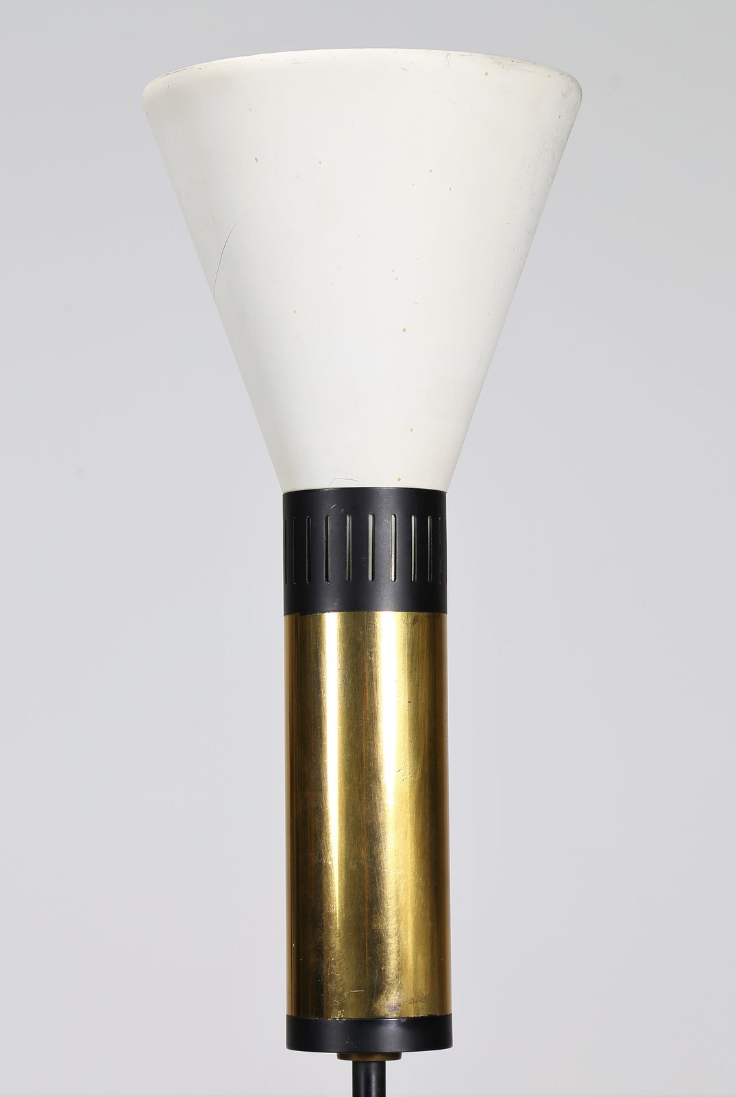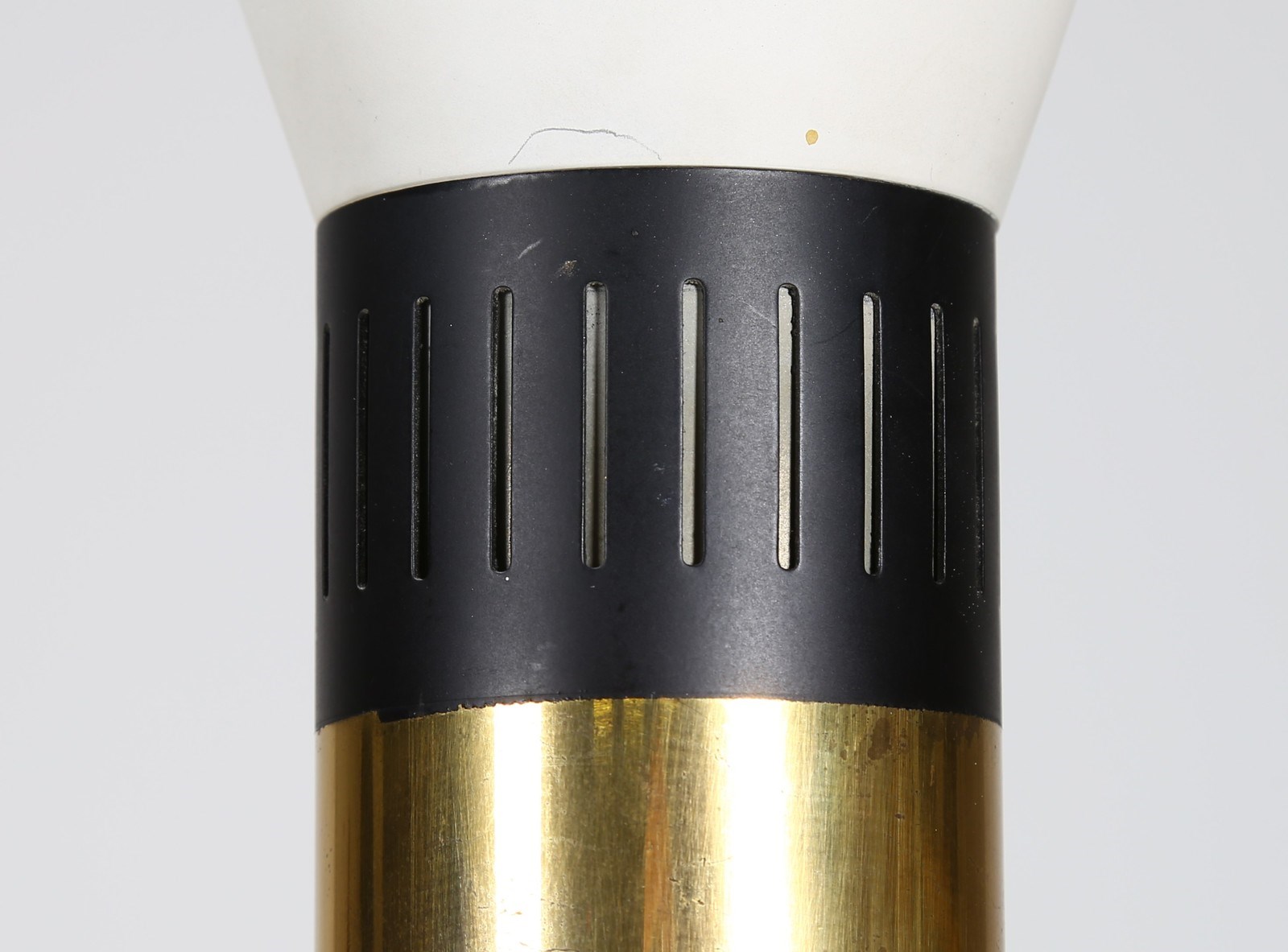 STILNOVO Lampada da terra. Metallo e ottone. Cm 26,00 x 191,00 x 26,00. Lampada da terra in metallo laccato nero, ottone e diffusore in metallo laccato bianco. Marchio Stilnovo presente all'interno del diffusore, Italia, anni 50.
