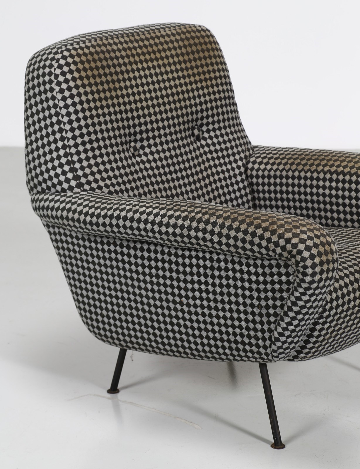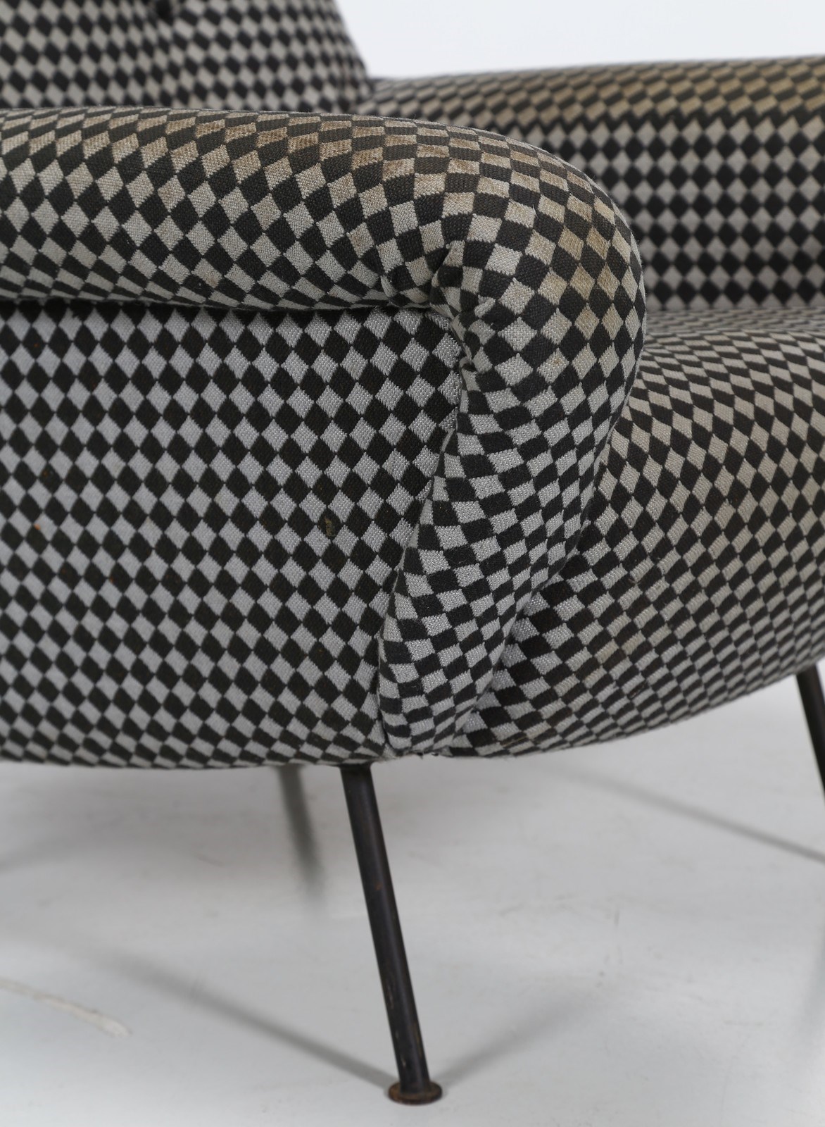 FRATTINI GIANFRANCO (1926 - 2004) Coppia di poltrone. Metallo e tessuto. Cm 84,00 x 87,00 x 88,00. Coppia di poltrone mod. 830, produzione Cassina, 1955. Base in metallo laccato, intelaiatura in legno e rivestimento in tessuto. Pubblicazioni; Domus, n. 317, aprile 1956, p. 22; G. Gramigna, Repertorio del Design italiano 1950 - 2000, Milano 2003, Vol I, p. 41.