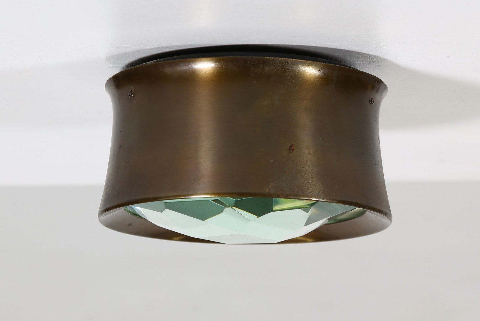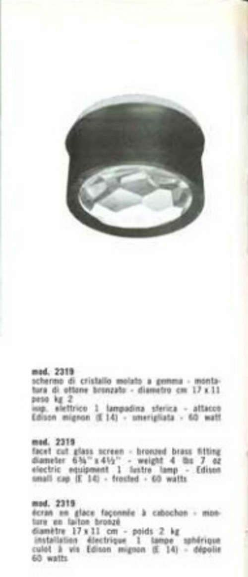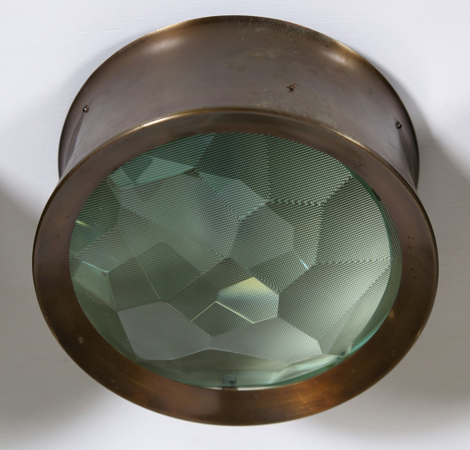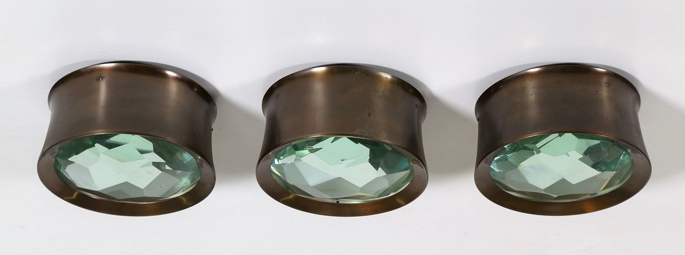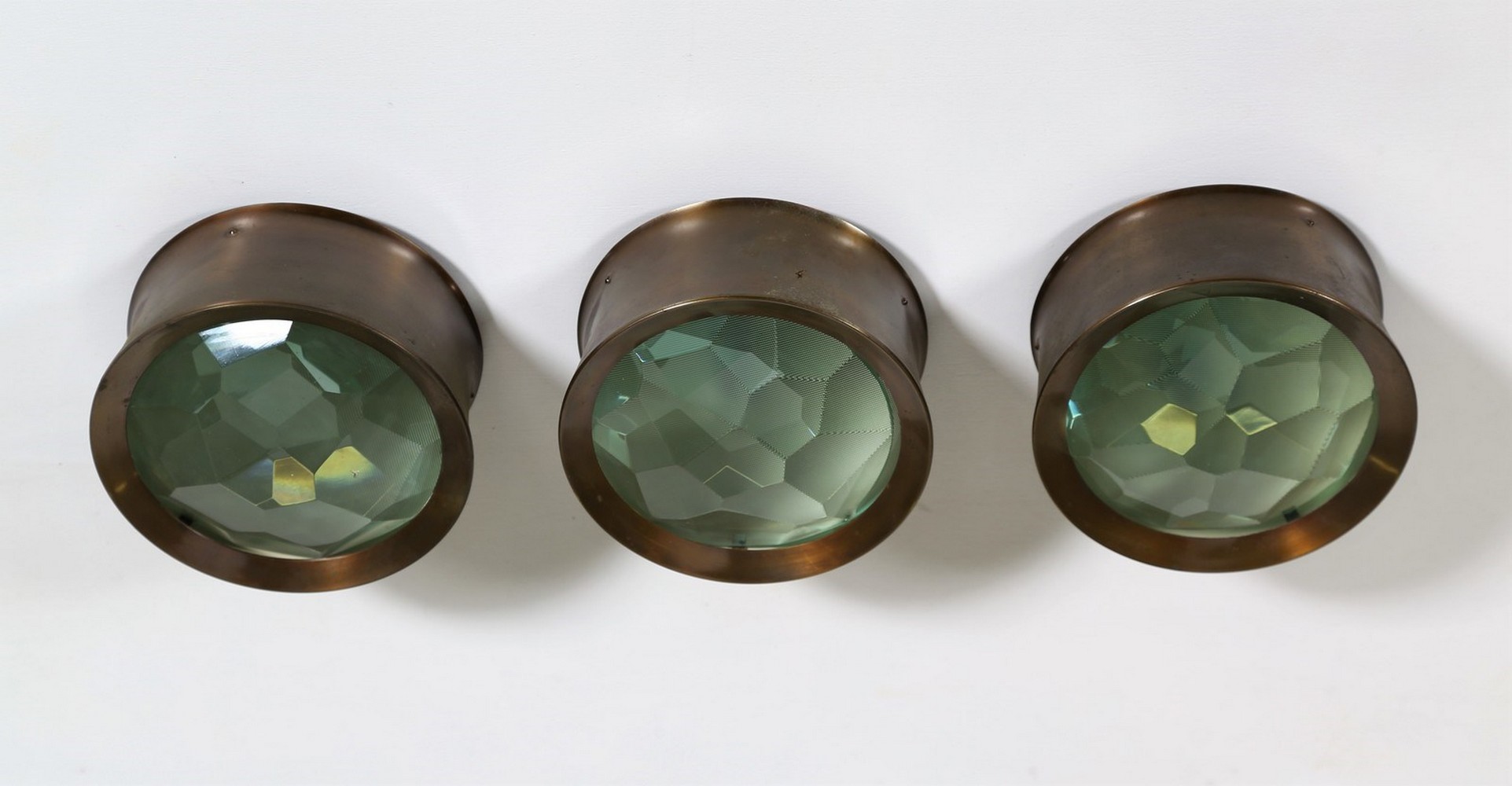 INGRAND MAX (1908 - 1969) Tre applique. Ottone e vetro. Cm 16,50 x 8,00 x 16,50. Tre applique mod. 2319, per Fontana Arte, anni 50 . Schermo di cristallo molato a gemma e montatura in ottone bronzato. Pubblicazioni: Quaderni di Fontana Arte n. 6, mod. 2319