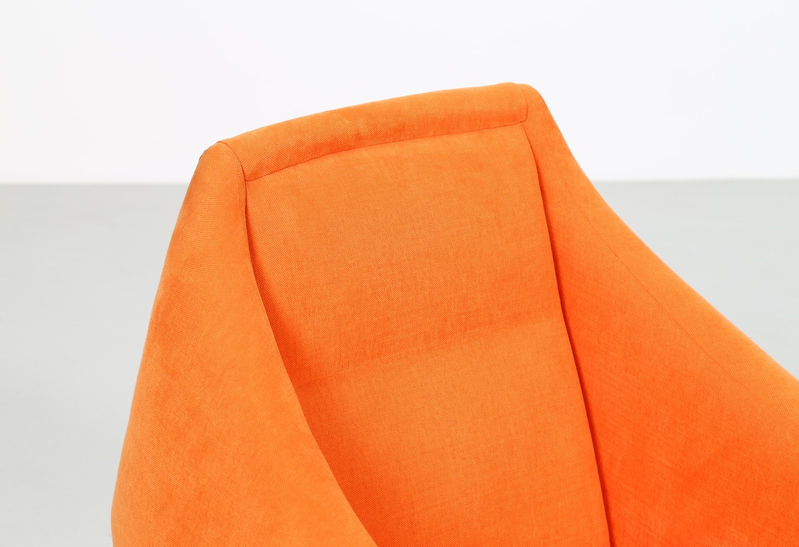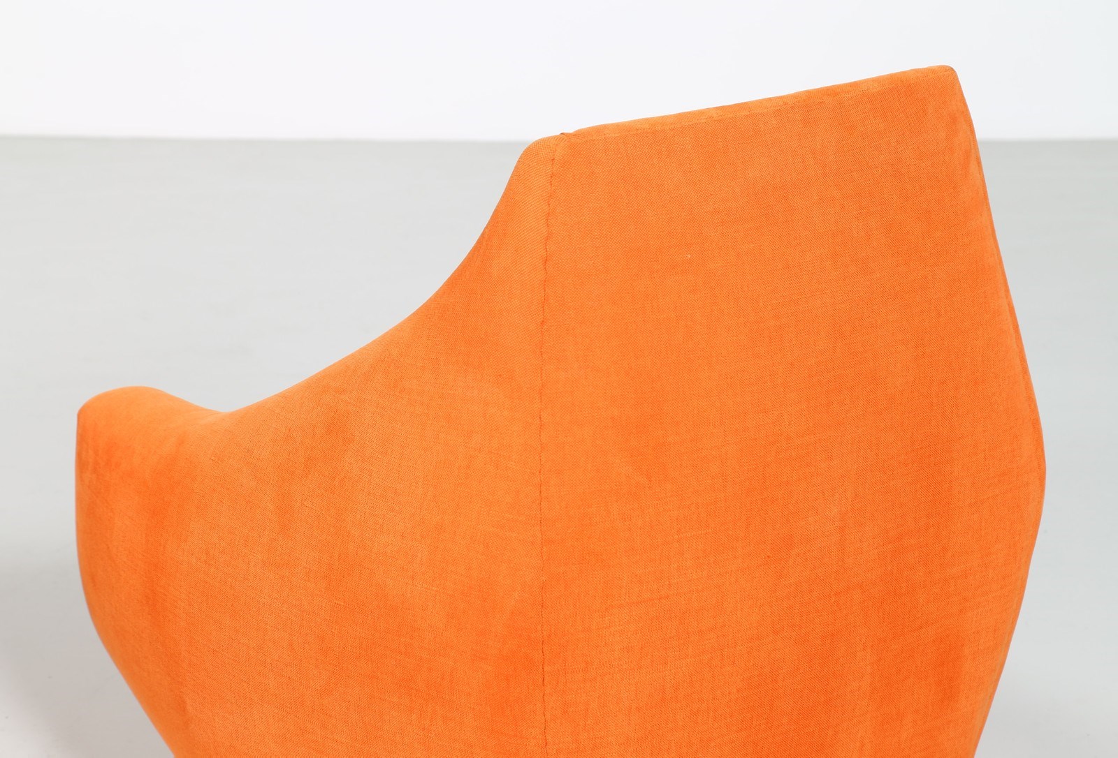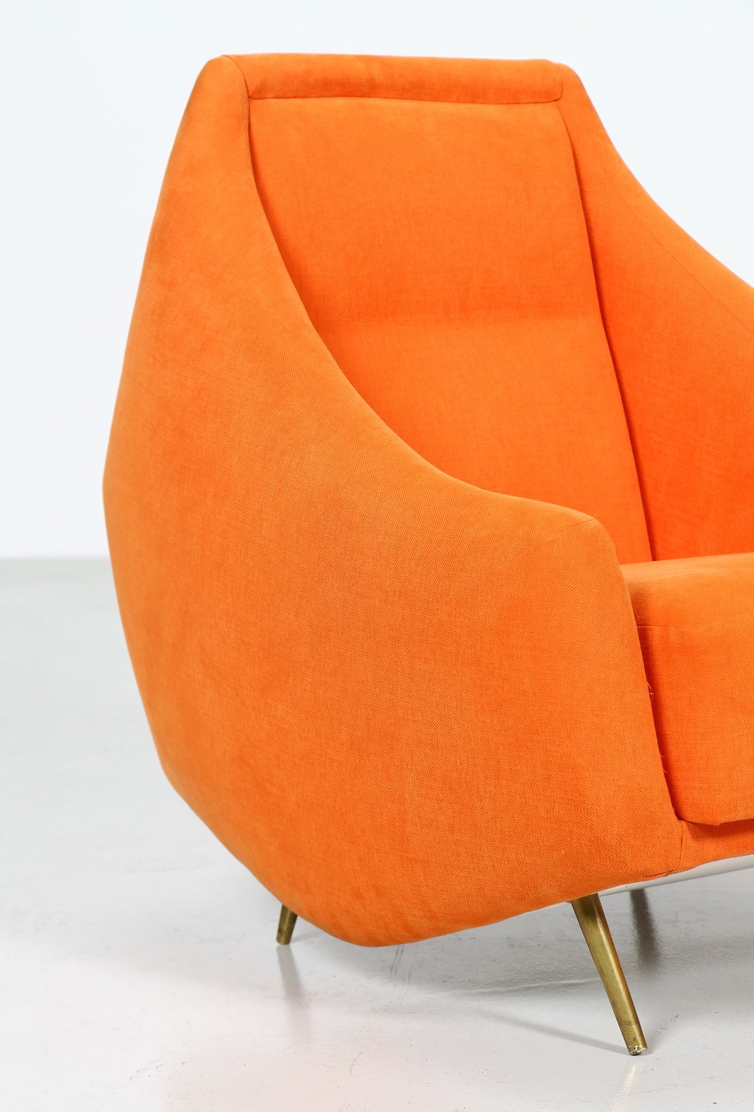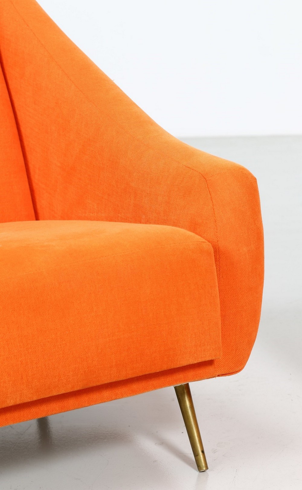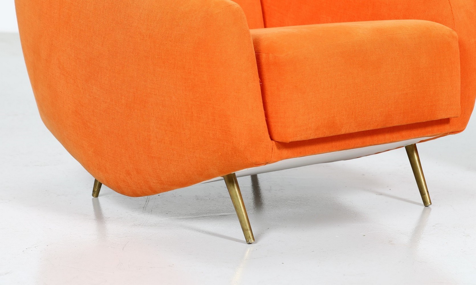 VERONESI GUGLIELMO (n. 1913) Coppia di poltrone. Tessuto e legno. Cm 80,00 x 90,00 x 75,00. Coppia di poltrone in tessuto, per Lenzi, 1954. Poltrone con fusto in pioppo, schienale con supporti in cinghie elastiche e imbottitura in gommapiuma Pirelli. Gambe coniche in metallo dorato, rivestimento esterno in tessuto.Pubblicazioni: Domus, n. 295, giugno 1954, p.8, pubblicità Lenzi - Domus, n.298, settembre 1954, pubblicità Lenzi - Antonella Giorgio, Stefania Morganti, Un divano, due poltrone e qualcos'altro, la produzione del mobile di quarrata e dintorni dal 1920 al 1996, NTE, 1998, p. 65
