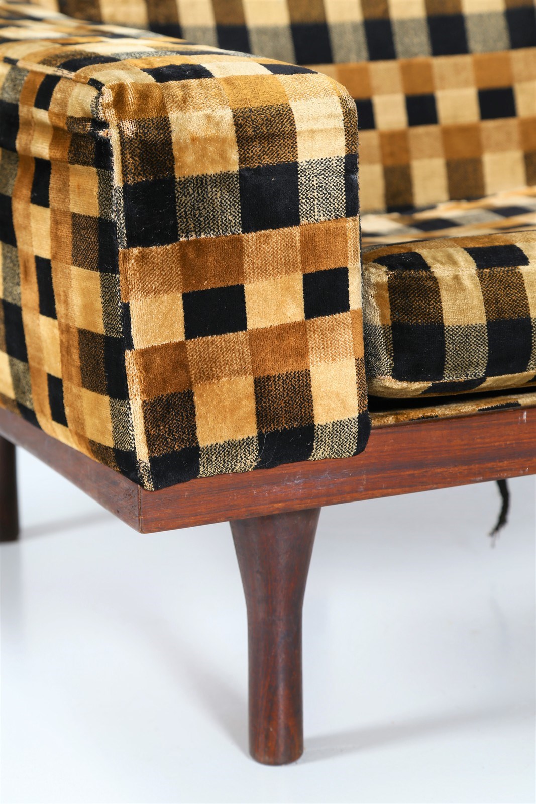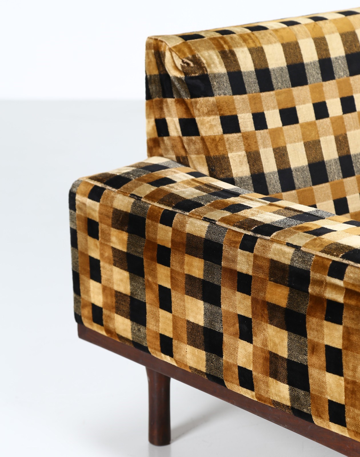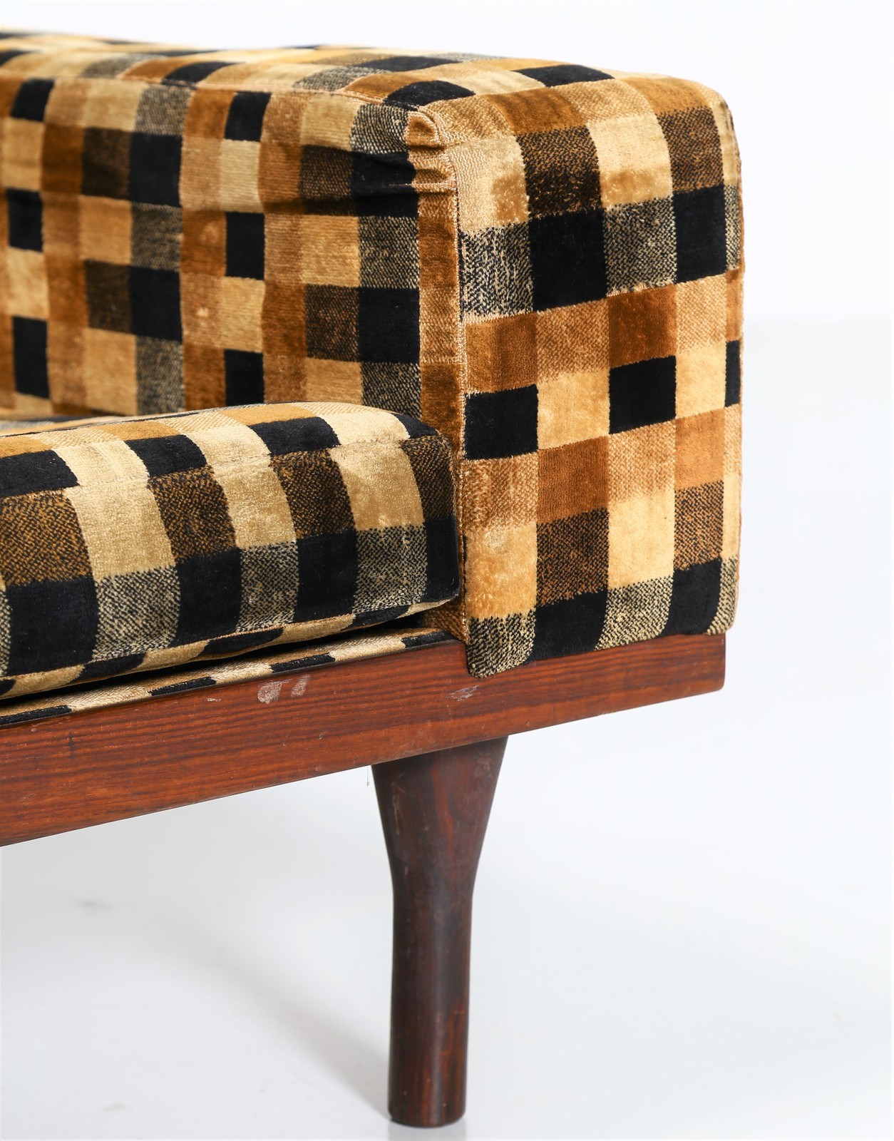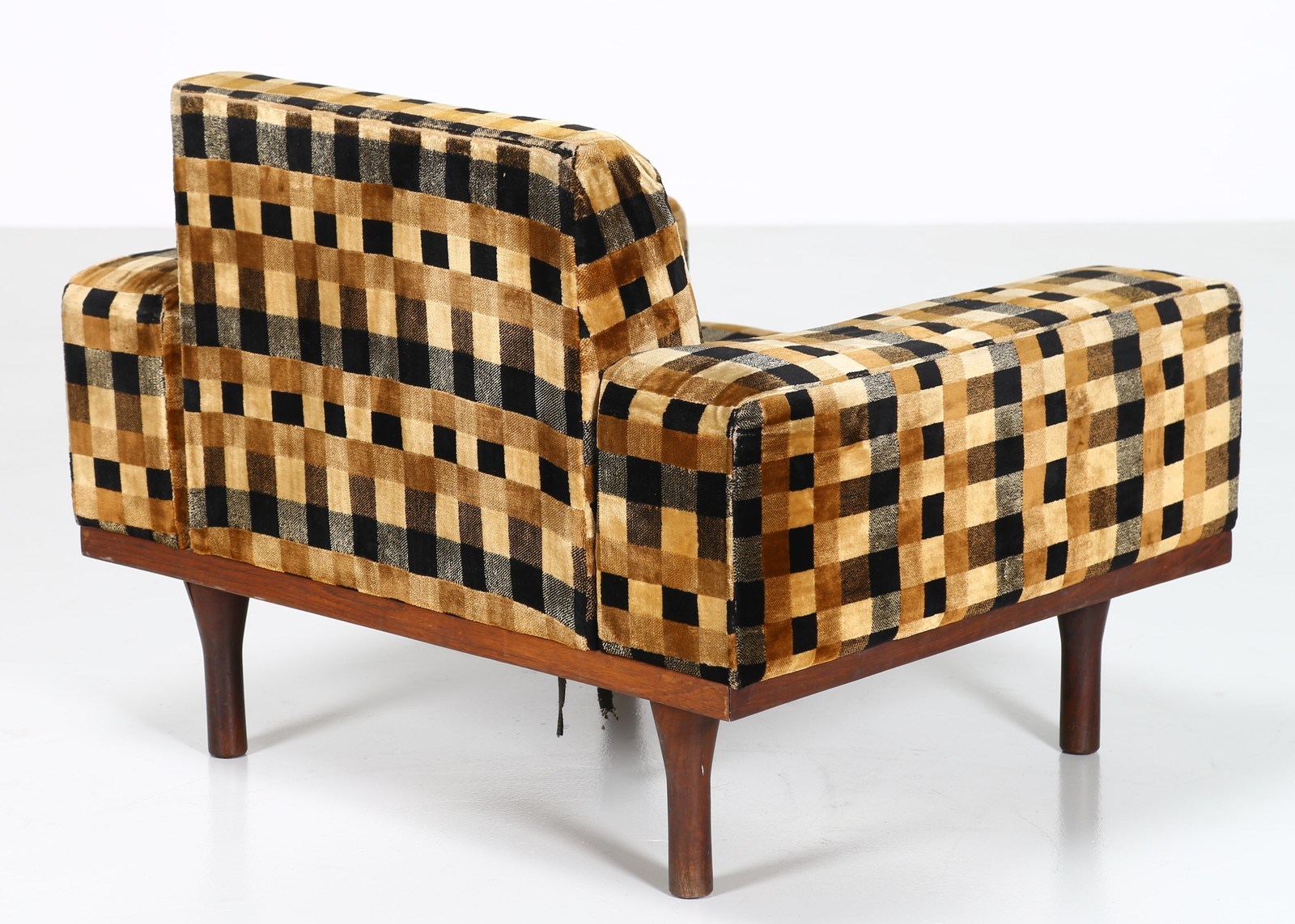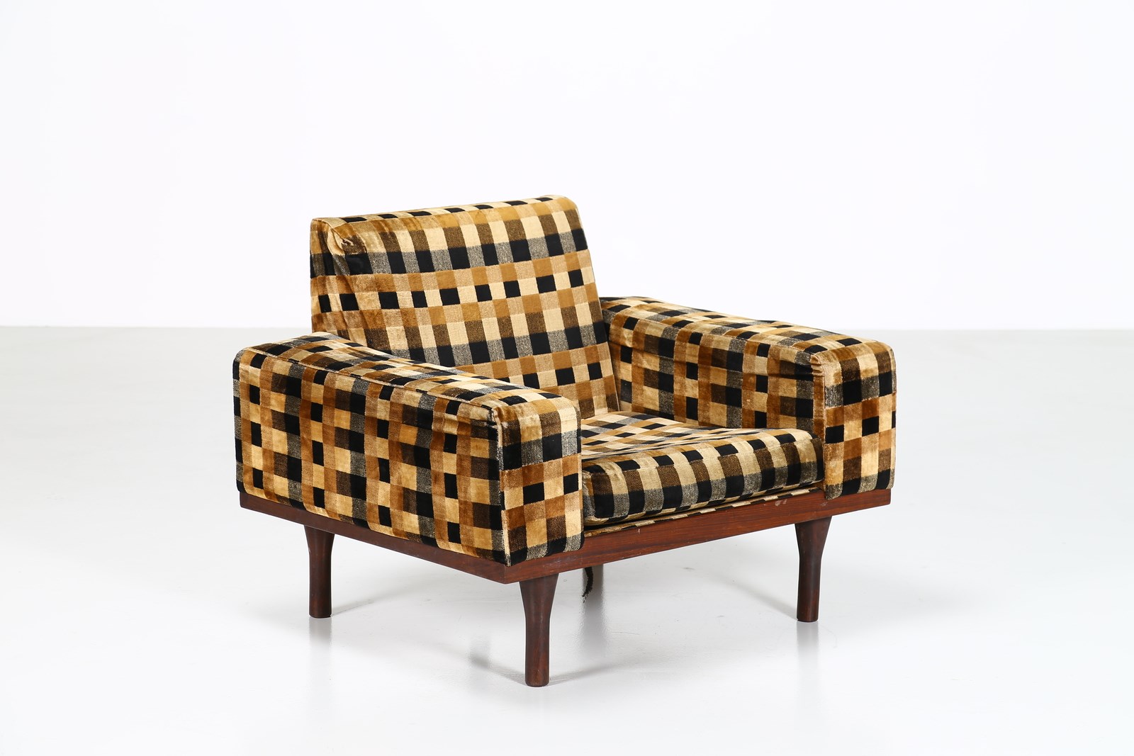 MANGIAROTTI ANGELO (n. 1921) Poltrona. Legno di palissandro e tessuto. Cm 91,00 x 70,00 x 75,00. Importante poltrona con intelaiatura in legno di palissandro, imbottitura e tessuto originale anni 60.