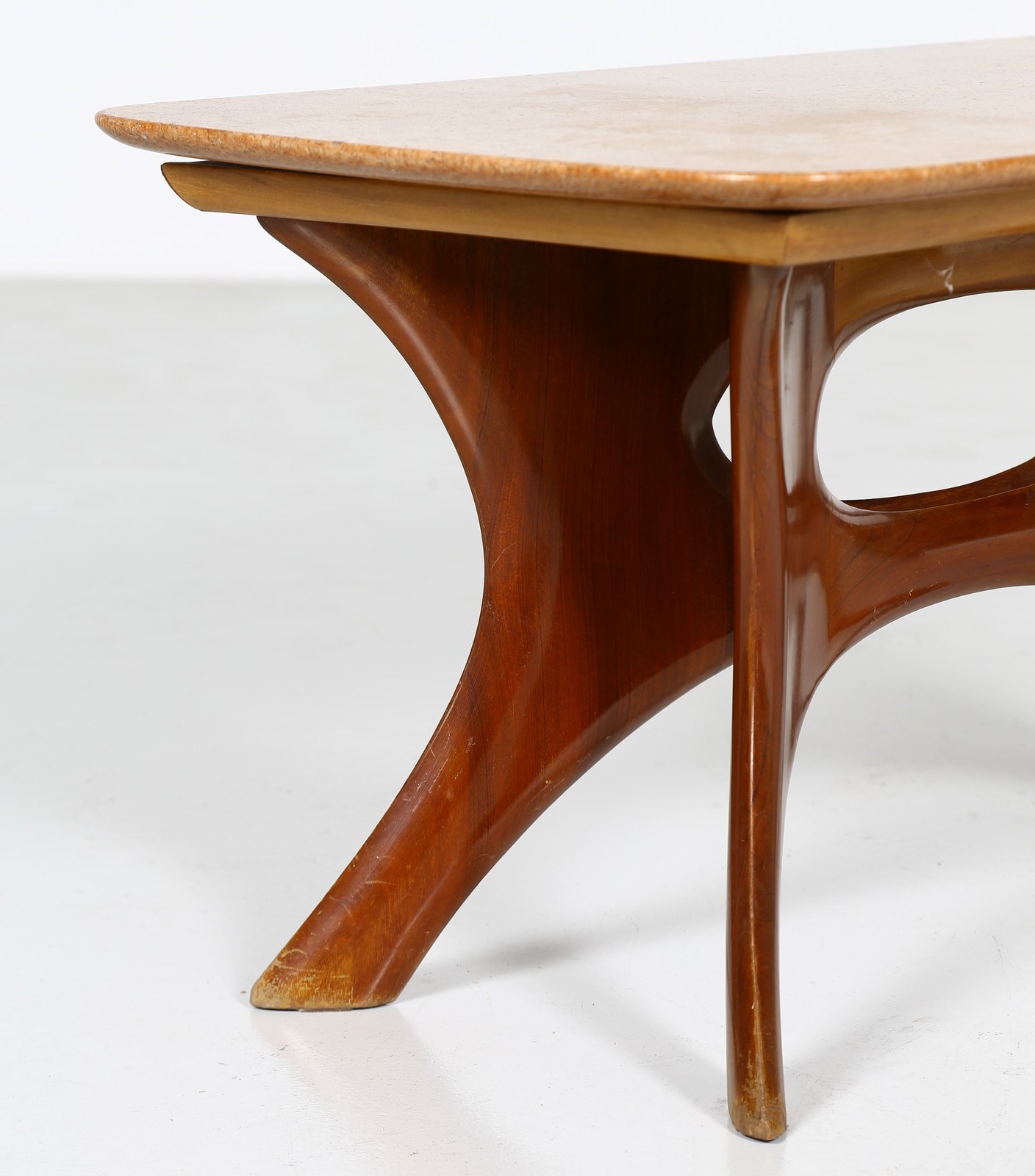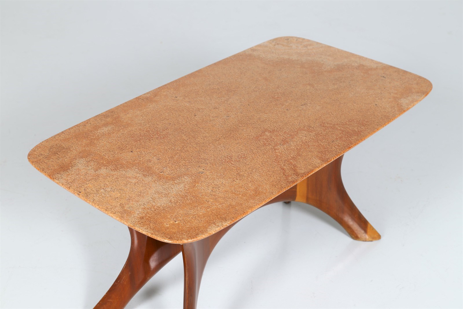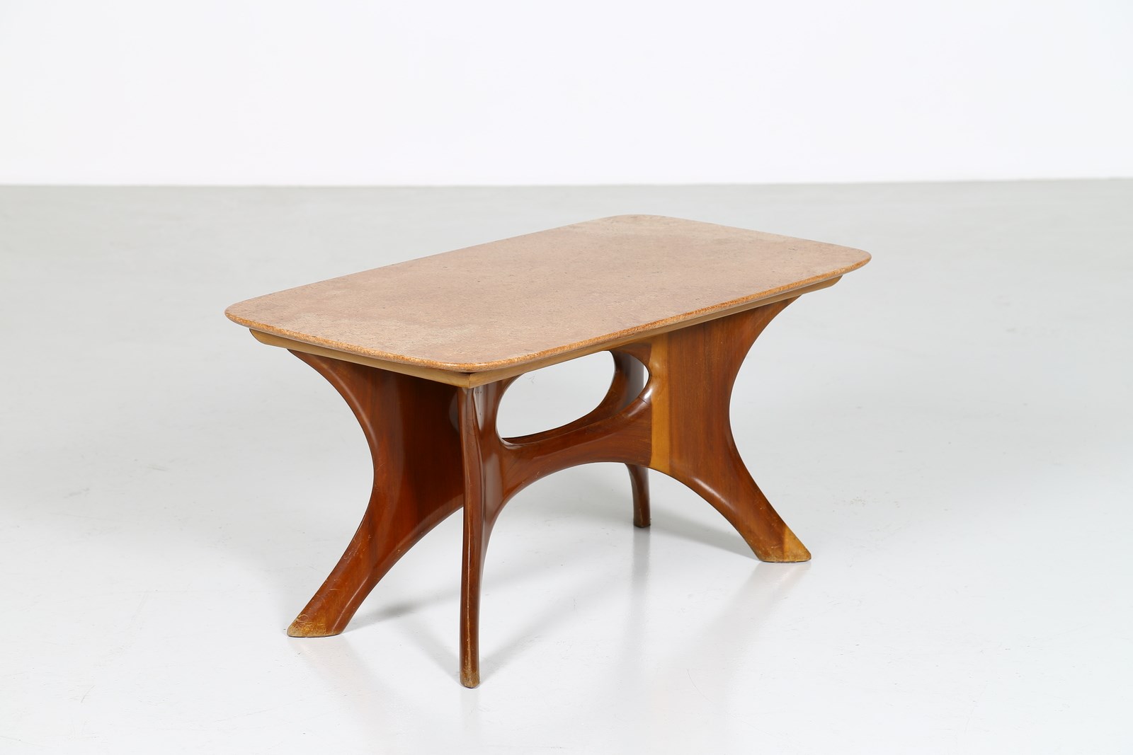 PARISI ICO (1916 - 1996) Attrib. Tavolo . Legno e marmo. Cm 92,50 x 47,00 x 52,50. Tavolino in legno con piano in marmo occhio di pernice, anni 40.