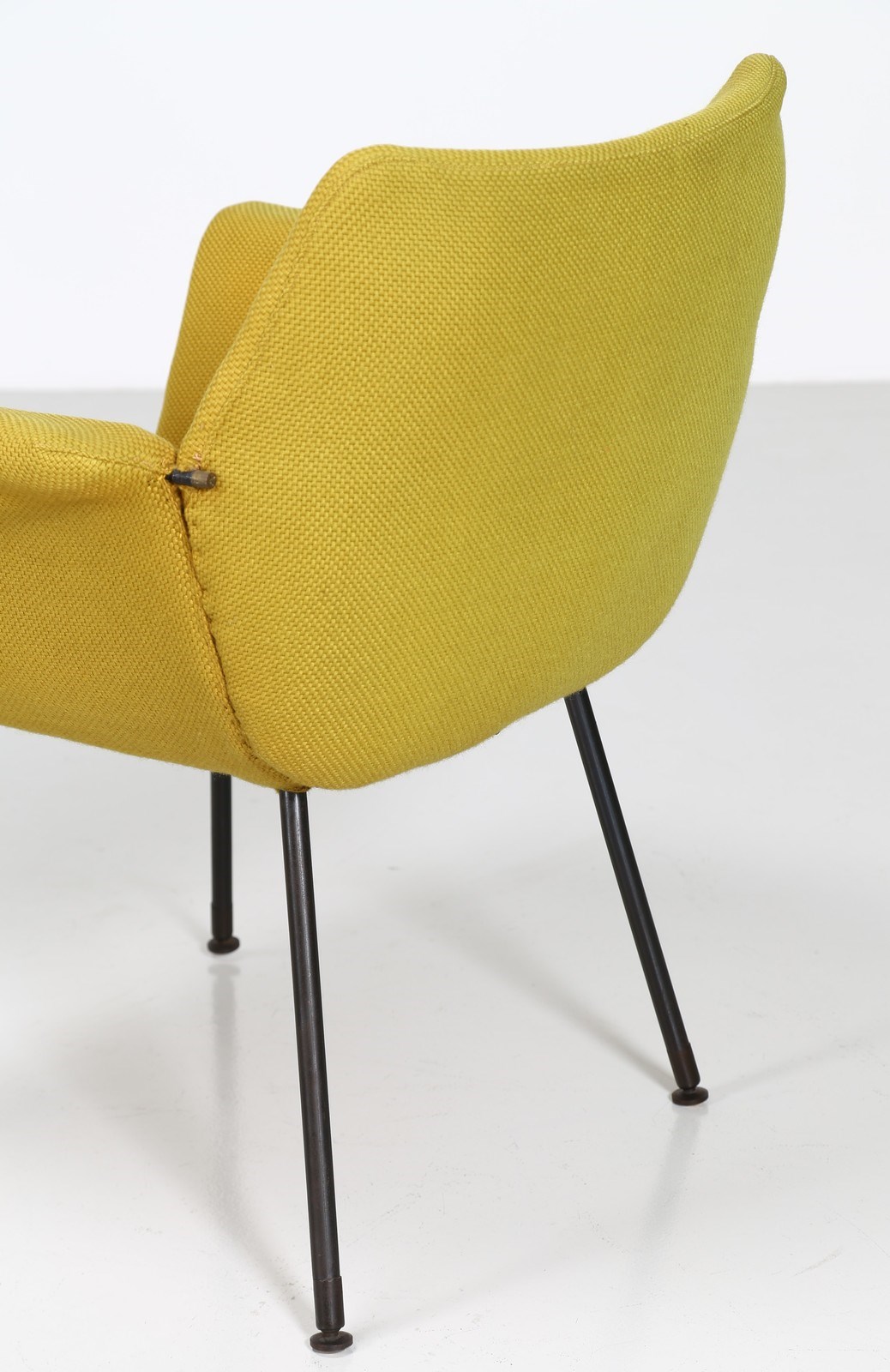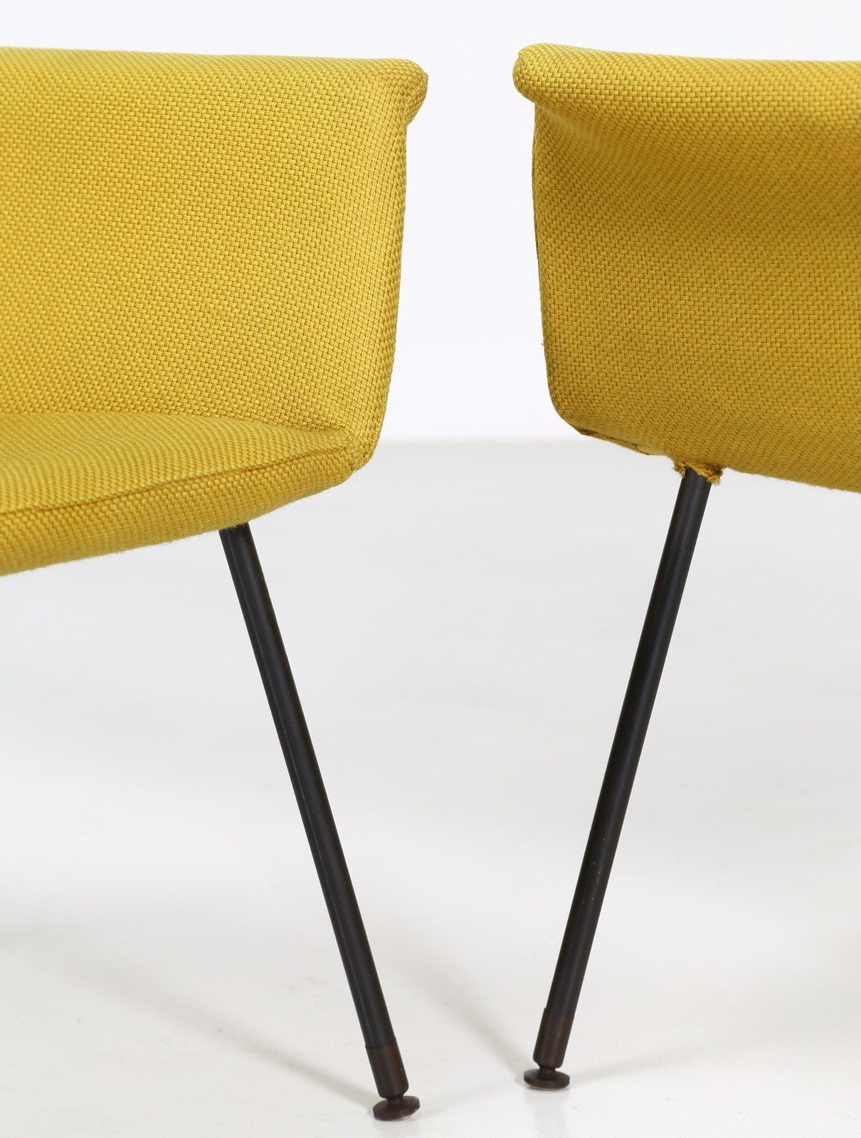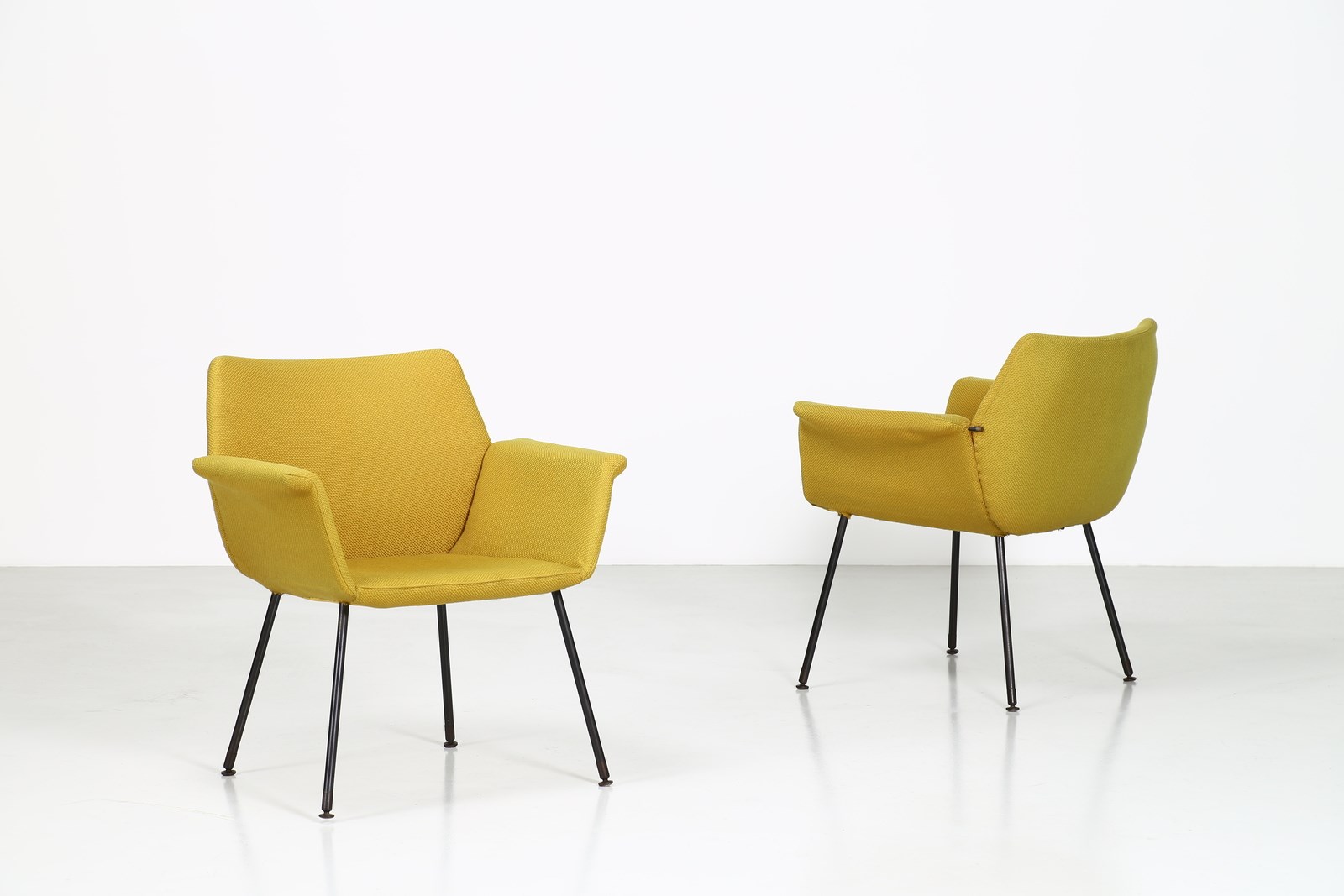BOZZI AUGUSTO (1924 - 1982) Coppia di poltroncine. Metallo laccato, tessuto e ottone. Cm 72,00 x 77,00 x 57,00. Coppia di poltroncine in tubolare metallico e tessuto, per Saporiti Italia, anni 60. Pubblicazioni per modelli simili: Domus, n. 324, novembre 1956, p. 38 - Domus, n. 400, marzo 1963, p. 11