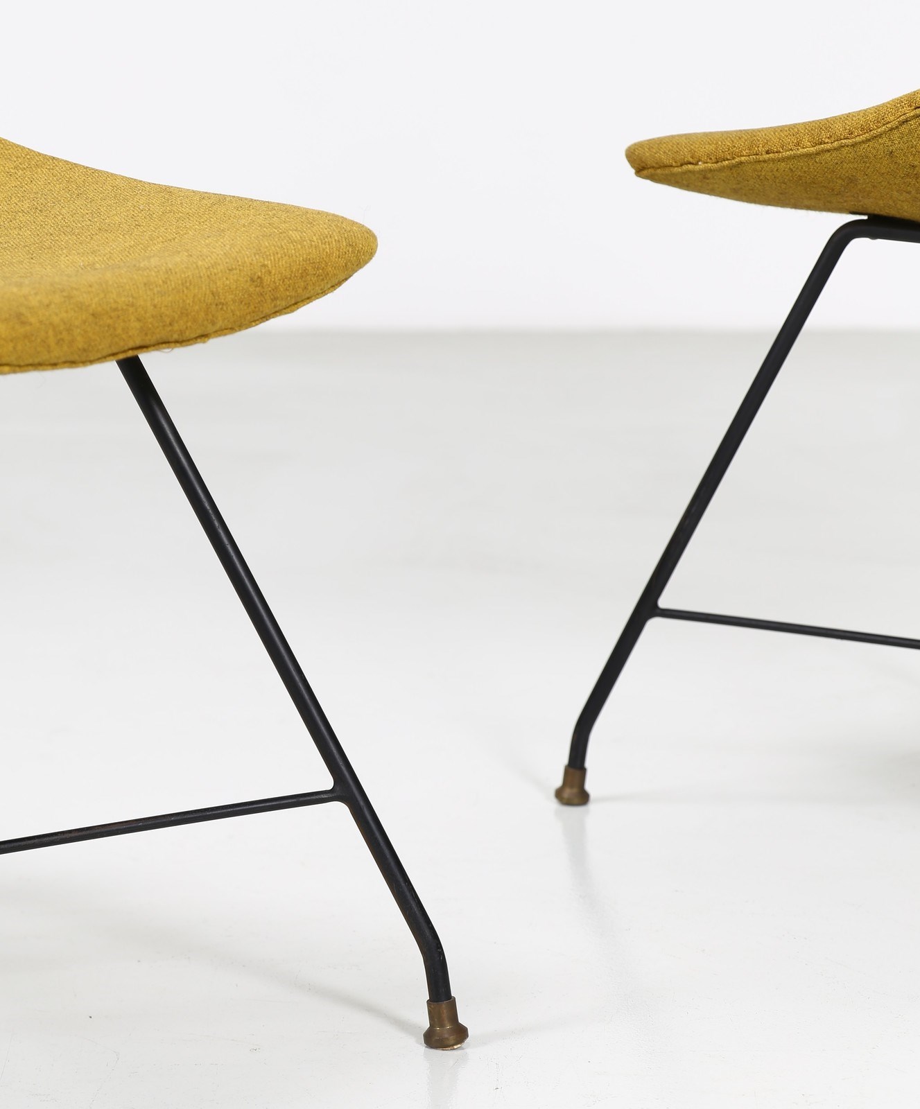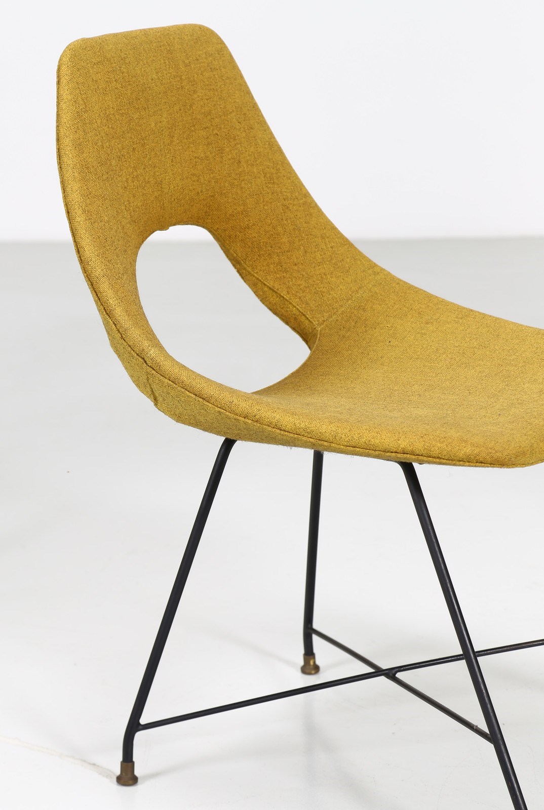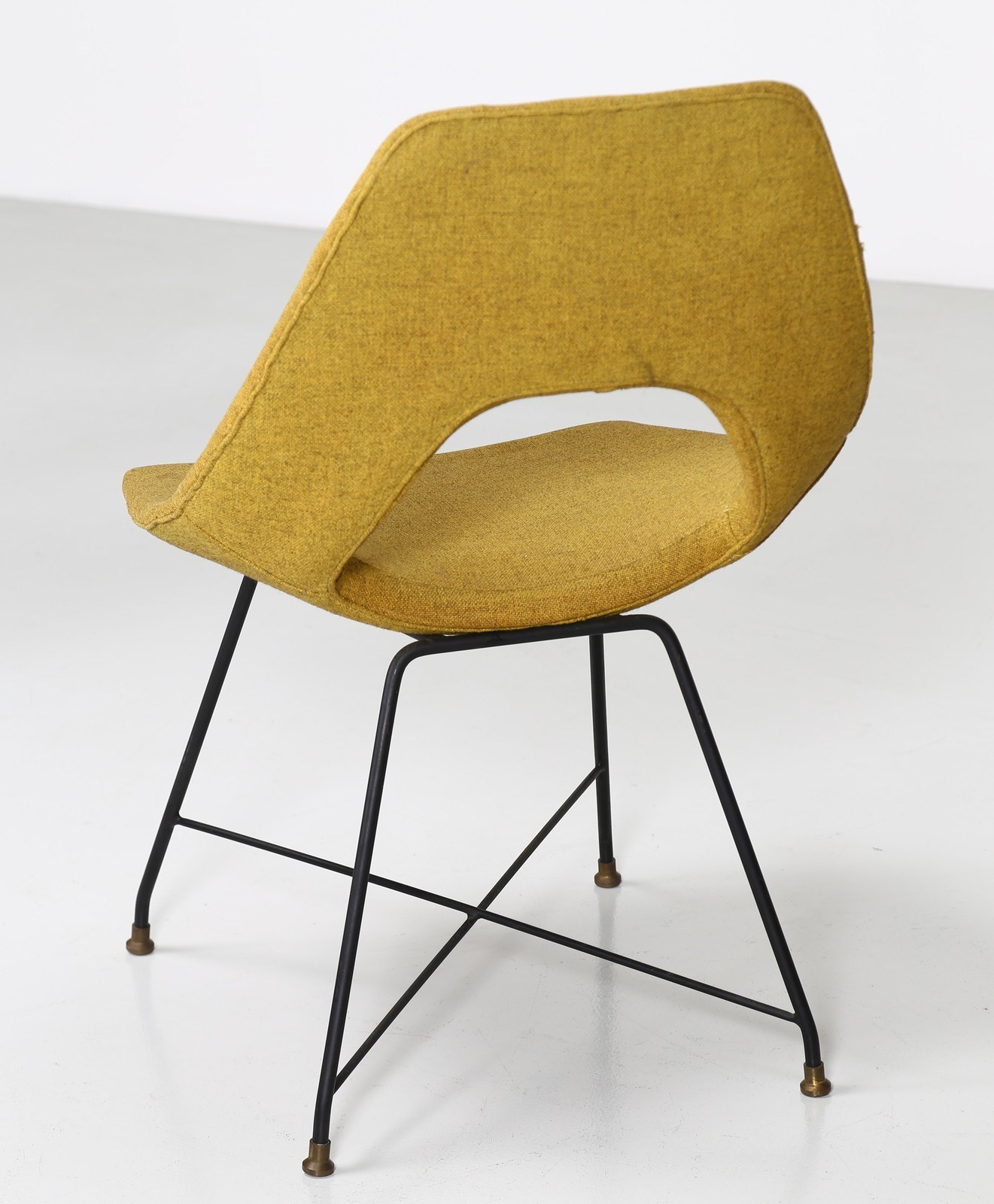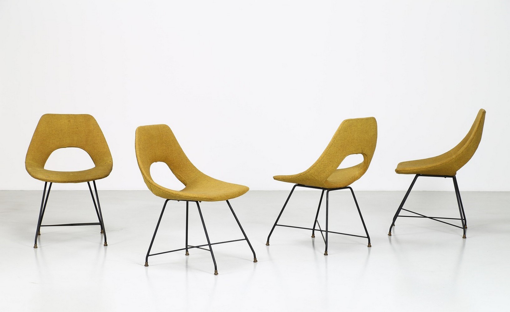 BOZZI AUGUSTO (1924 - 1982) Quattro sedie. Metallo laccato e tessuto. Cm 53,50 x 80,50 x 57,00. Quattro sedie modello Reller, anni 50. Struttura in tubolare metallico e scocca in tessuto. Pubblicazioni: Domus, n. 324, novembre 1956, p. 38