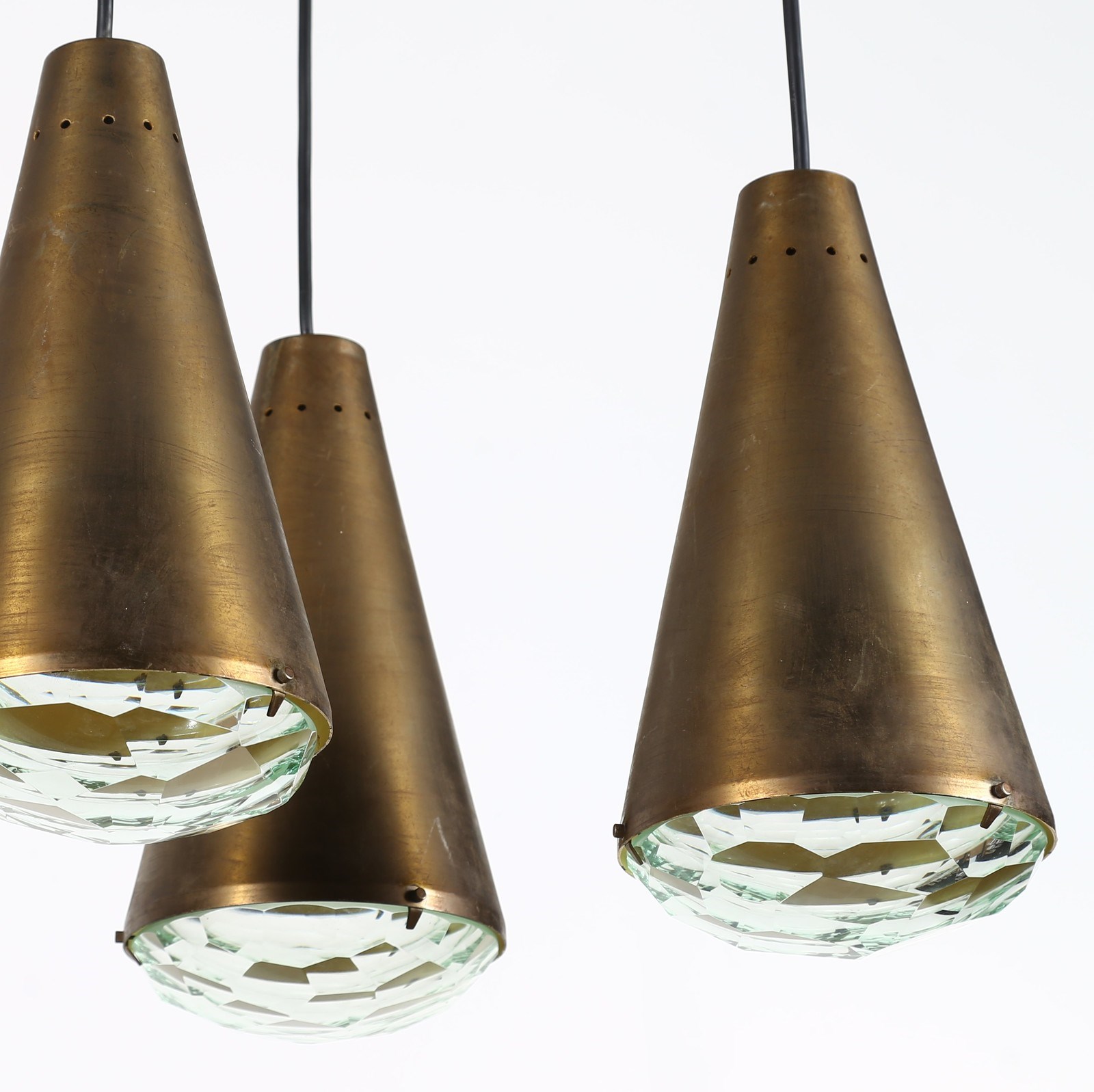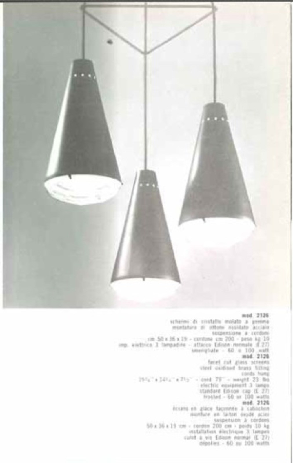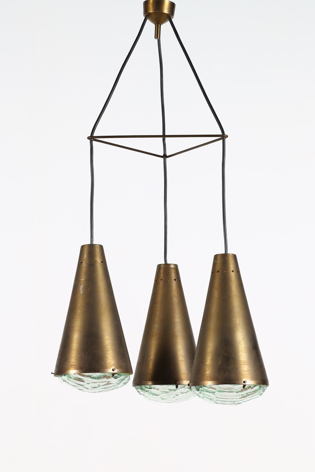 INGRAND MAX (1908 - 1969) Lampada a sospensione. Ottone e vetro. Cm 34,00 x 100,00 x 34,00. Lampada a sospensione a tre luci mod. 2126, per Fontana Arte, anni 50. Scheletro di cristallo molato a gemma, montatura in ottone ossidato e sospensione a corda. Pubblicazioni: Quaderni di Fontana Arte, n. 6, mod. 2126