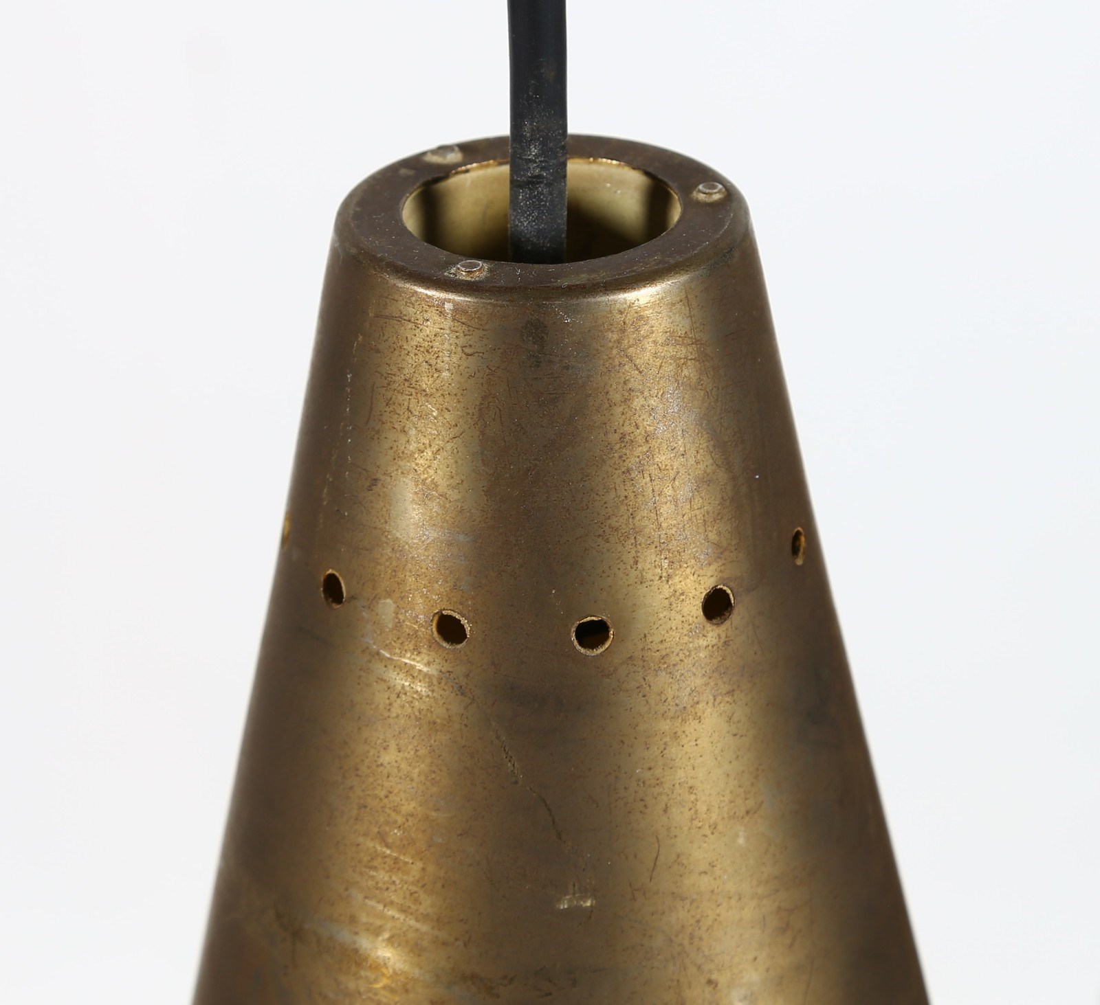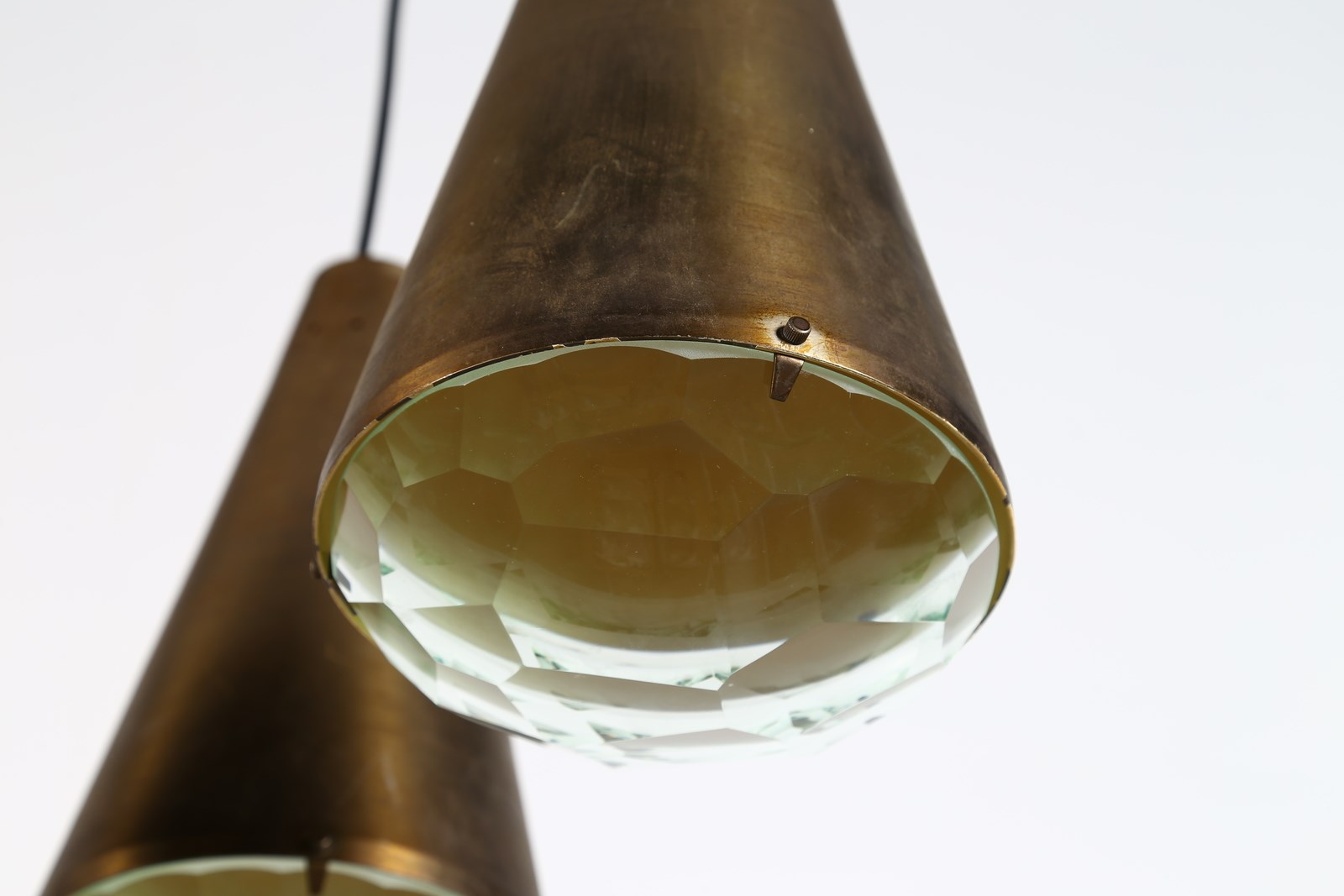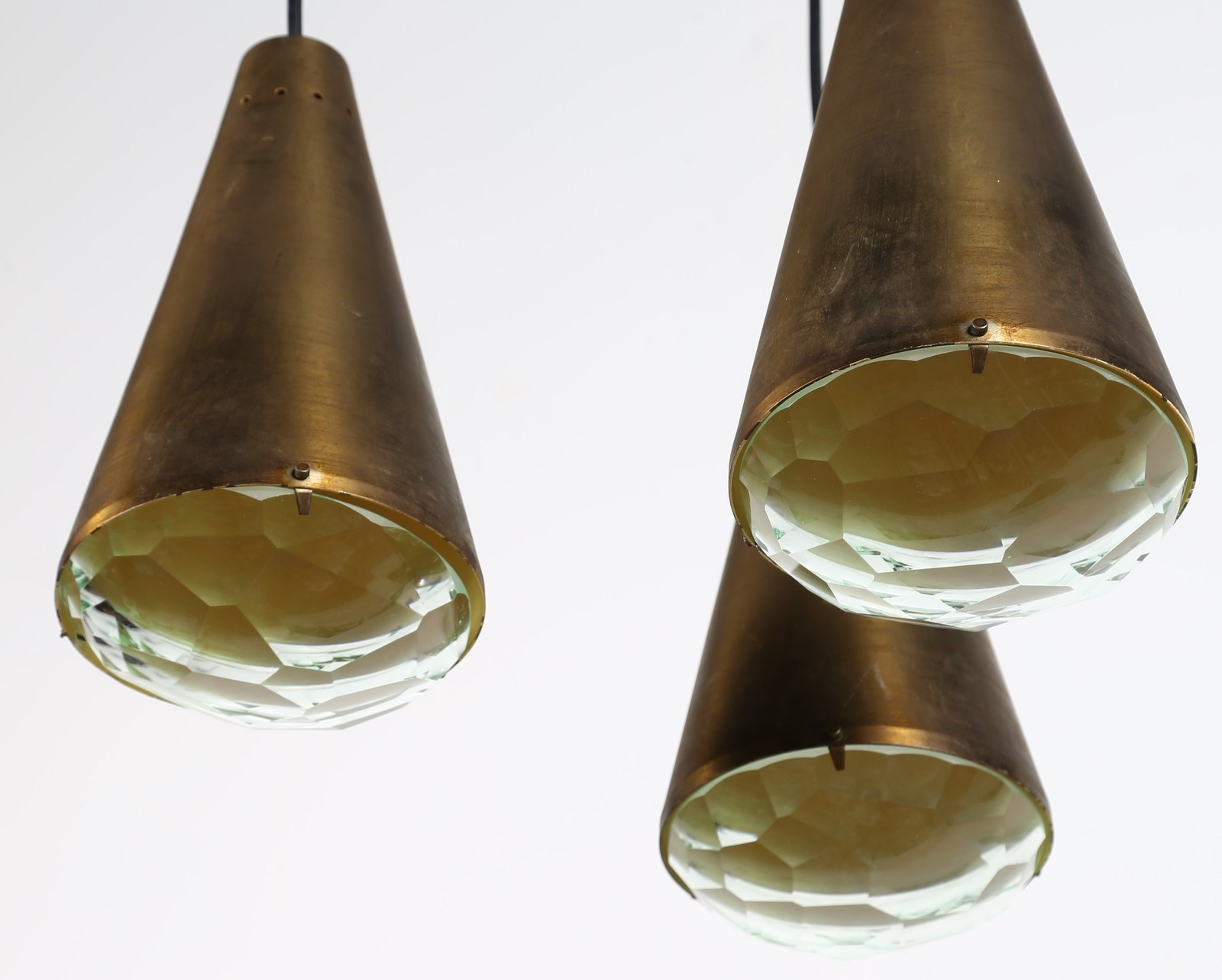 INGRAND MAX (1908 - 1969) Lampada a sospensione. Ottone e vetro. Cm 34,00 x 100,00 x 34,00. Lampada a sospensione a tre luci mod. 2126, per Fontana Arte, anni 50. Scheletro di cristallo molato a gemma, montatura in ottone ossidato e sospensione a corda. Pubblicazioni: Quaderni di Fontana Arte, n. 6, mod. 2126