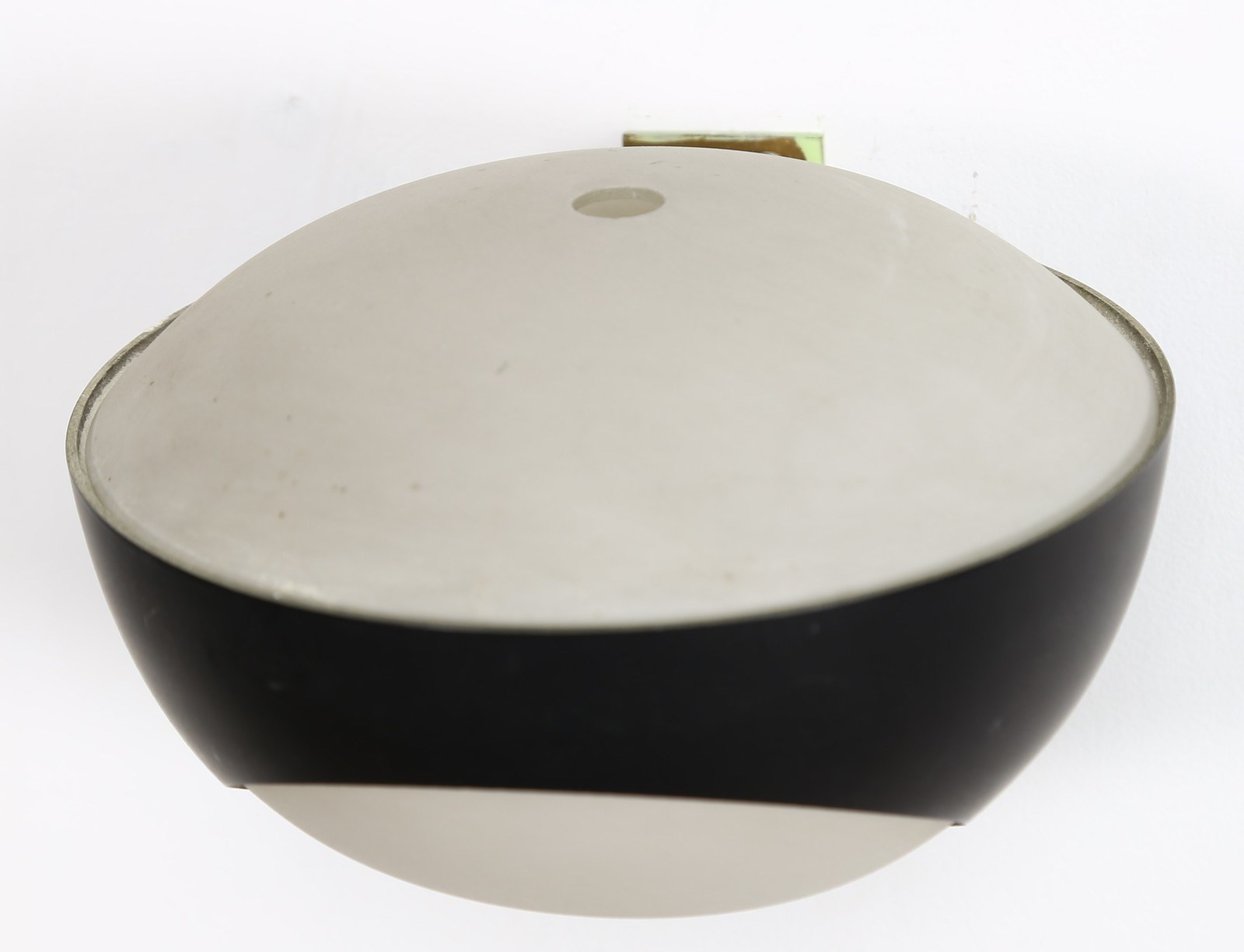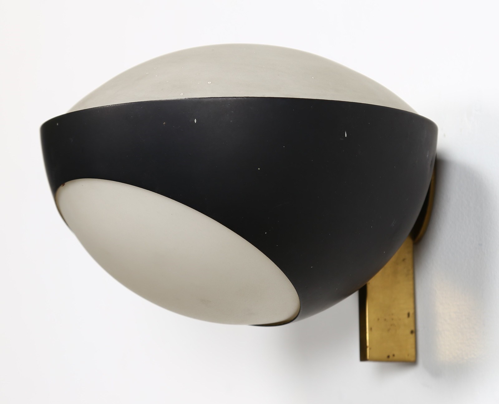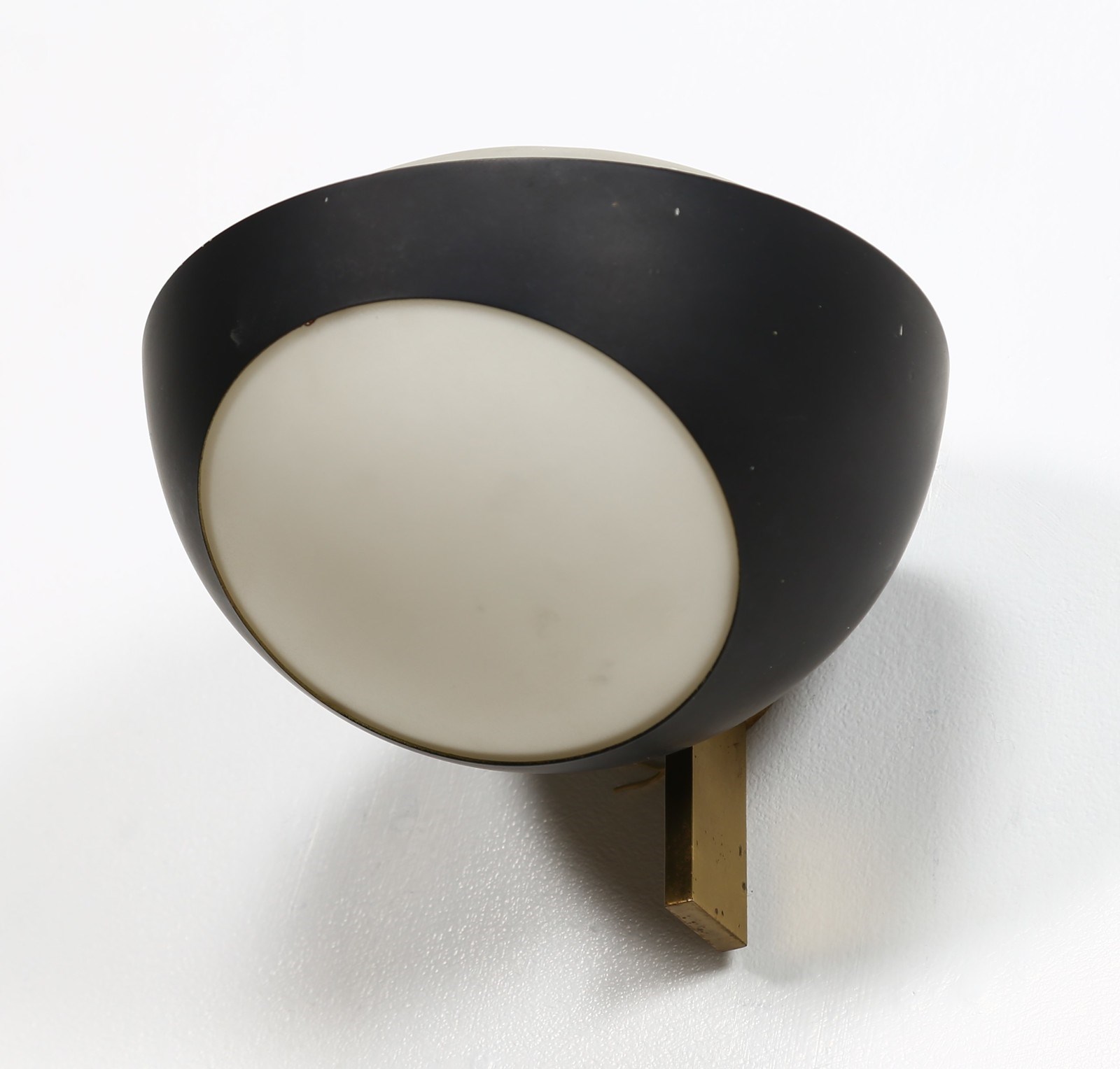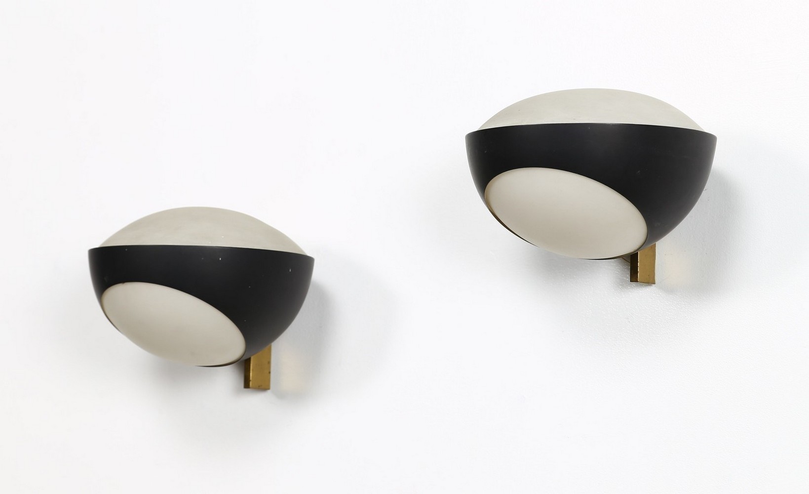INGRAND MAX (1908 - 1969) Coppia di appliques. Ottone, metallo laccato e vetro opalino. Cm 19,50 x 15,00 x 20,50. Coppia di appliques mod. 1963, struttura in metallo laccato e ottone, diffusore in vetro opalino, per Fontana Arte, 1964.