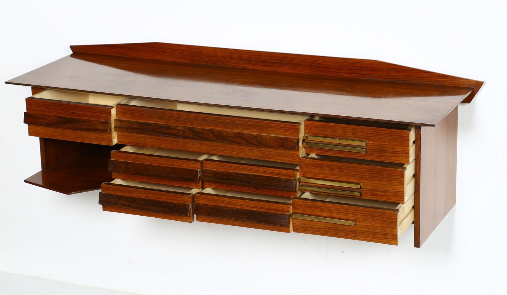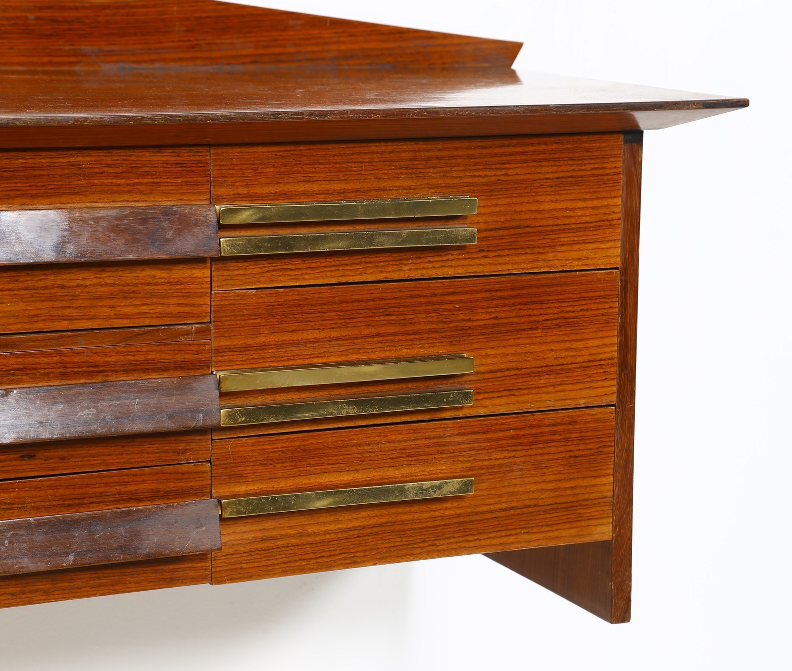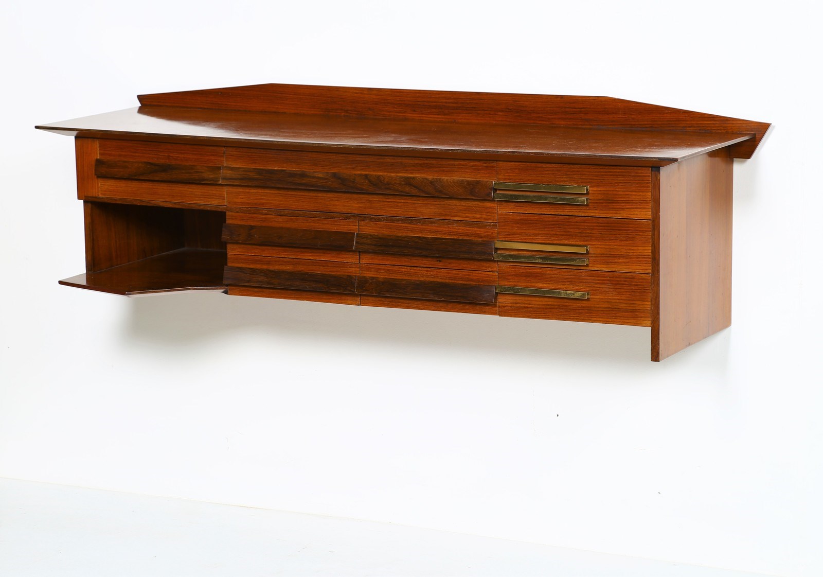 DASSI M.M. Consolle. Legno e ottone. Cm 142,00 x 40,00 x 44,00. Consolle sospesa in legno di palissandro, ottone e legno laccato, anni 50.