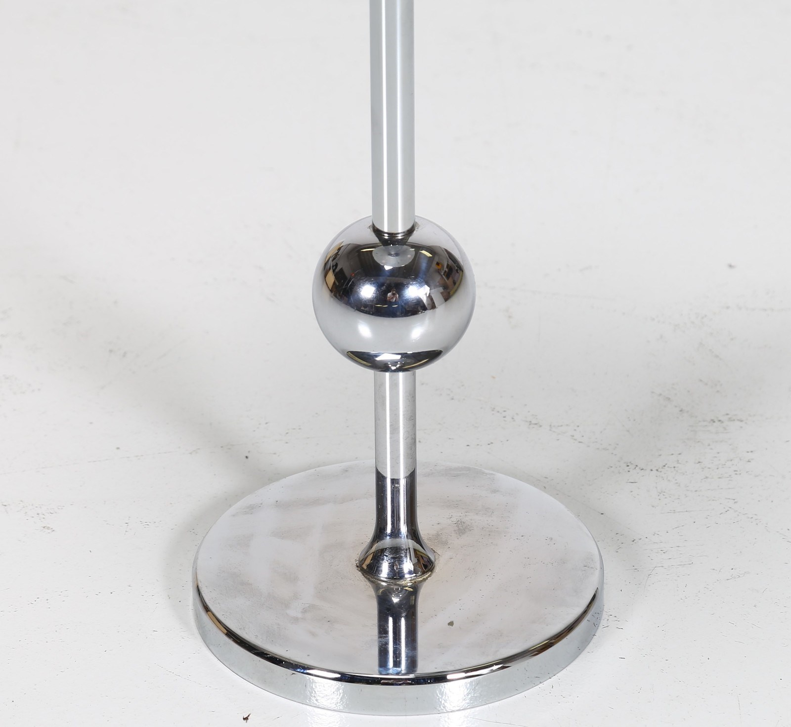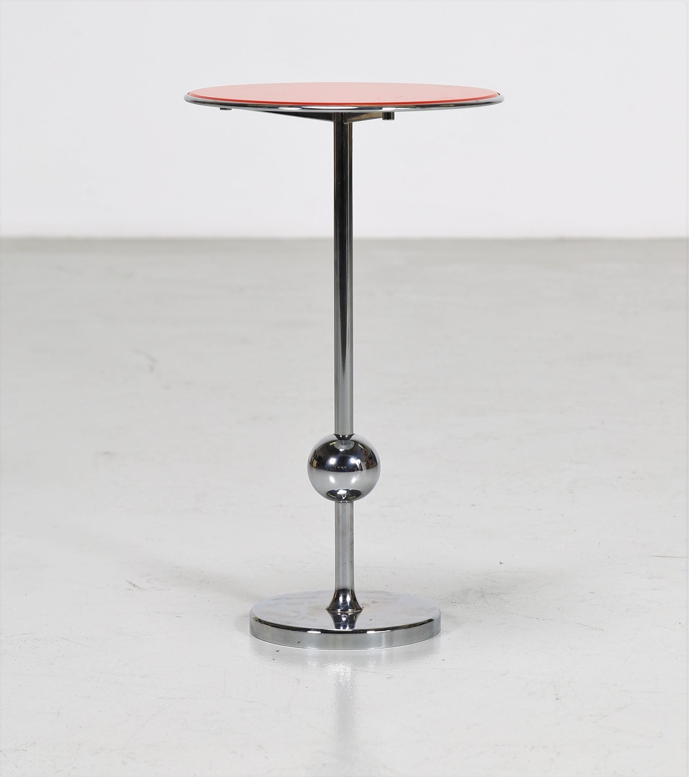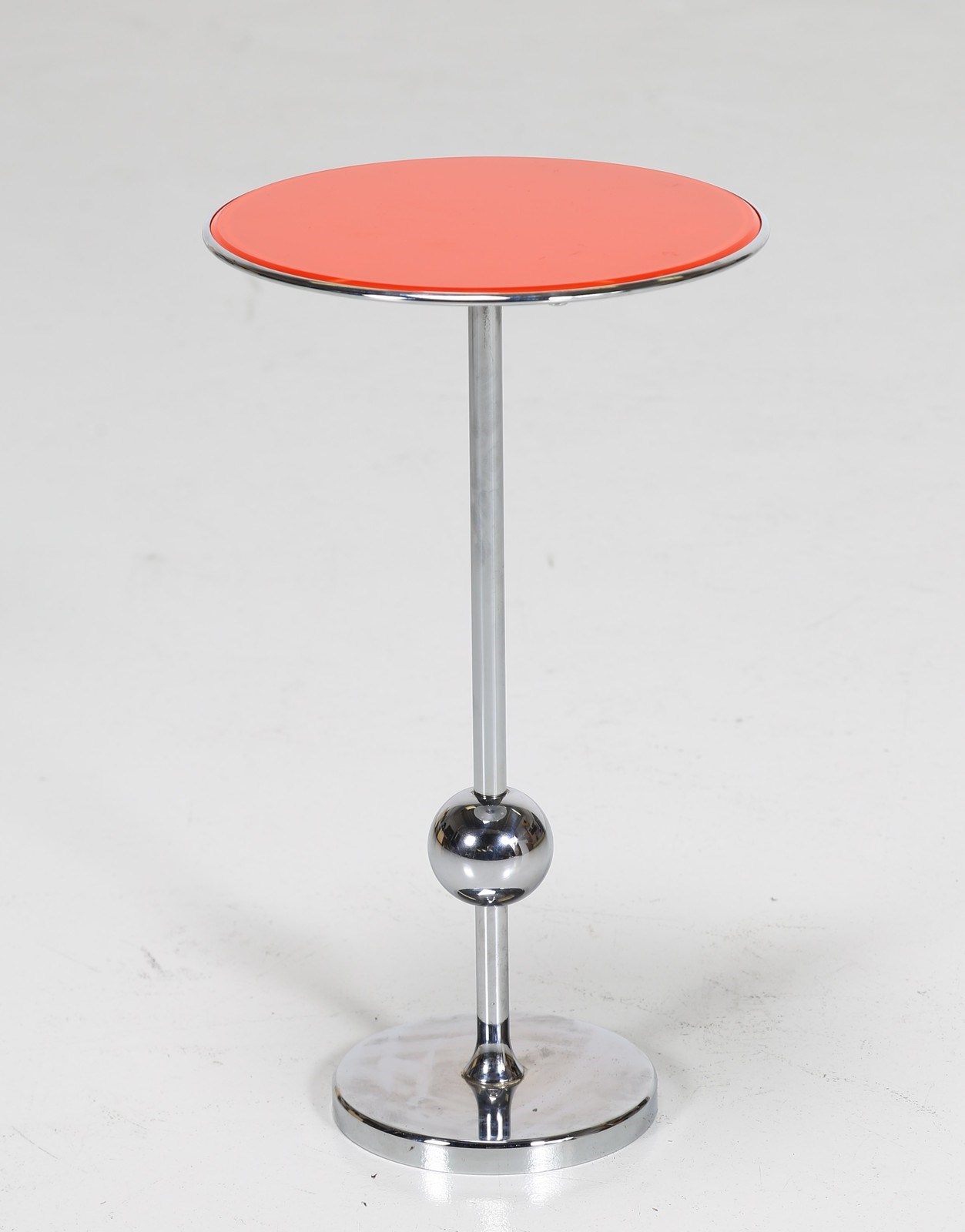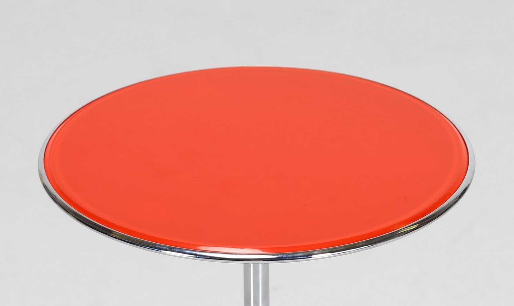 BORSANI OSVALDO (1911 - 1985) Tavolino. Vetro e ottone cromato.. Cm 26,00 x 45,00 x 26,00. Tavolino servomuto mod. T1, prodotto da Tecno. Italia, anni '70. Struttura in metallo cromato e vetro colorato rosso, Pubblicazioni: G. Gramigna, F. Irace, Osvaldo Borsani, Roma 1992, p. 193