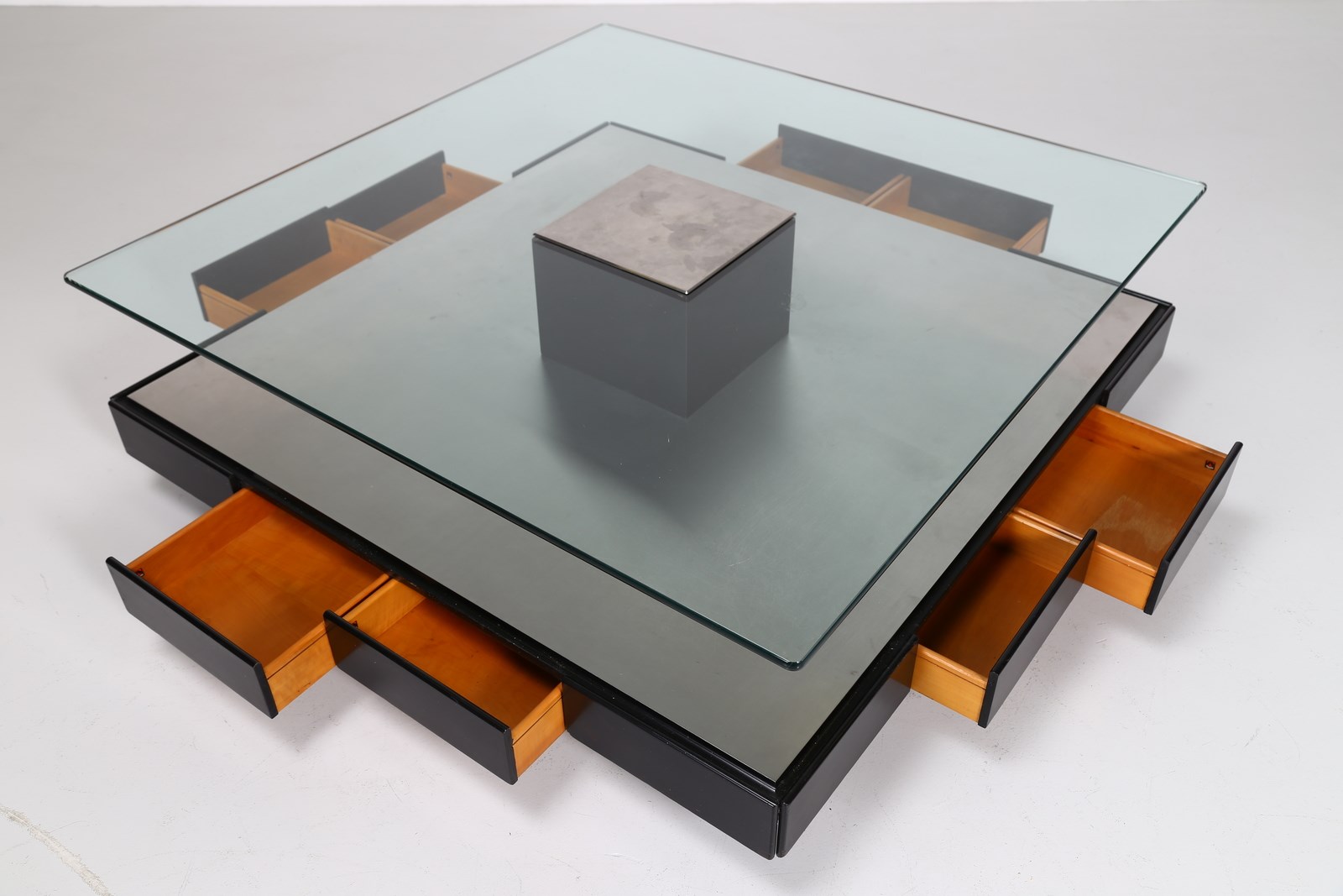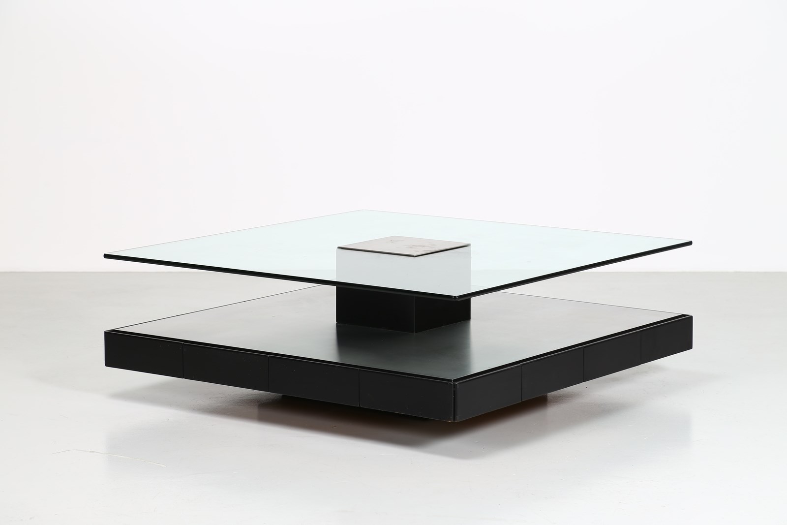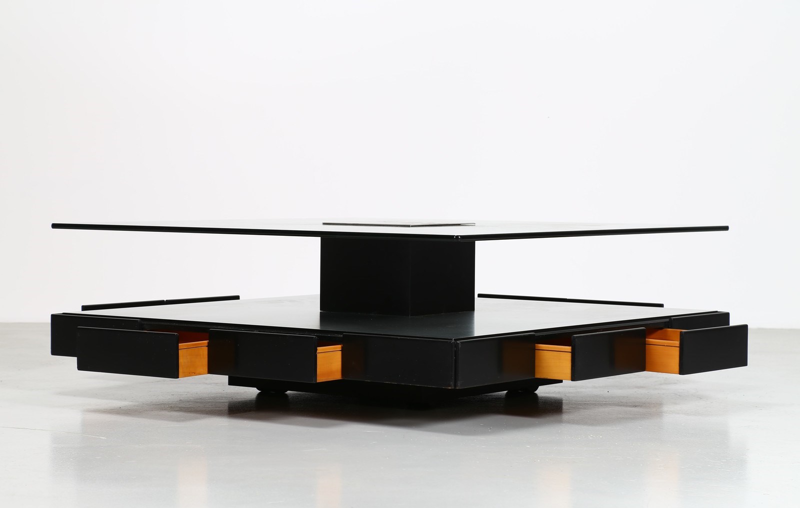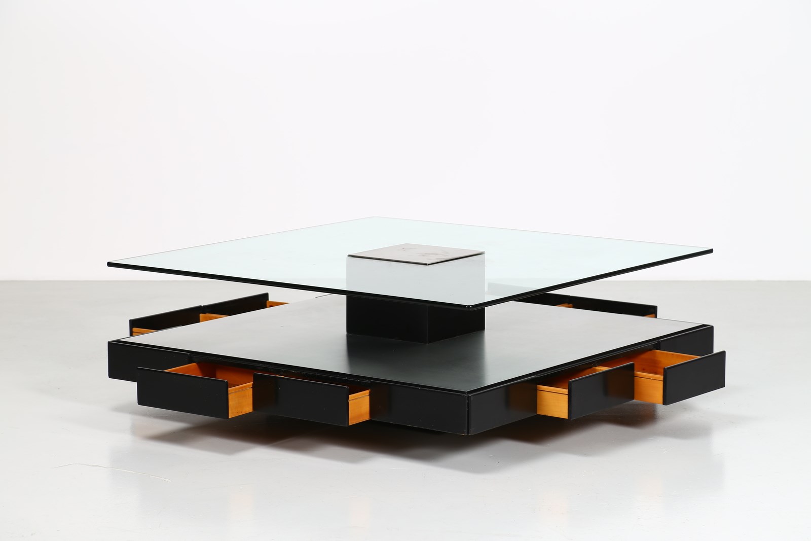 FANTONI MARCO Tavolo. Legno e acciaio. Cm 130,00 x 45,00 x 130,00. Tavolino da soggiorno, mod. T147, per Tecno, anno del disegno 1970, anno di inizio produzione 1971. Basamento staccato da terra in legno laccato al poliestere satinato opaco, finito nella parte superiore con un piano in acciaio inossidabile satinato. Al centro di questo piano poggia un ripiano in cristallo dello spessore di 16 mm. Sul basamento trovano posto otto cassetti, distribuiti a due a due sui lati. Pubblicazioni: Bosoni G, Tecno, l'eleganza discreta, della tecnica, Skira, Milano, p. 196