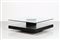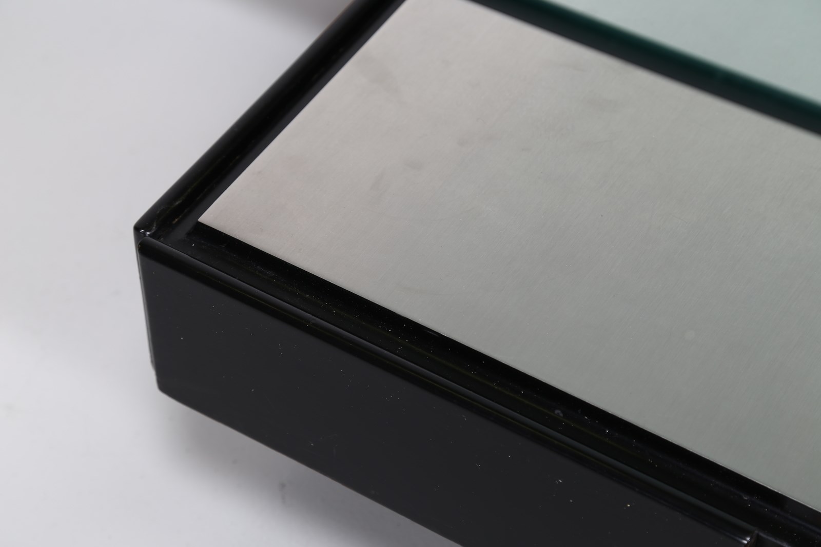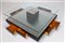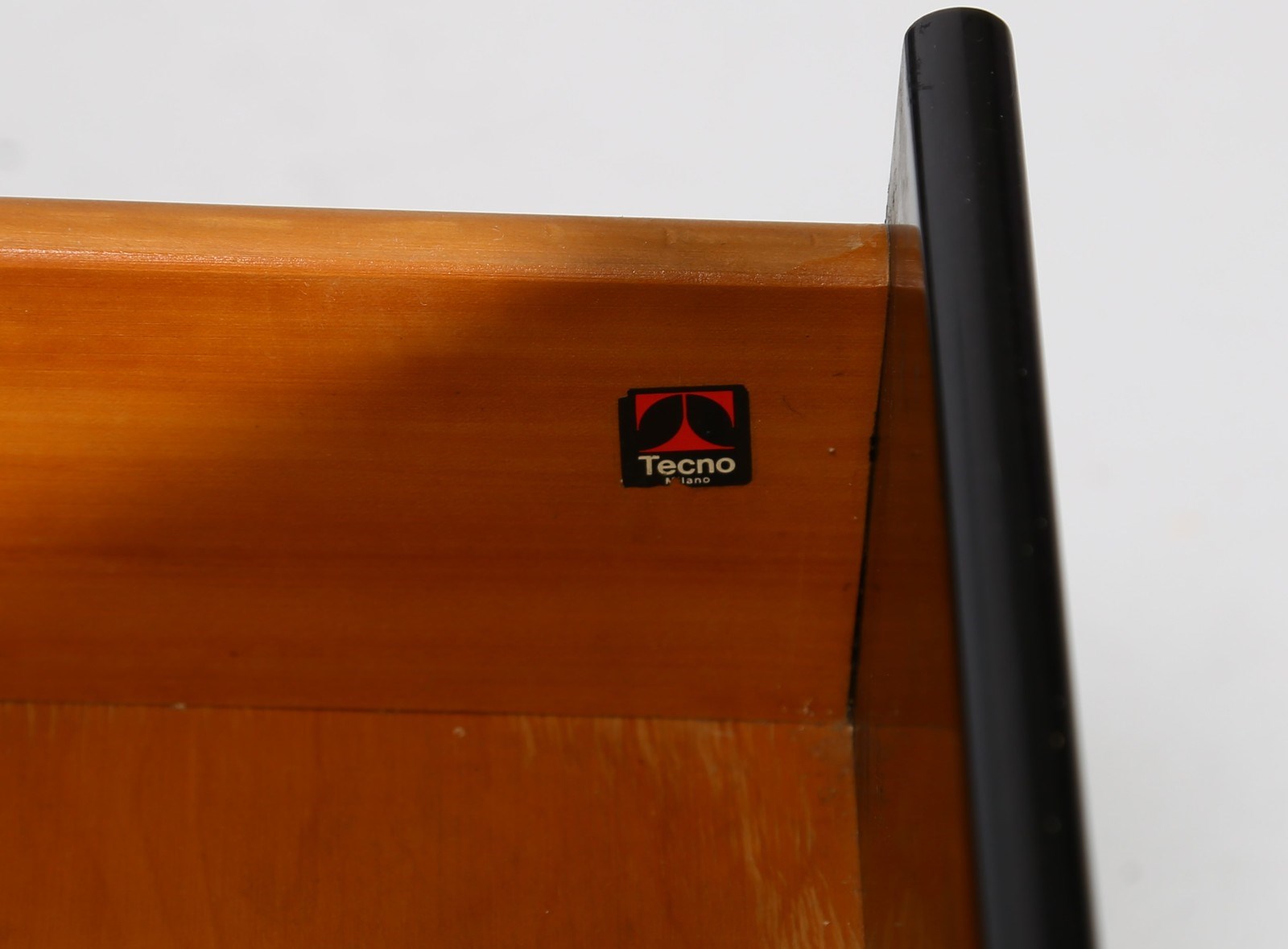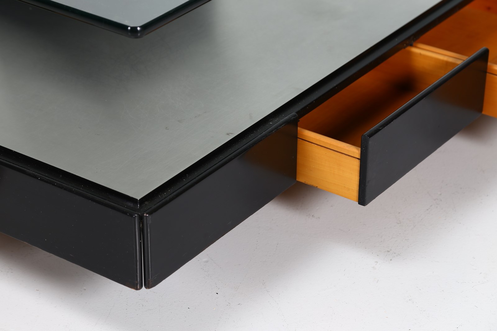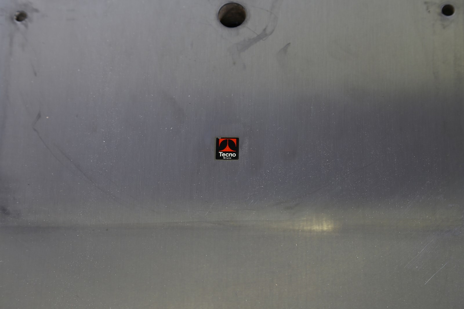 FANTONI MARCO Tavolo. Legno e acciaio. Cm 130,00 x 45,00 x 130,00. Tavolino da soggiorno, mod. T147, per Tecno, anno del disegno 1970, anno di inizio produzione 1971. Basamento staccato da terra in legno laccato al poliestere satinato opaco, finito nella parte superiore con un piano in acciaio inossidabile satinato. Al centro di questo piano poggia un ripiano in cristallo dello spessore di 16 mm. Sul basamento trovano posto otto cassetti, distribuiti a due a due sui lati. Pubblicazioni: Bosoni G, Tecno, l'eleganza discreta, della tecnica, Skira, Milano, p. 196
