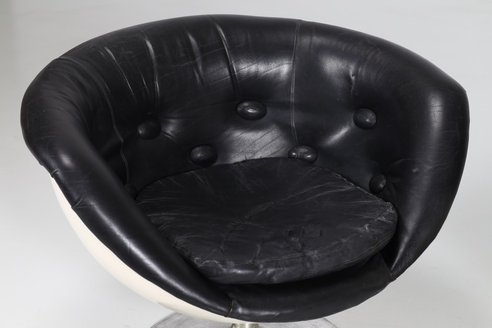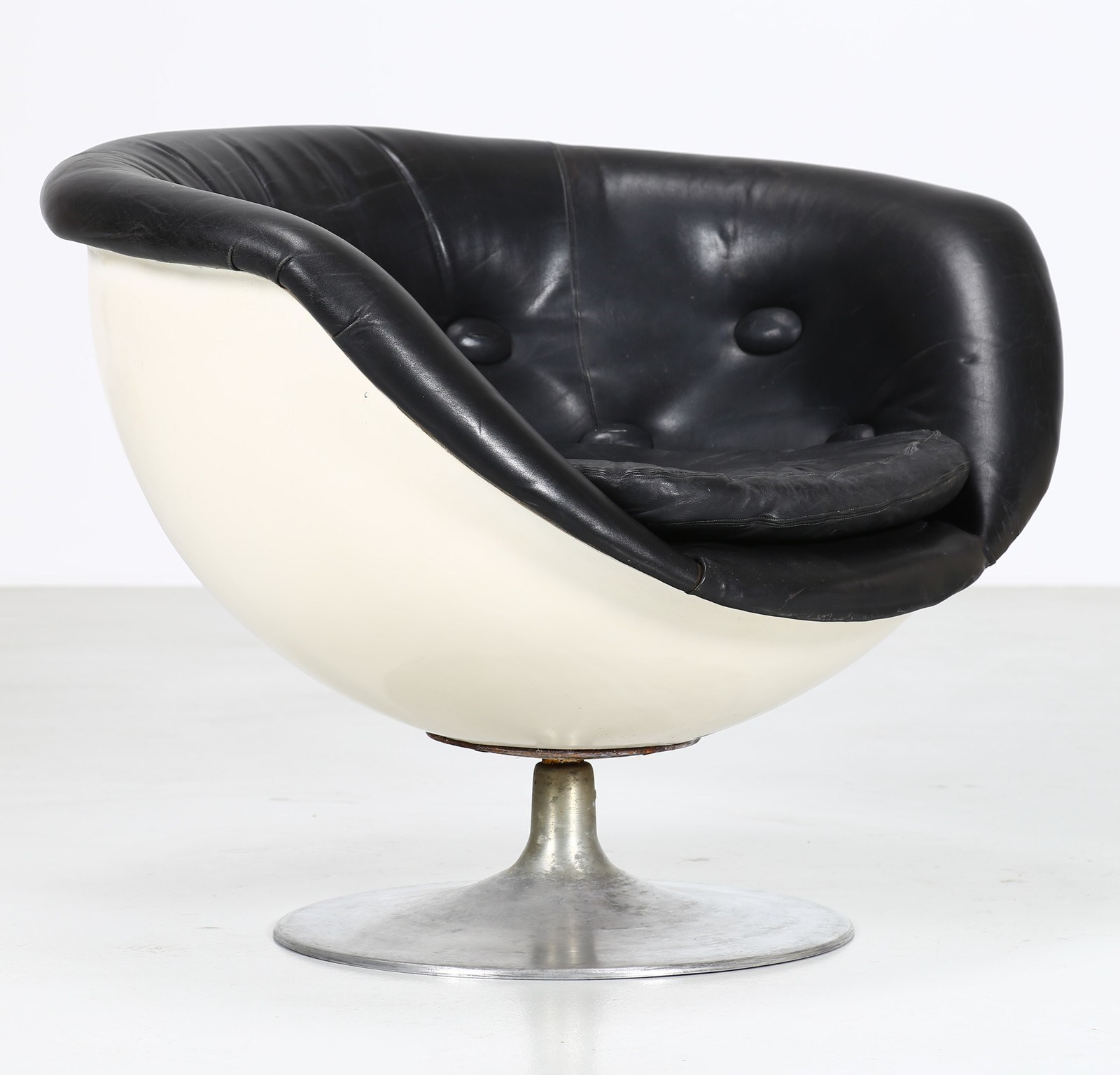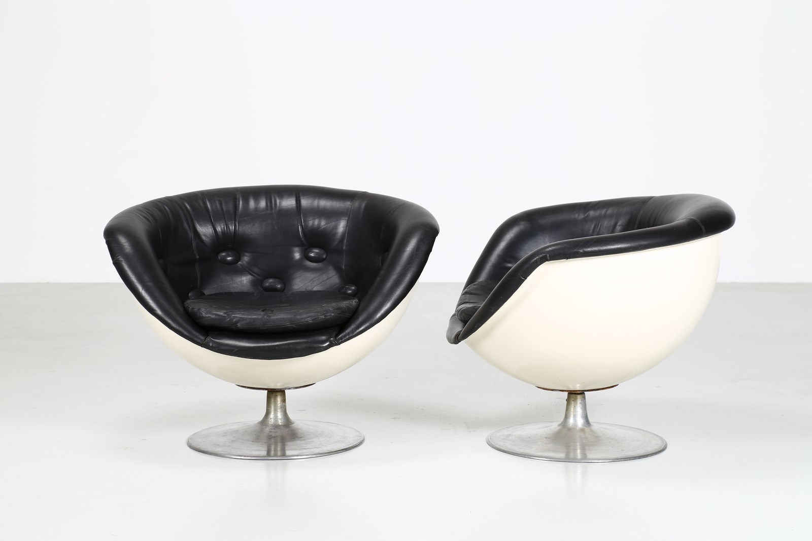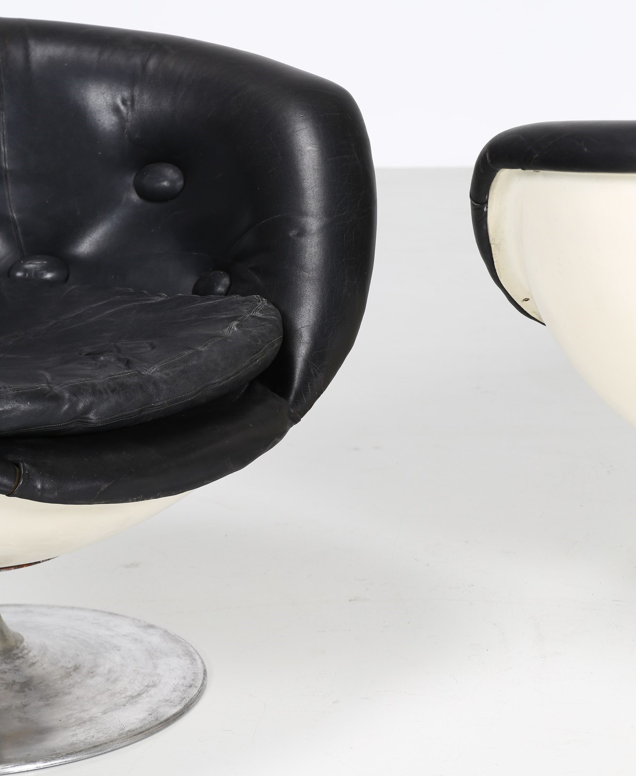 RINALDI GASTONE (1920 - 2006) Coppia di poltrone. Vetroresina. Cm 90,00 x 67,00 x 75,00. Coppia di poltrone modello P180 , per Rima, anni 60. Scossa in vetroresina e controscocca imbottita e rivestita in pelle nera, base in fusione di alluminio. Pubblicazione: Gastone Rinaldi, Designer alla Rima, a cura di Giuseppe Drago e Jacopo Drago, Capitolium Art edizioni, p. 197 - Domus, n. 458, gennaio 1968, p. d/407