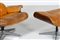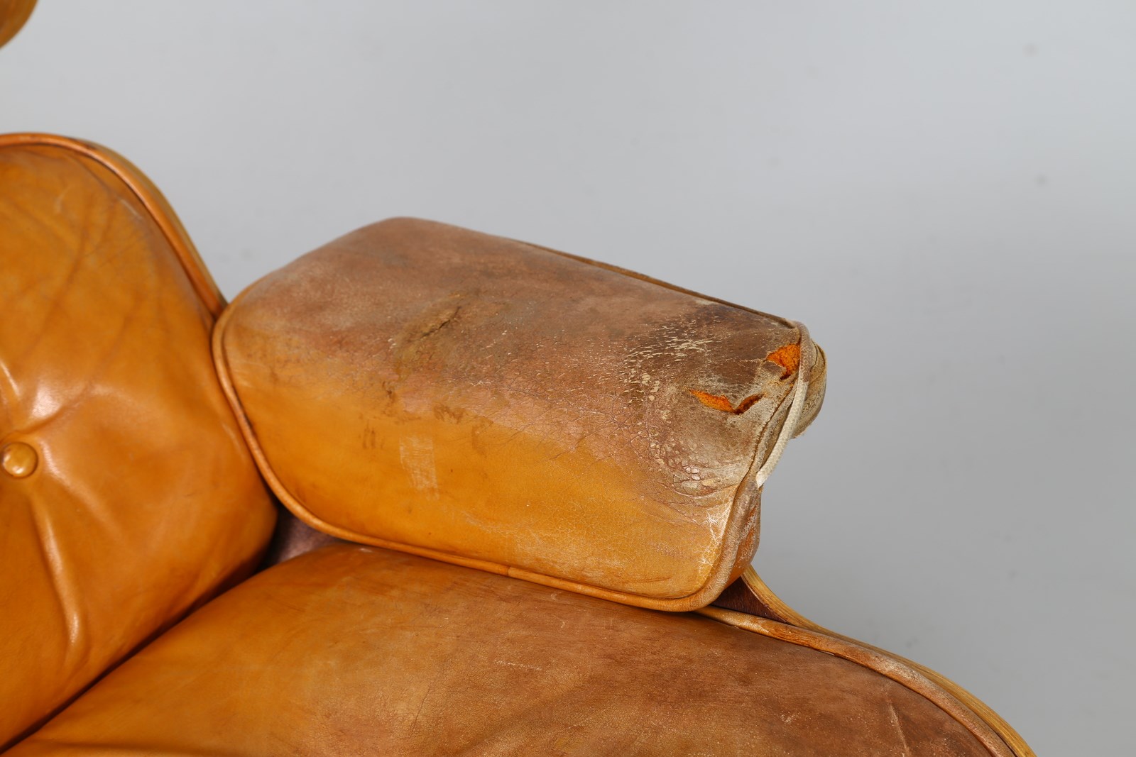 EAMES CHARLES & RAY (1907 - 1978) Poltrona con ottomano. Legno, metallo e pelle. . Poltrona con ottomano, per Herman Miller, anni 50. Sono ufficialmente chiamati Eames Lounge (670) e Ottomana (671) . Seduta e schienale in compensato modellato impiallacciato, cuscini in cuoio cognac e base in alluminio. Basato su un prototipo presentato al concorso "Organic Design in Home Furnishing", tenutosi presso il Museum of Modern Art nel 1940, il modello n. 670 rappresenta la poltrona più complessa mai realizzata dagli Eames e il loro primo progetto destinato al mercato di lusso. Tratto da: Charlotte & Peter Fiell, 1000 chairs, Taschen, 2016, p. 275