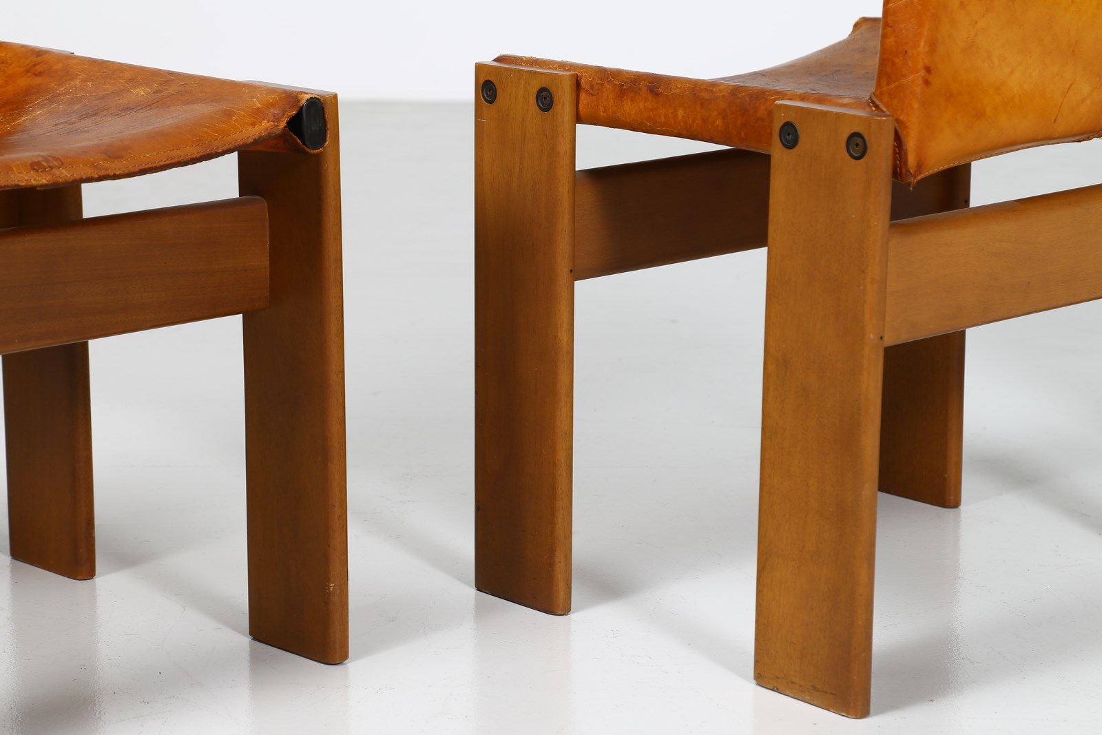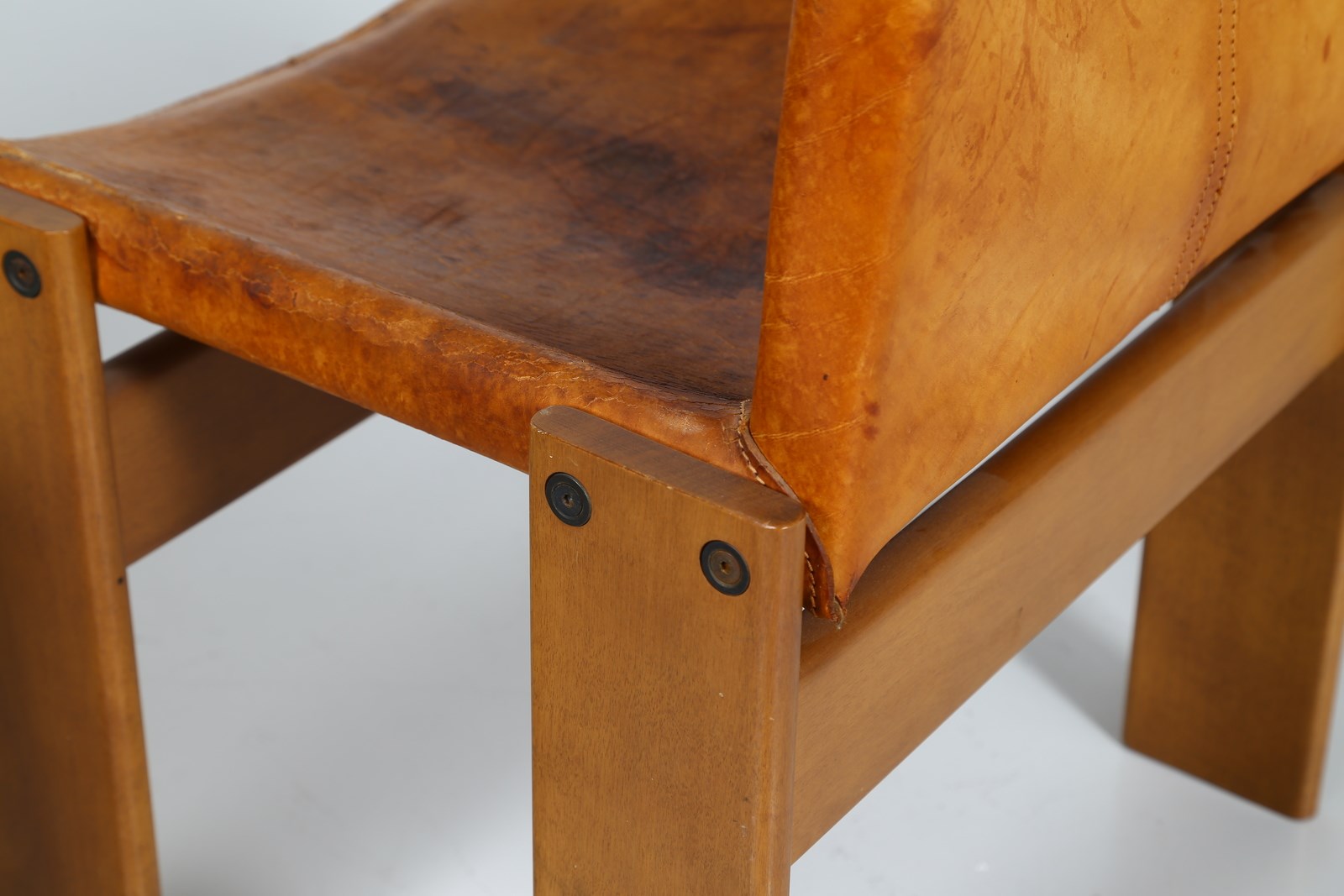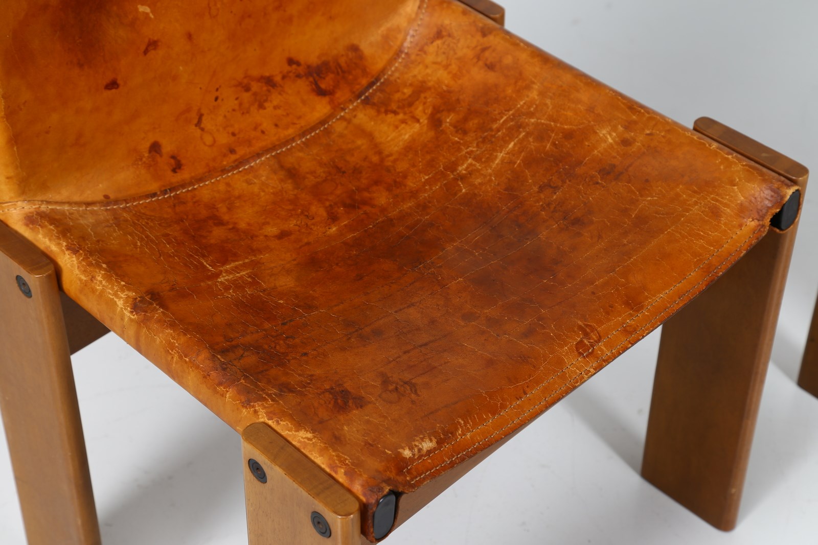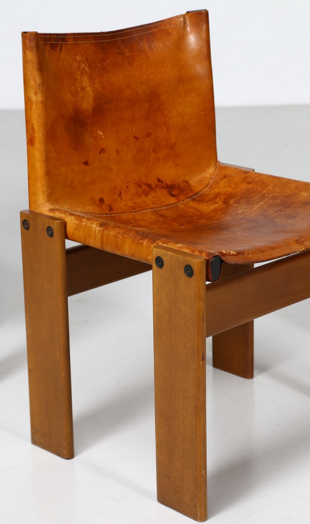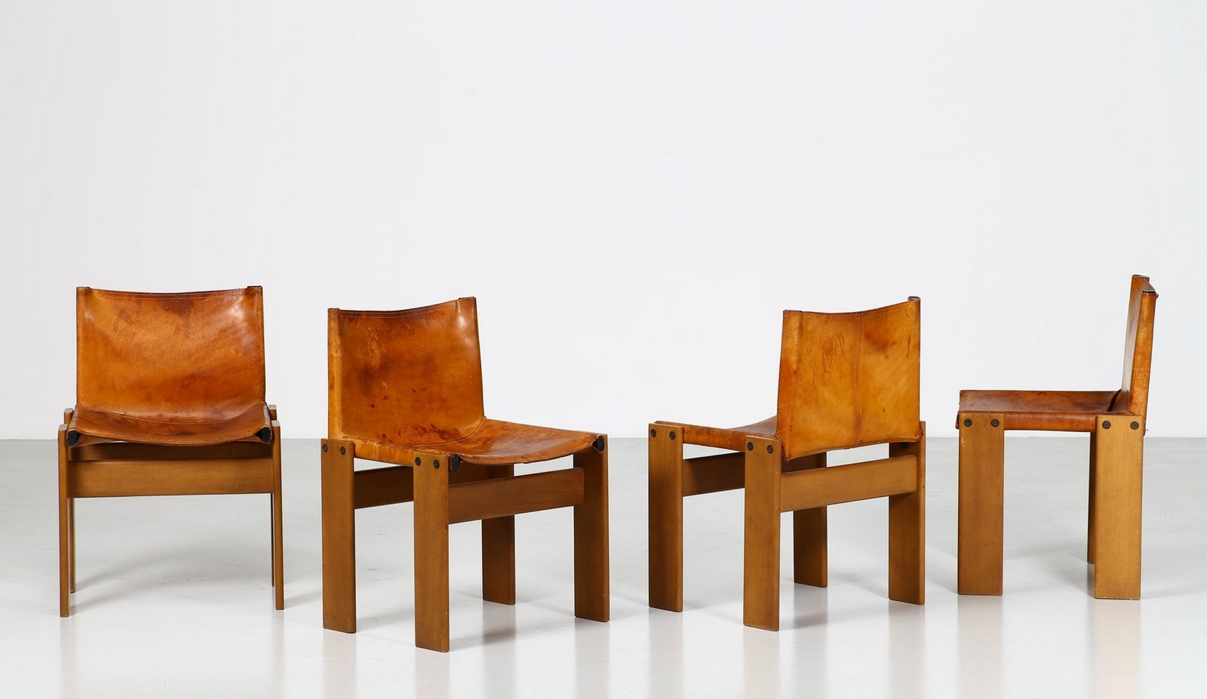 SCARPA AFRA (1937 -2011) & TOBIA (n. 1935) Quattro sedie. Legno e pelle. Cm 51,50 x 75,00 x 44,00. Quattro sedie modello Monk per Molteni, data del disegno: 1973. Sedia con seduta e schienale in pelle color cuoio calzato su due tubi d’acciaio avvitati a due ponti di legno massiccio che costituiscono l’appoggio a terra.Pubblicazioni: Antonio Piva, Afra e Tobia Scarpa Architetti e Designers, Mondadori, Milano, 1985, pp. 87, 145.