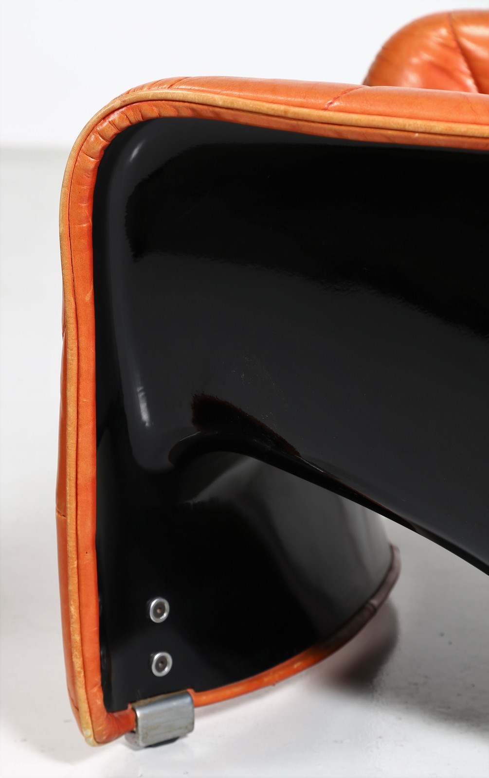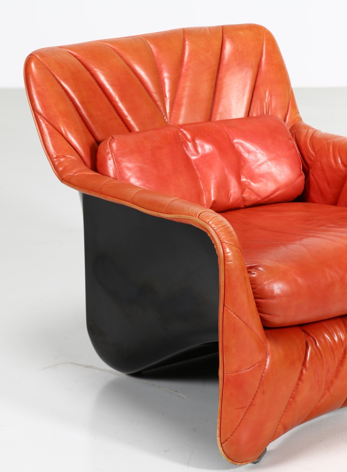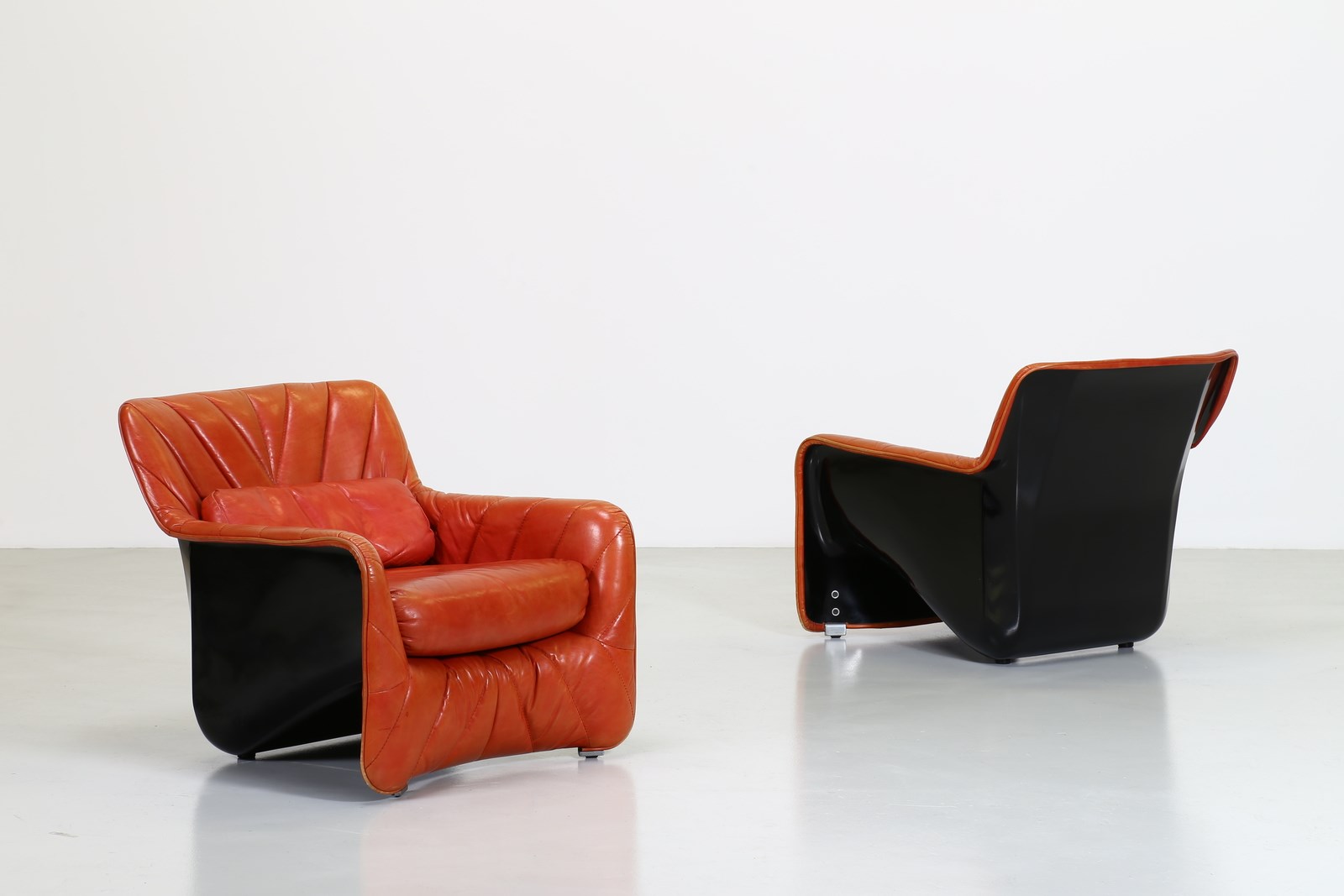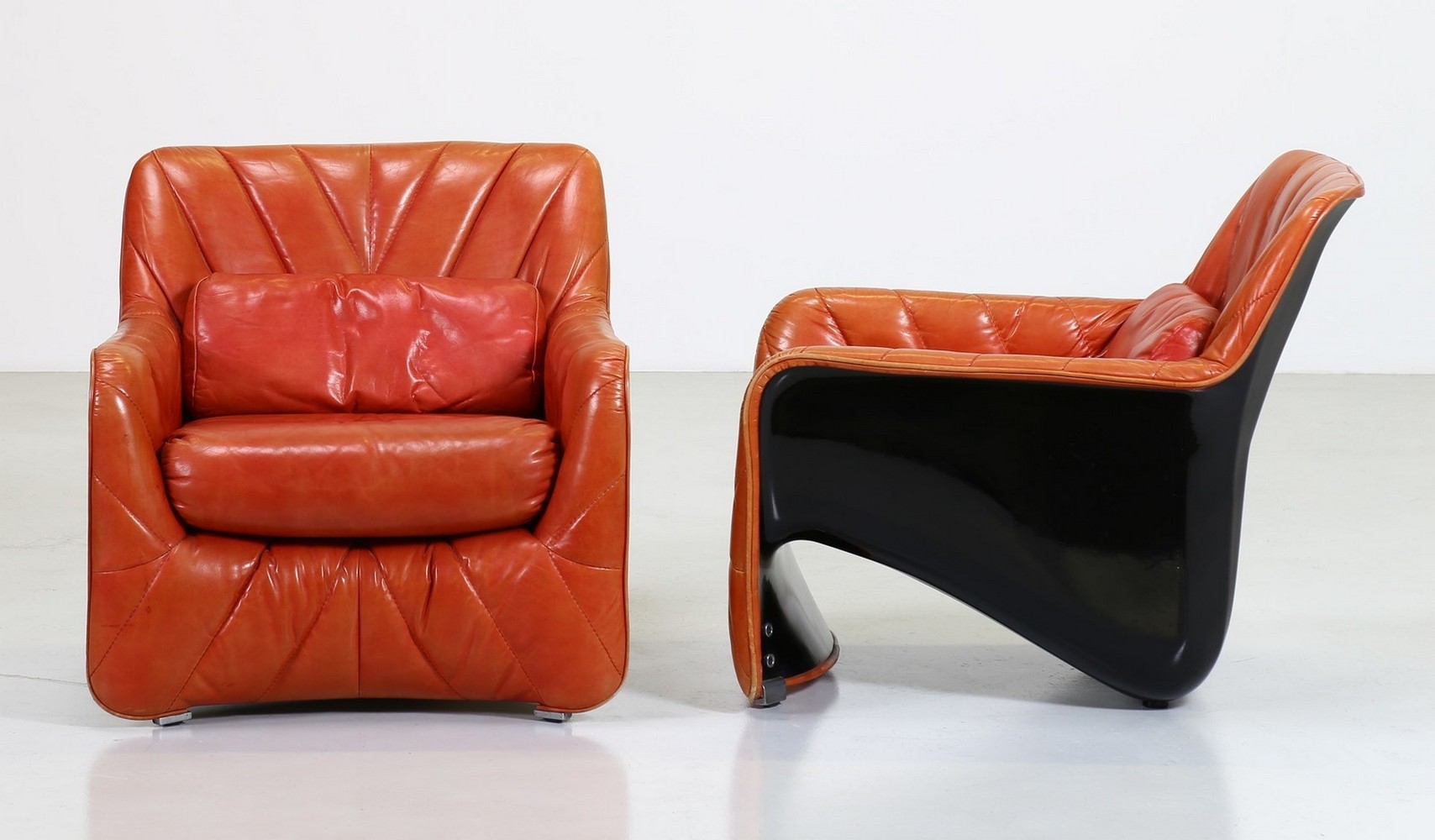 BARTOLI CARLO (n. 1931) Coppia di poltroncine. Pelle e fiberglass.. Cm 70,00 x 68,00 x 80,00. Coppia di poltroncine modello "Bicia", per Arflex, anni 70. Data del disegno: 1969. Struttura in fiberglass nera e rivestimento in pelle. Pubblicazioni: Domus, n. 483, febbraio 1970, p. 90