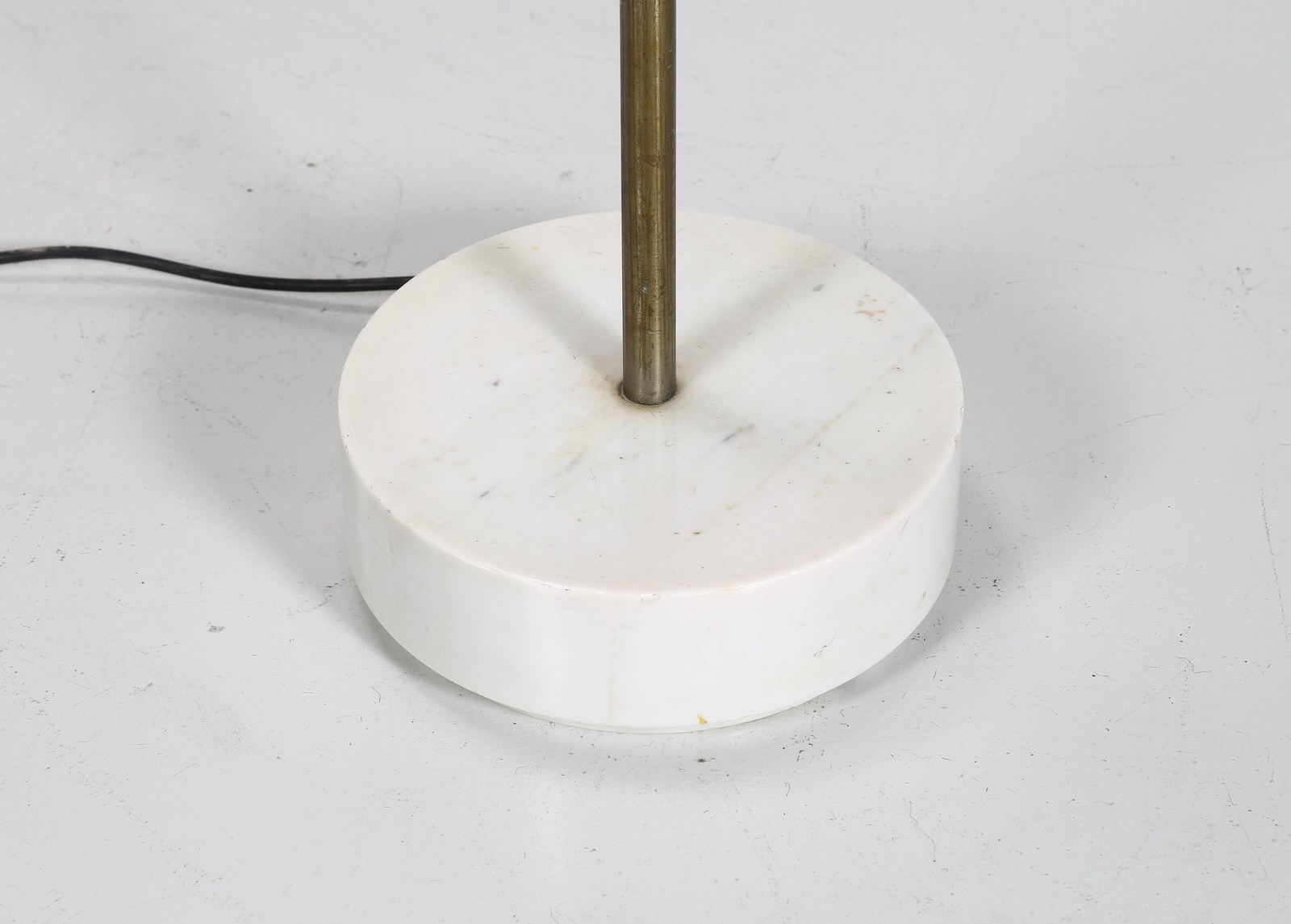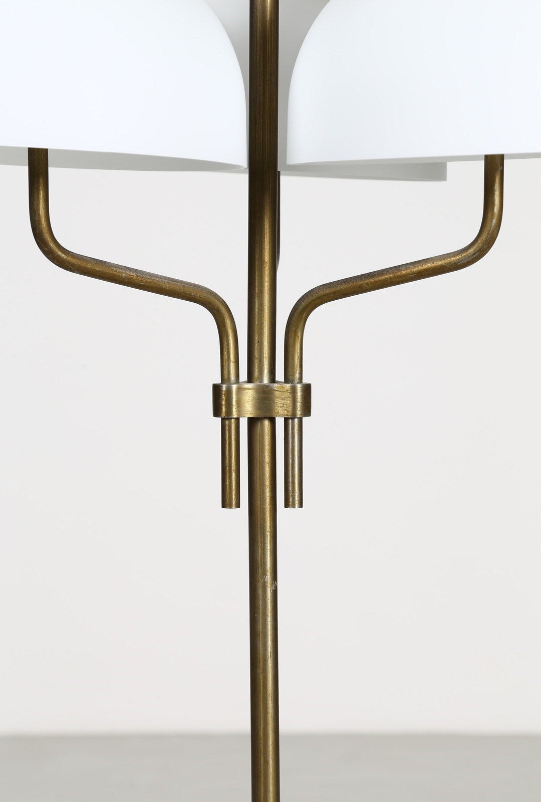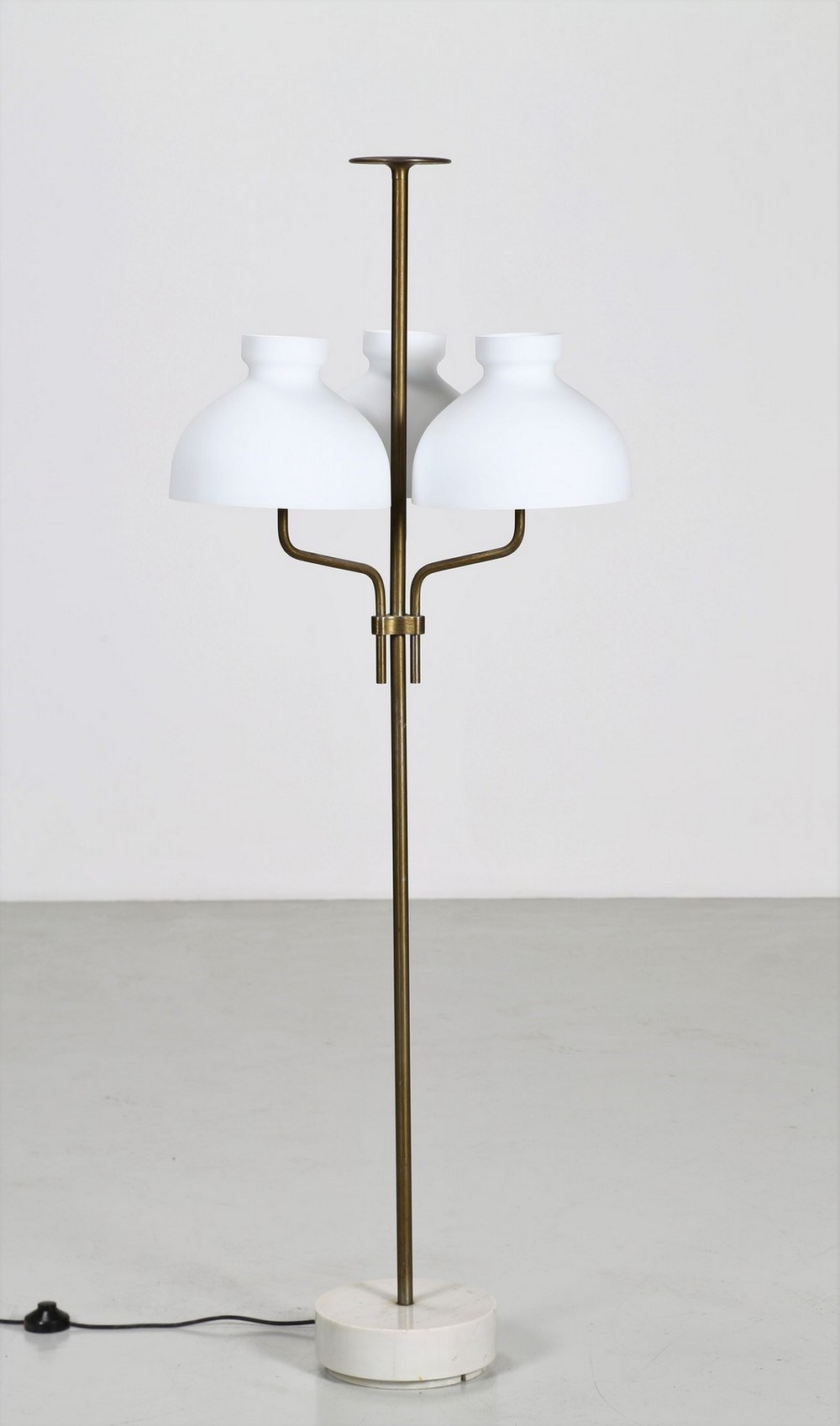GARDELLA IGNAZIO (1905 - 1999) Lampada da terra. Ottone, vetro satinato. . Base cilindrica in marmo di Carrara, stelo in ottone e paralumi in vetro satinato. Modello Arenzano, per Azucena, anni 50. Pubblicazioni: Domus, n. 435, Febbraio 1966, p. 48 - Alberto Bassi, Italian Lighting Design: 1945–2000, Phaidon Inc Ltd, Milano, 2004, p. 55