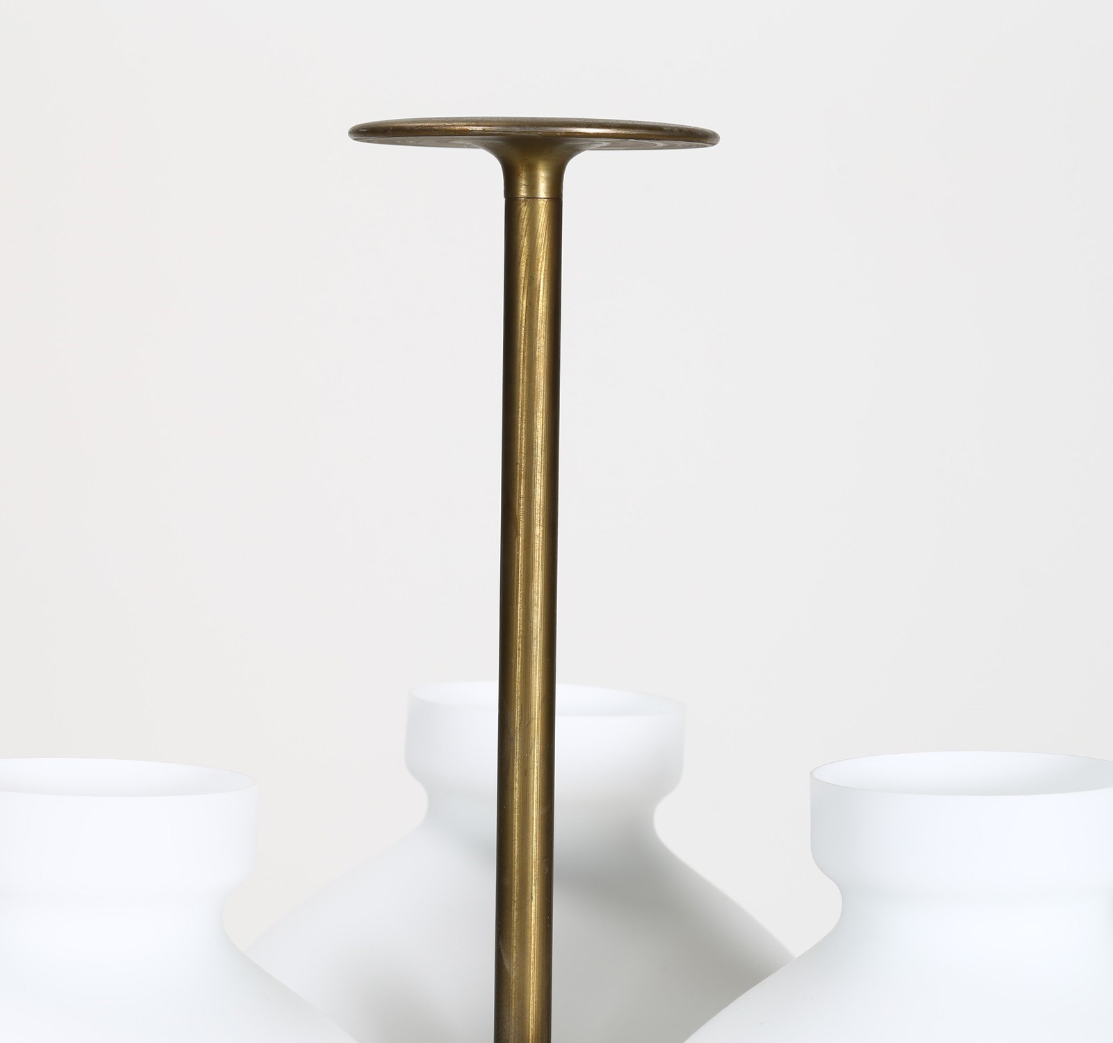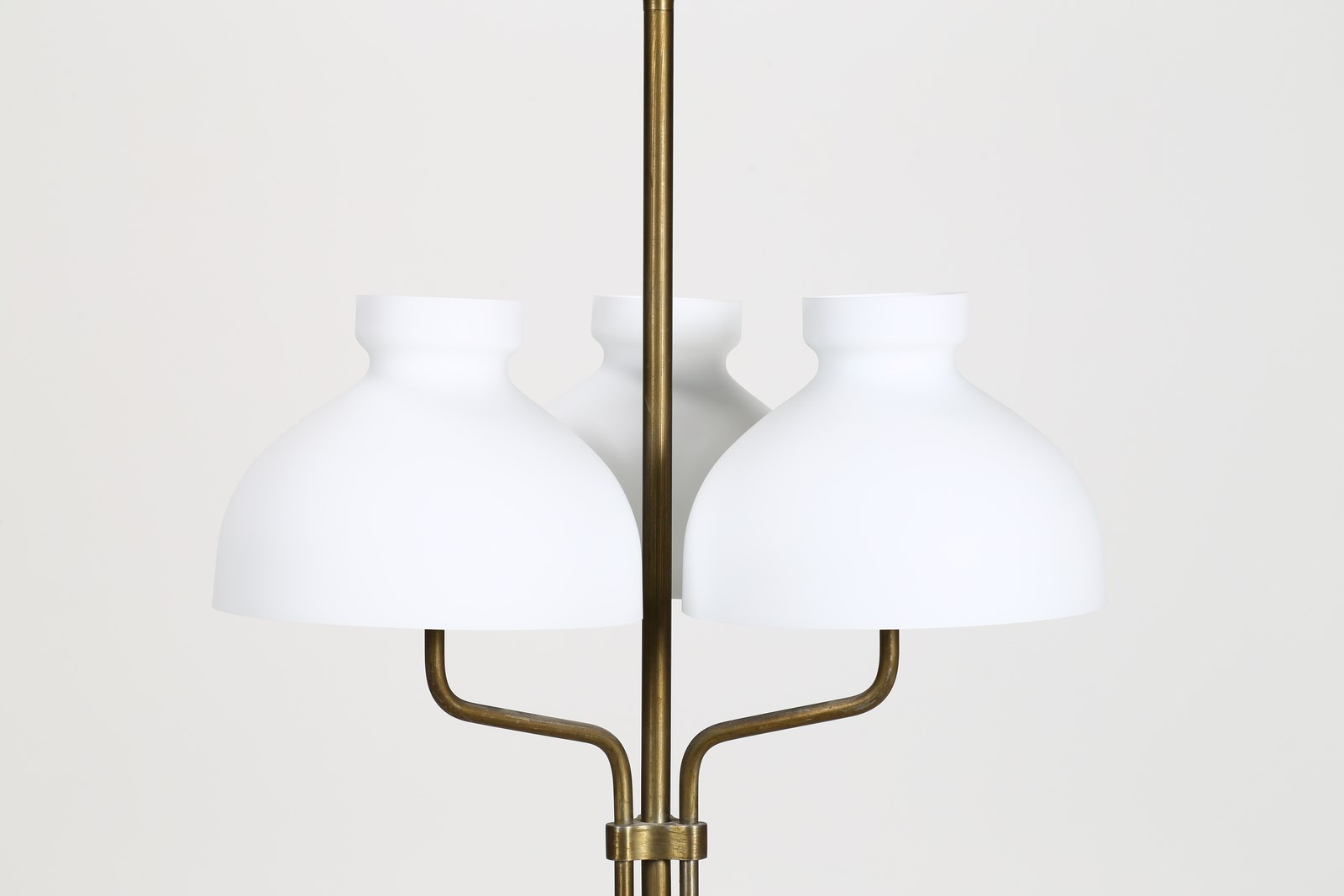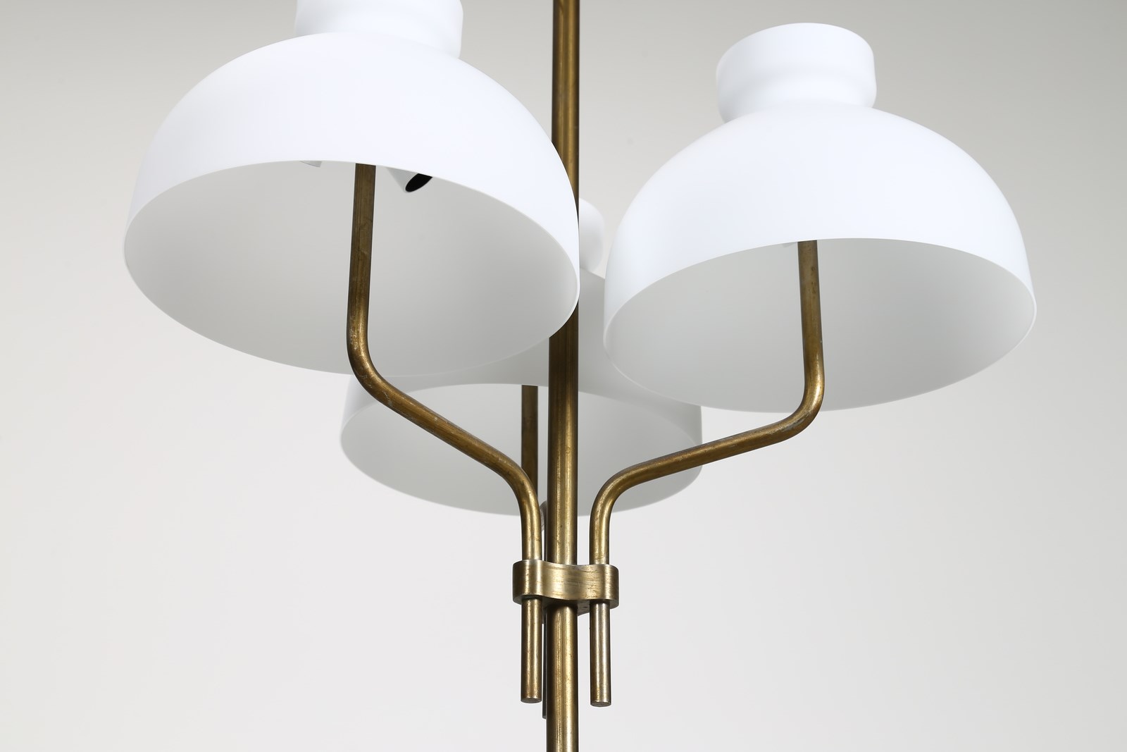 GARDELLA IGNAZIO (1905 - 1999) Lampada da terra. Ottone, vetro satinato. . Base cilindrica in marmo di Carrara, stelo in ottone e paralumi in vetro satinato. Modello Arenzano, per Azucena, anni 50. Pubblicazioni: Domus, n. 435, Febbraio 1966, p. 48 - Alberto Bassi, Italian Lighting Design: 1945–2000, Phaidon Inc Ltd, Milano, 2004, p. 55