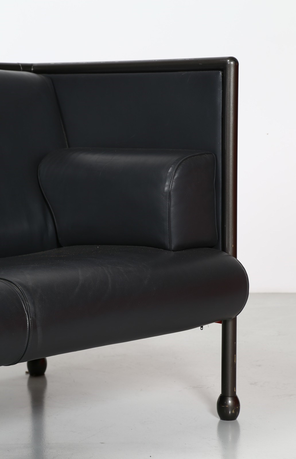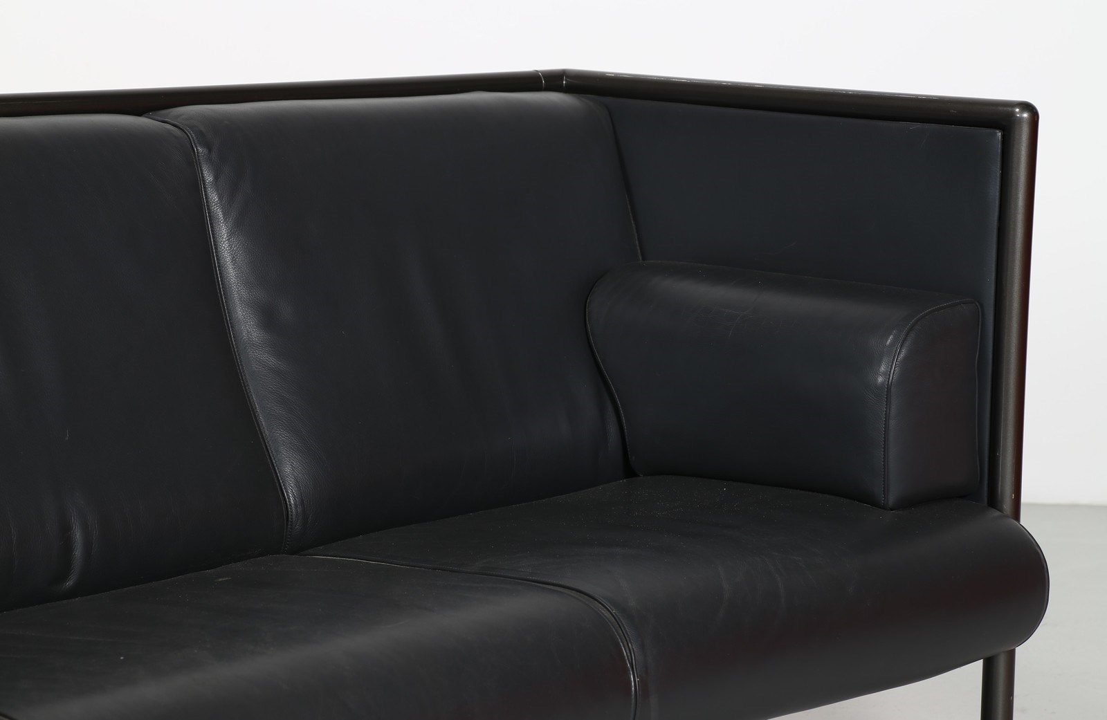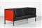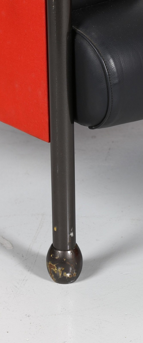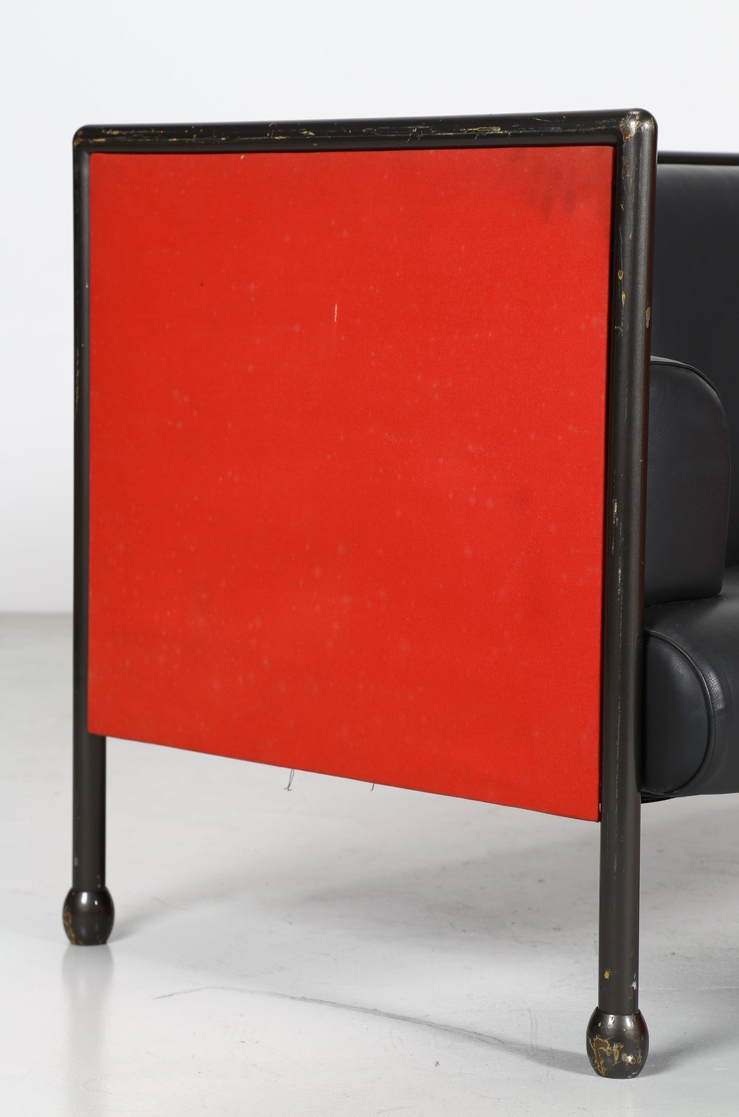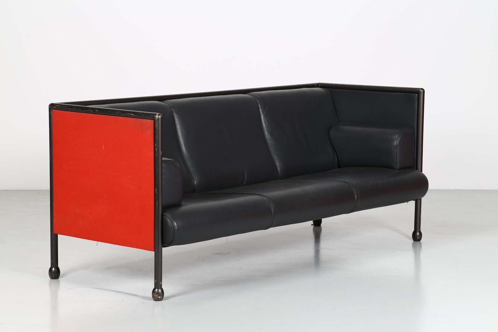 SOTTSASS ETTORE (1917 - 2007) Divano. Metallo e pelle. Cm 200,00 x 84,00 x 74,00. Divano a tre posti modello Danube 850, per Cassina, 1992. Struttura in tubolare nero in ferro verniciato a polvere, pannelli in compensato rivestiti in tessuto dicolore rosso, seduta in pelle naturale. Proveniente da uffici di rappresentanza di banca romana. Pubblicazioni: Bosoni G, Made in Cassina, Skira, Milano, p. 298-299