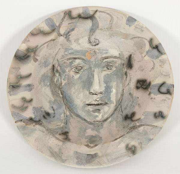 Bruno Ceccobelli Prima di nascere, 2001 piatto in terracotta dipinta, cm. diam. 24 Firma sul retro Bibliografia: "Una collezione di piccole sculture del secondo novecento"-Castello Scaligero-Malcesine,2005,pag. 27. L'opera presenta una perdita di colore sopra gli occhi