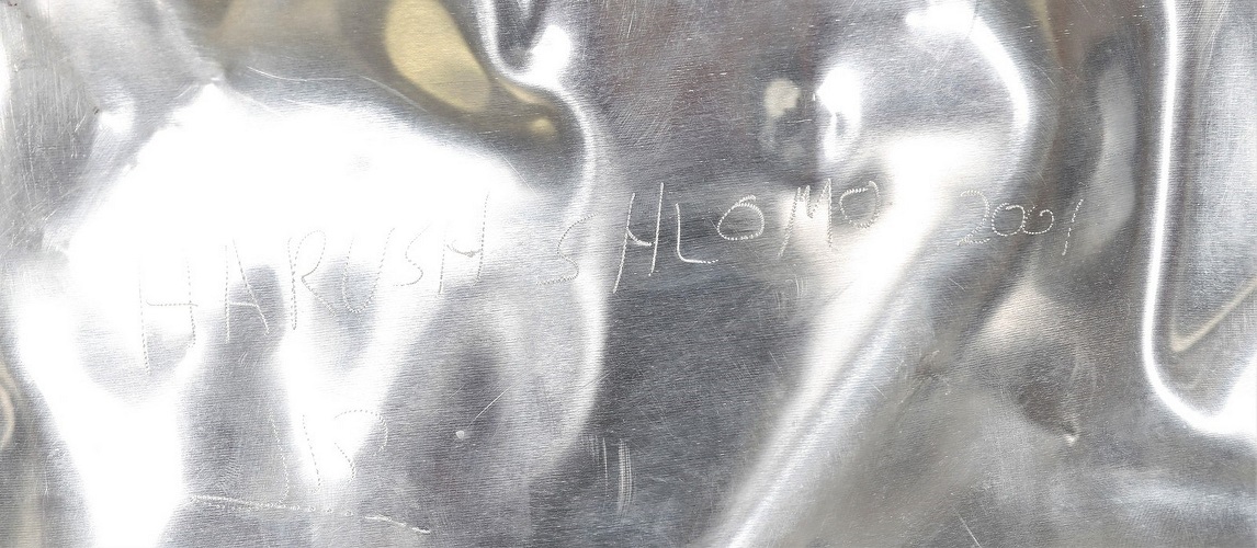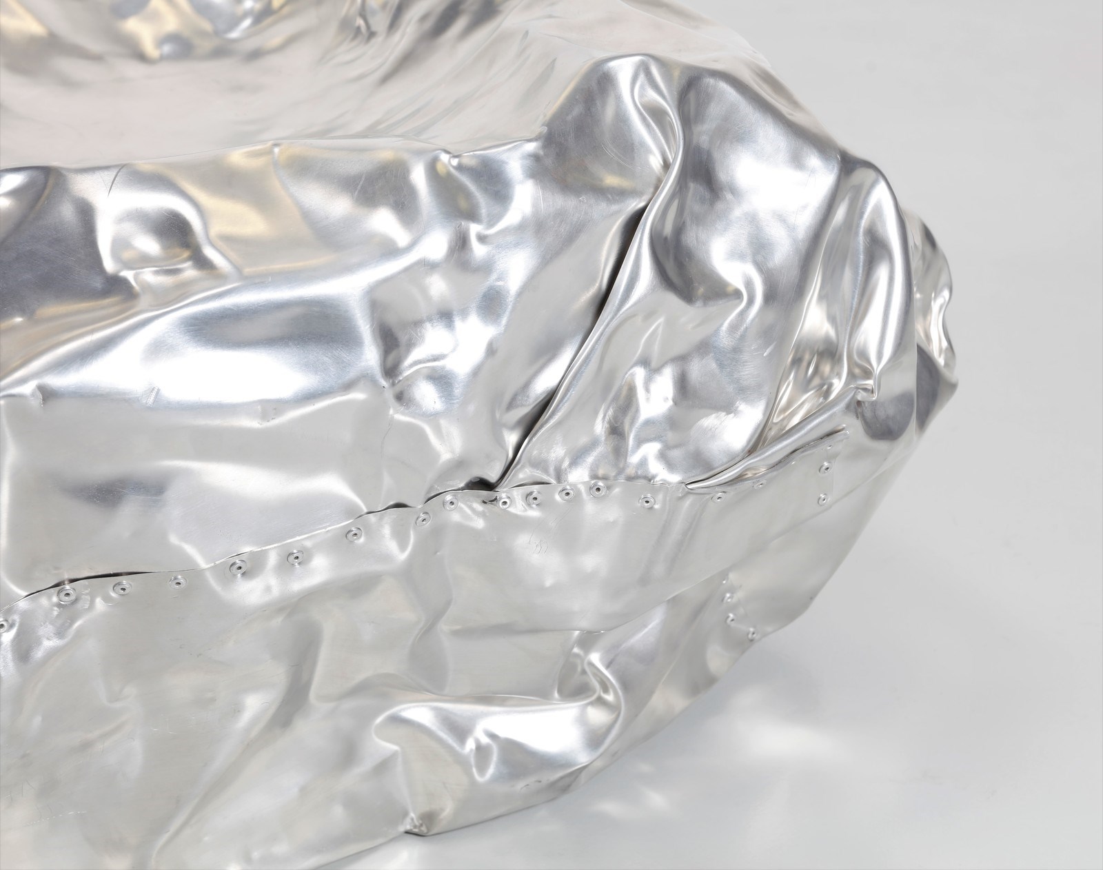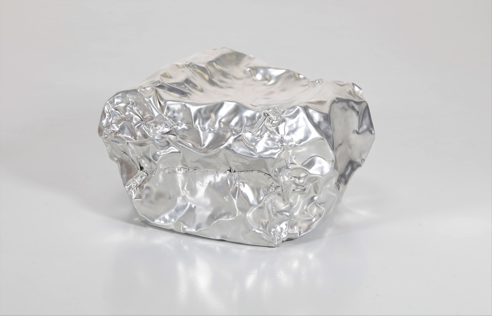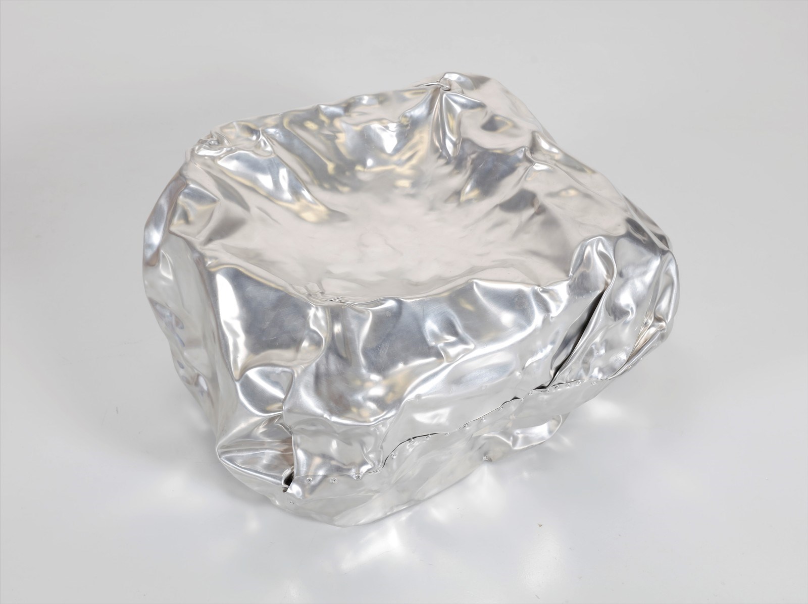 SHLOMO HARUSH (n. 1961) This side up. Alluminio. Cm 82,00 x 46,00 x 67,00. Seduta in alluminio lavorato, pezzo unico. Firma e data alla base: "Shlomo Harush 2001".