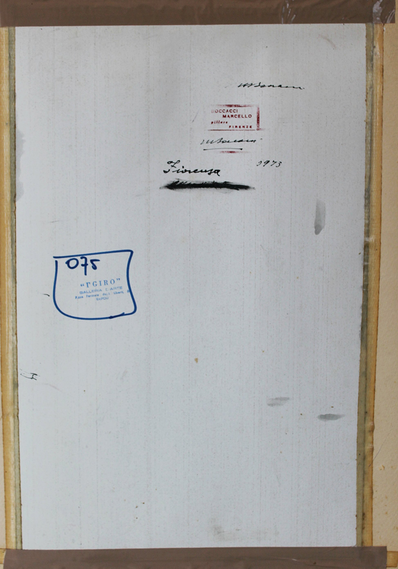 Marcello Boccacci, Fiorenza, 1973. Tecnica mista su cartone, Dimensioni: 50cm x31cm. Certificazione: Firmato fronte e retro opera - timbro Boccacci pittore Firenze retro opera