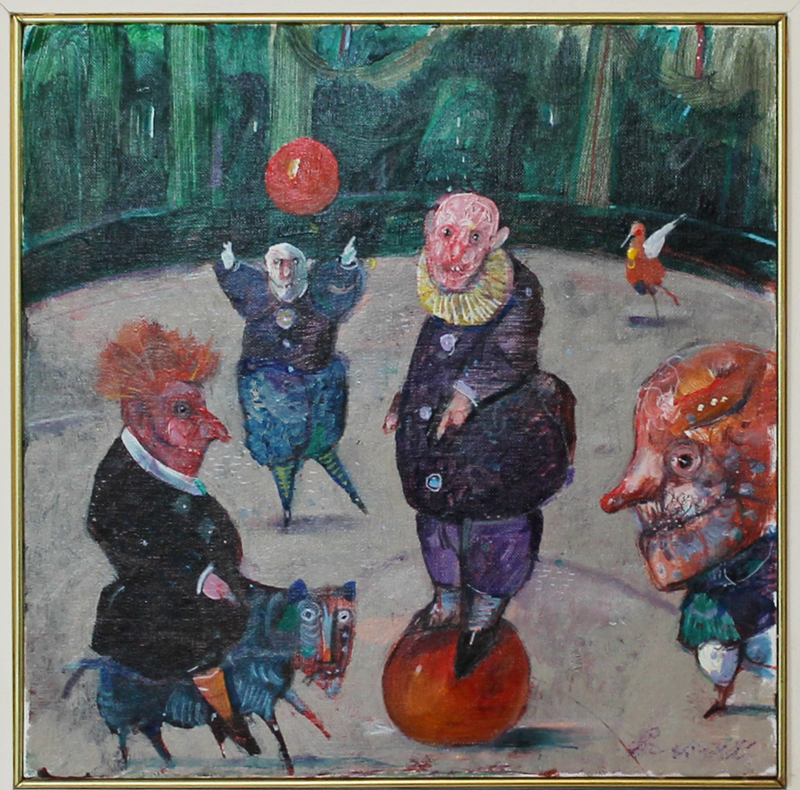 Antonio Possenti, Un circo, anni 2000. Olio su cartone telato, Dimensioni: 30cm x30cm. Certificazione: Archivio su foto