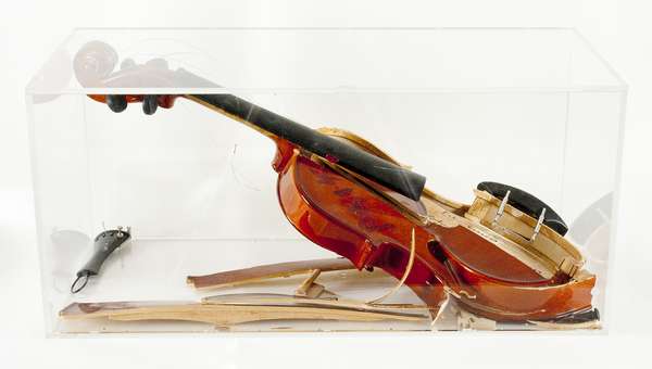 violino rotto dentro teca in plexiglass. Pezzo unico, cm. 23x50x23