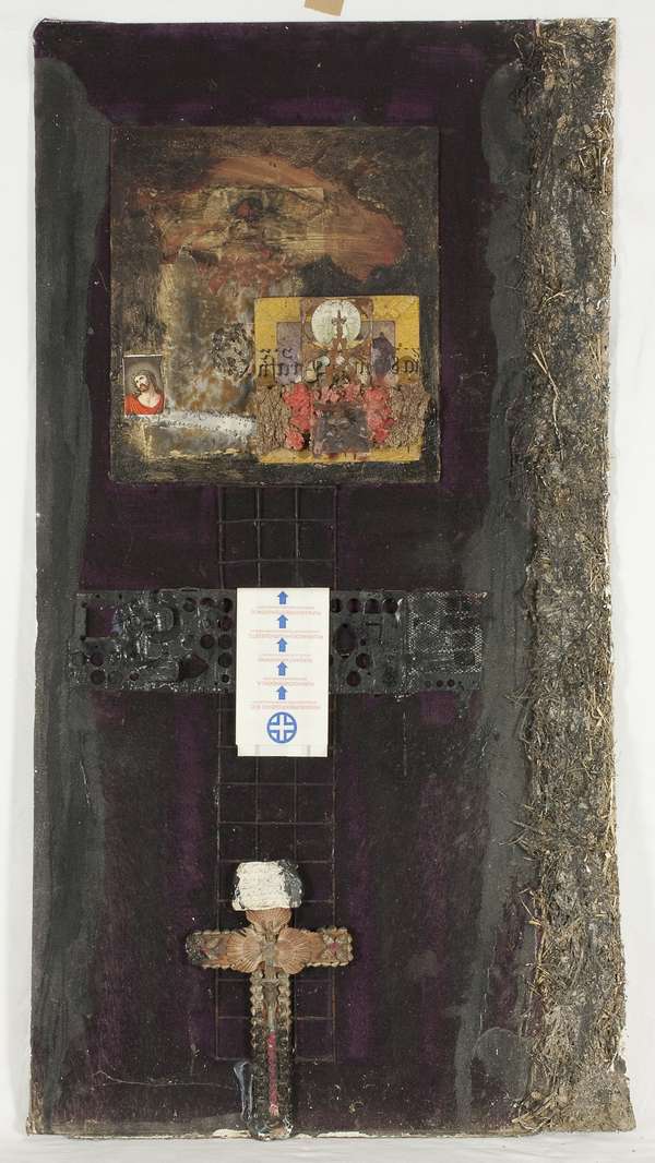 Jacob De Chirico Senza titolo, anni '80 assemblaggio di vari materiali su tavola, cm. 146x76