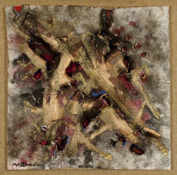 Umberto Mastroianni Composizione tecnica mista e strappi su cartone sagomato, cm. 59x59  Firma in basso a sx  Autentica su foto a cura della Galleria d'Arte Farsetti. Conferma di autenticità via mail a cura del Prof. Floriano De Santi, Archivio Mastroianni