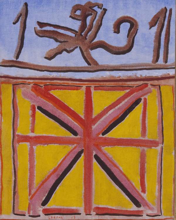 Riccardo Licata Composizione, 1967 olio su tela, cm. 50x40 Firma in basso al centro Sul retro etichette della Galleria d'Arte Il Traghetto,Venezia e della Galleria d'Arte Schreiber,Brescia e timbro della Galleria d'Arte "Pro Padova"