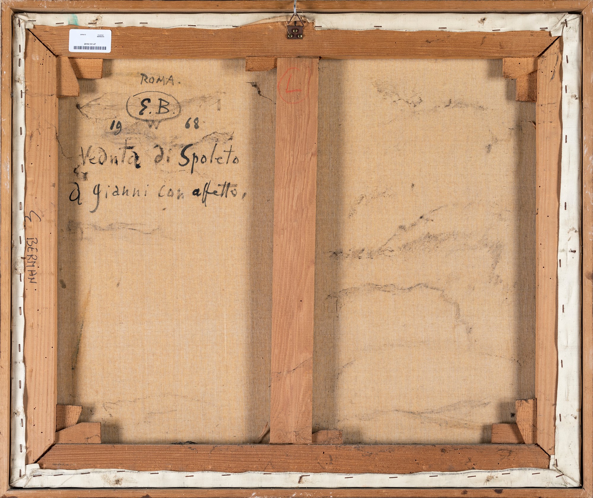 Eugene Bermann Veduta di Spoleto - Monogramma e data sul fronte "E.B. 1968". Al verso reca monogramma, data, titolo e dedica a Giovanni Carandente. - 65x78 - Olio su tela - 1968