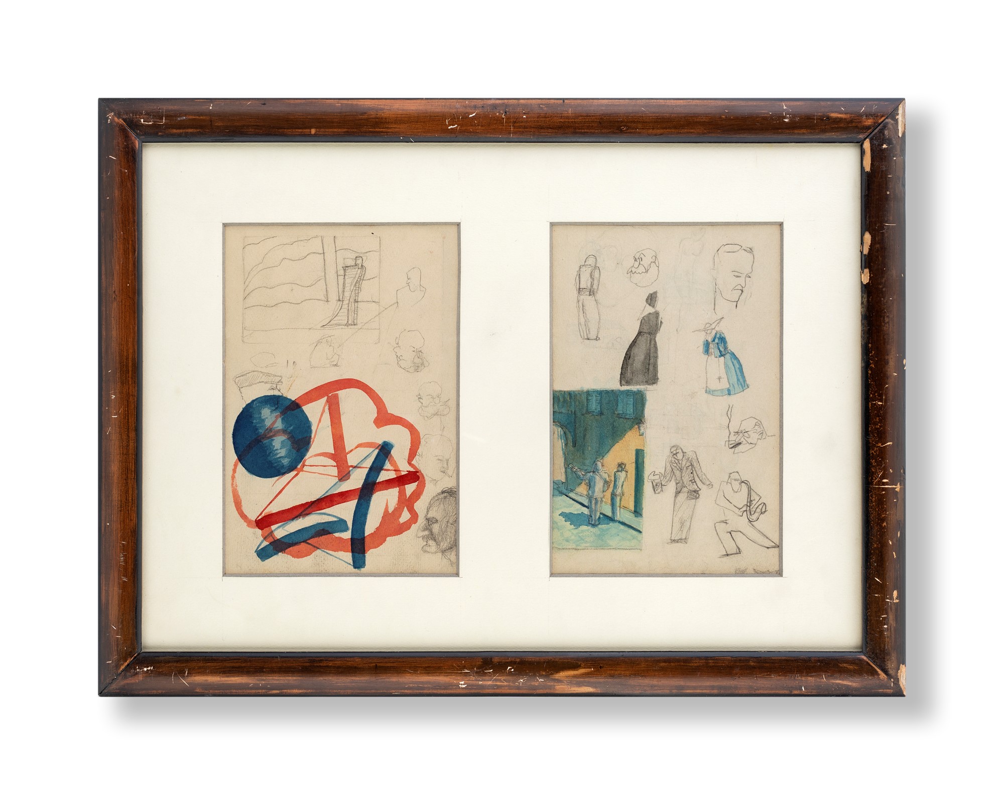 Bruno Munari Lotto di due acquarelli - A) Viaggio Interplanetario, 1932/33. Al verso reca disegni per studi di figureB) Serenata, 1932/33. Al verso reca disegni per studi di edifici.Al verso sulla cornice etichetta della Galleria Edieuropa, Roma. - 24x16 - Acquarello e matita su cartoncino