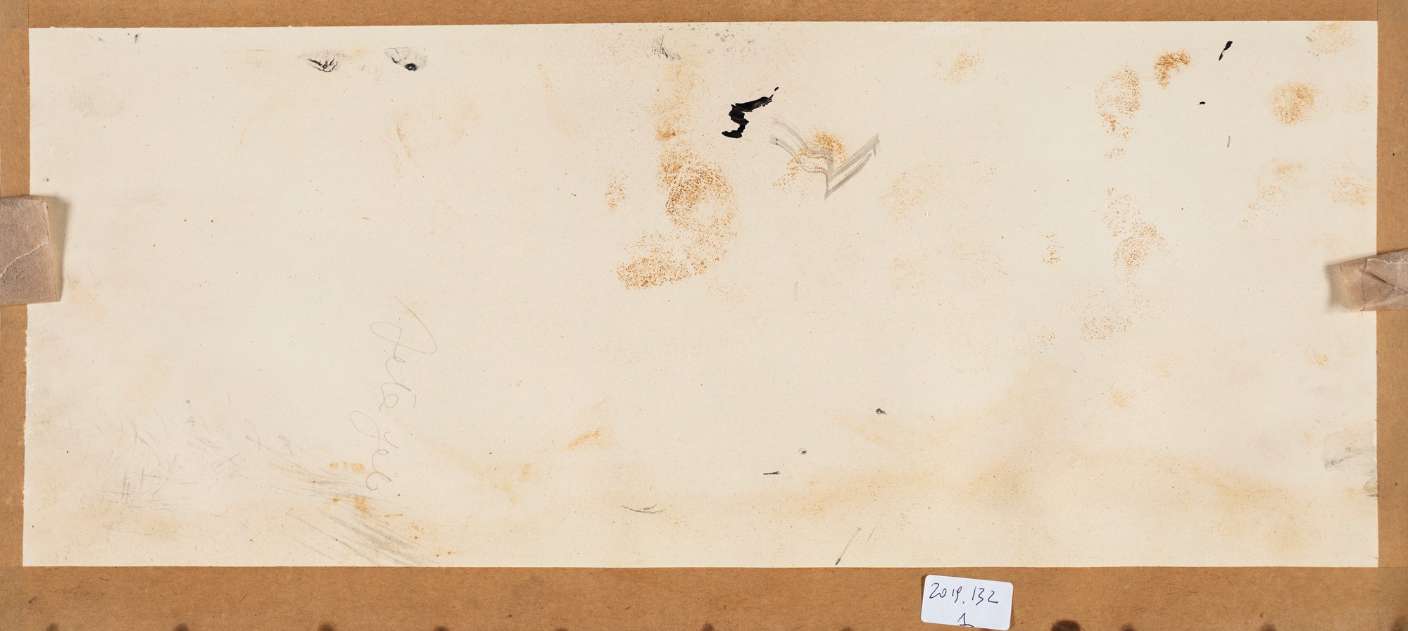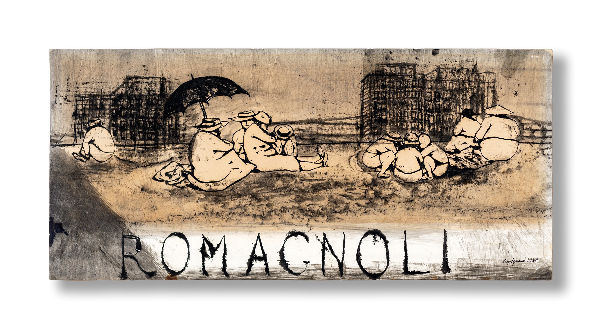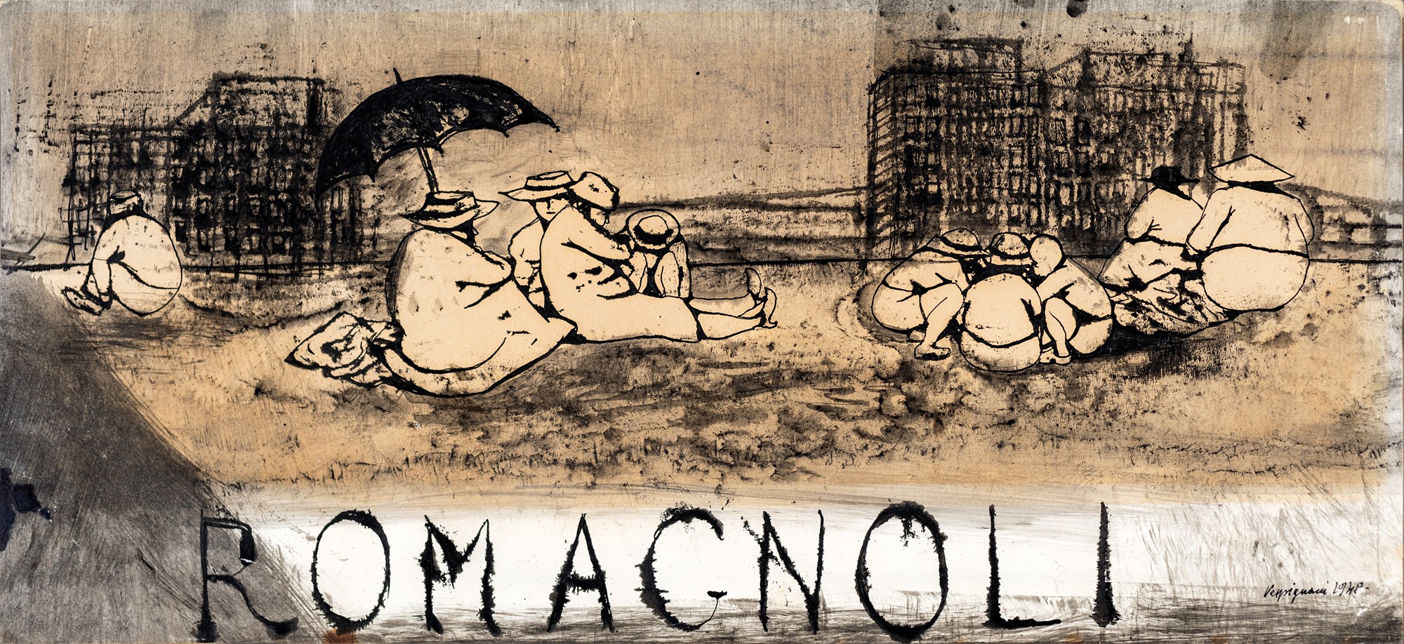 Renzo Vespignani PERIFERIA - Firma e data sul fronte in basso a destra "Vespignani 1948". L'opera fu donata da Vespignani al negozio Romagnoli. - 20x44,5 - China e acquarello su cartoncino - 1948