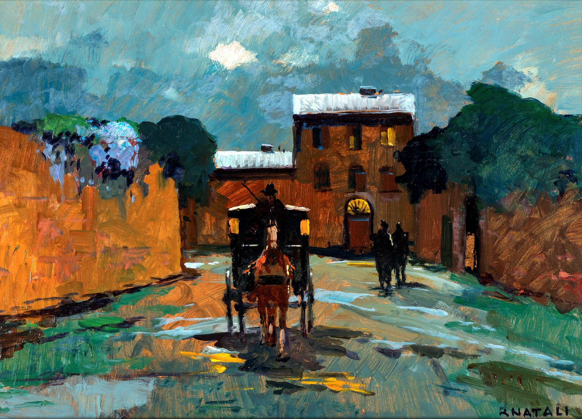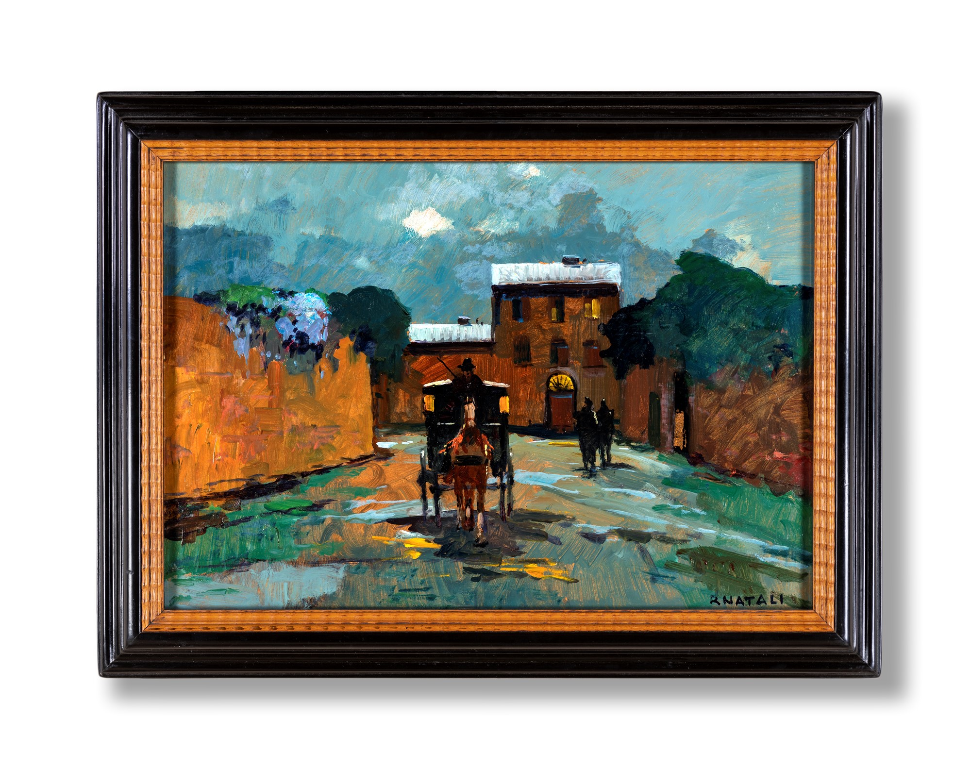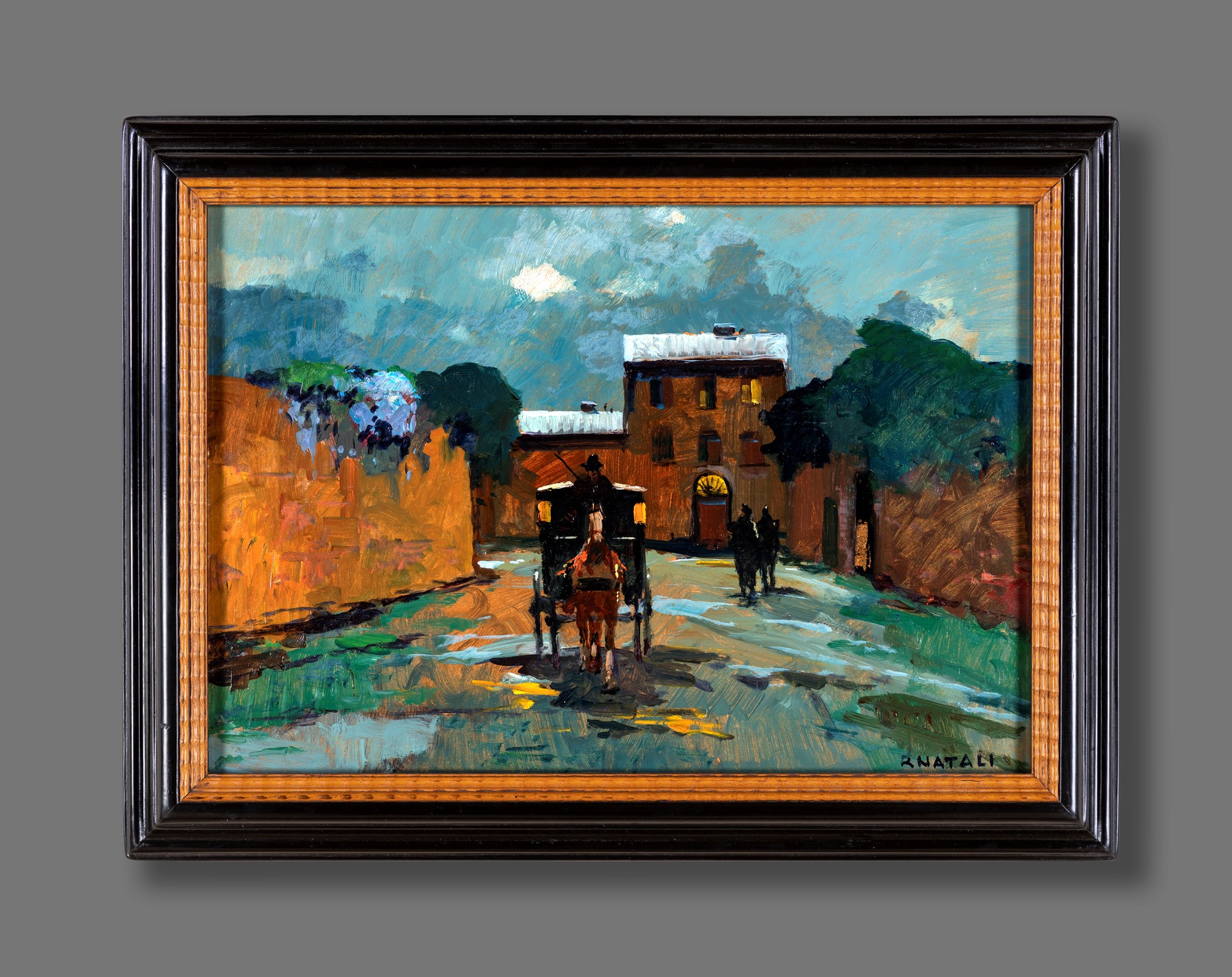 RENATO NATALI Carrozza Notturno - Sul fronte reca firma "R. Natali". Al verso reca titolo. - 35x50 - Olio su faesite