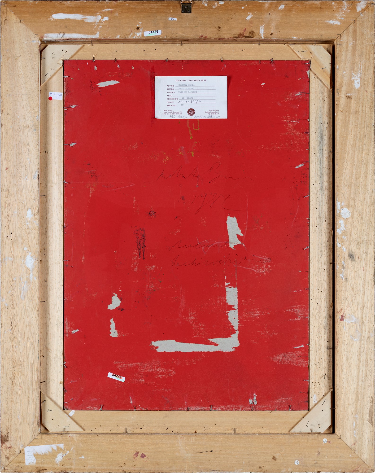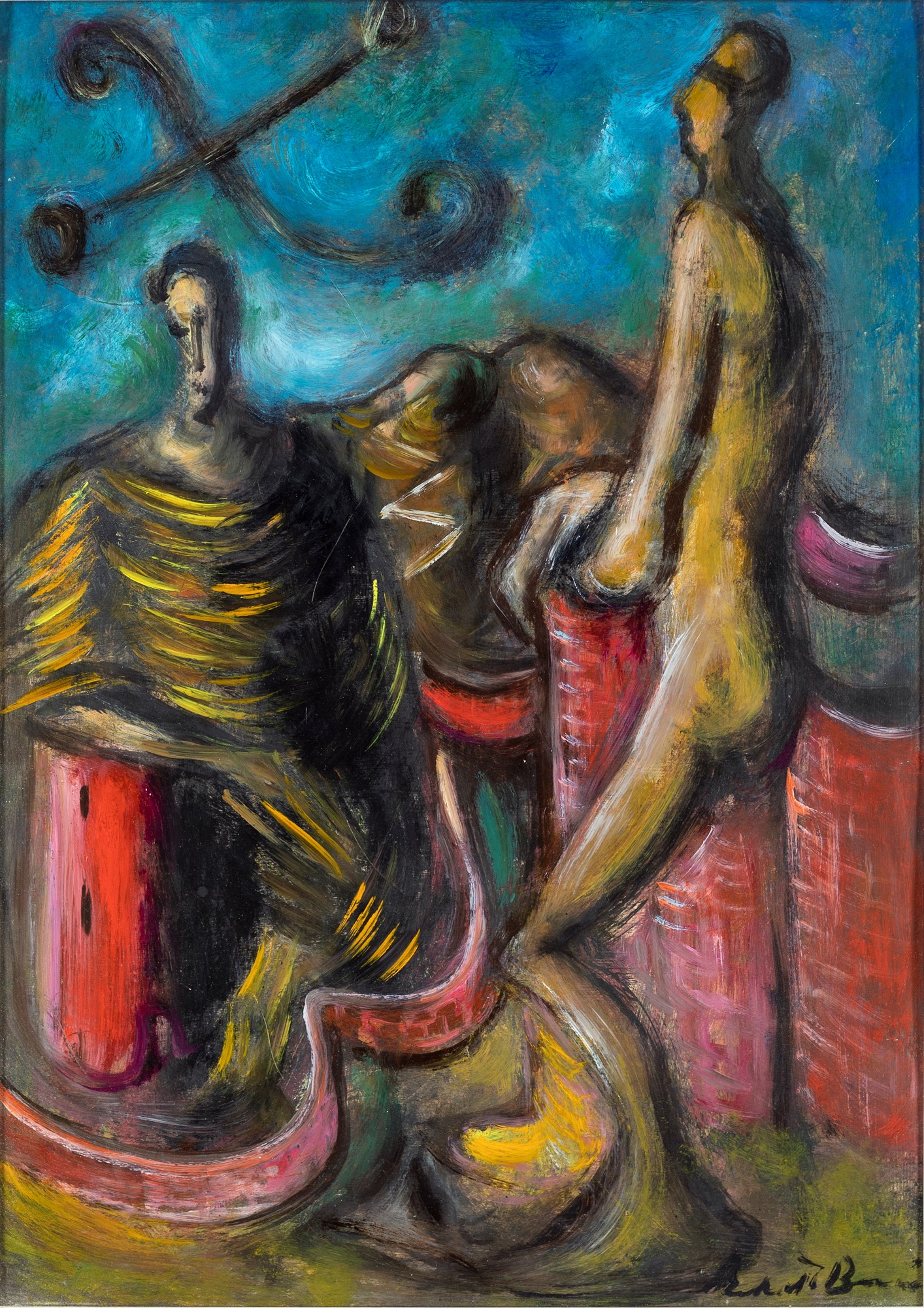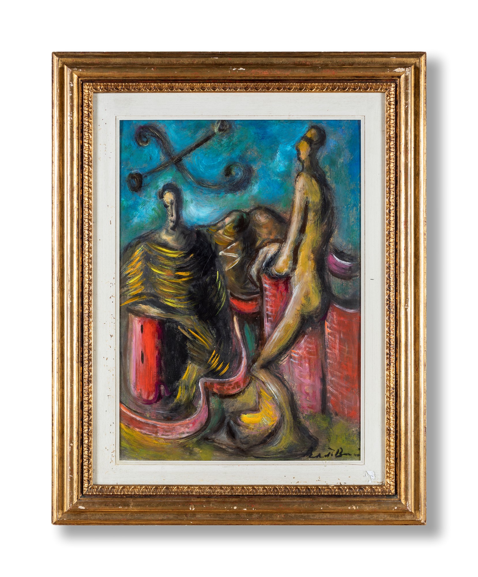 ROBERTO BARNI Racconto dechirichiano - Firma sul fronte in basso a destra "Roberto Barni". Firma, data e titolo al verso. Etichetta Galleria Leonardo Arte (Roma). - 50x71,5 - Olio su cartone - 1982