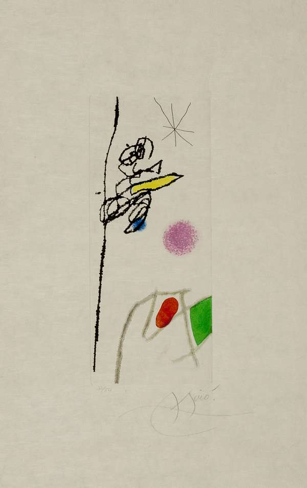 Juan Mirò Le Rossignol effronte, 1972 acquatinta su carta japan,es. 31/50, cm. 31x13 l'inciso - cm. 57x38  Firma in basso a dx dell'inciso  ref. Dupin 557