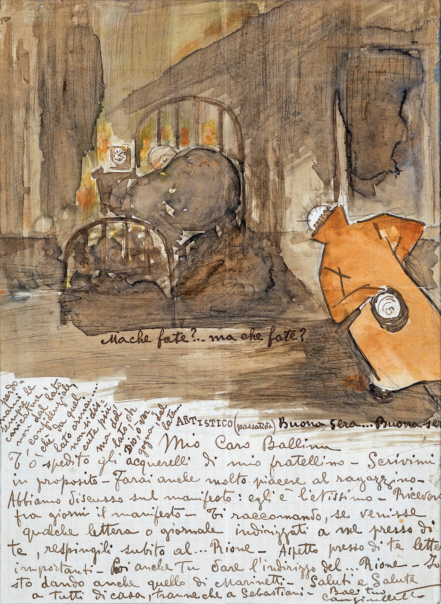 Francesco Cangiullo Il Rione Sirignano e il Manifesto dei bambini - Firma in basso a destra: Cangiullo - 27,2x19 - Acquarello su carta - 1915
