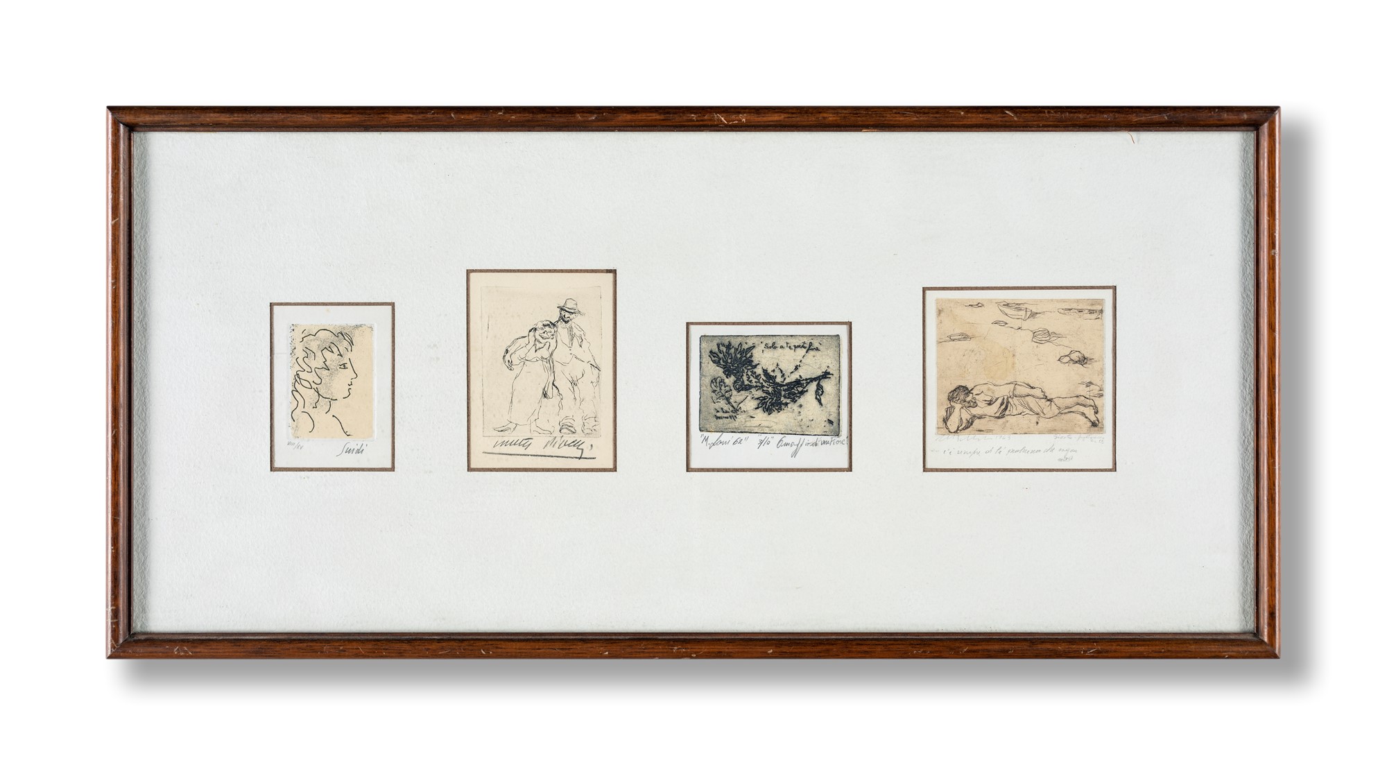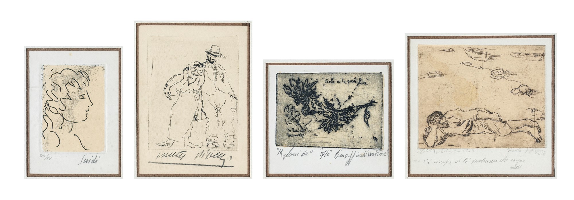 Lotto di 4 acquaforti - Entro stessa cornice (31x66 cm)A) Figura, 9x7 cm, firma e numerazione a matita sul fronte "VIII/XV - Guidi".B) Due figure, 11x8 cm, firma sul fronte "Walter Piacesi".C) Solo a te questo fiore, 1962, 8x10 cm, firma data e numerazione sul fronte. Titolo su lastra.D) Siesta, 1962, 10x11, firma, data, titolo a matita sul fronte. - -