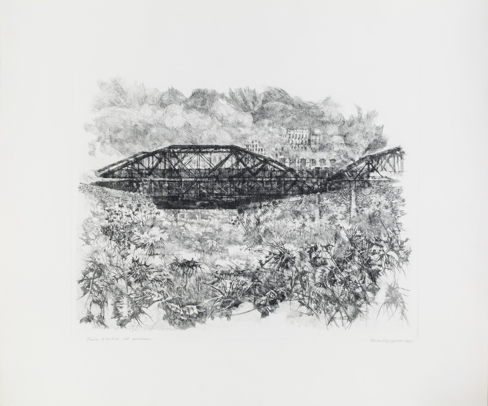 Renzo Vespignani Periferia (Ponte di ferro) - Firma, data e numerazione sul fronte "Renzo Vespignani 1981, prova d'autore ad personam". - cm 68x81 - Acquaforte - 1981
