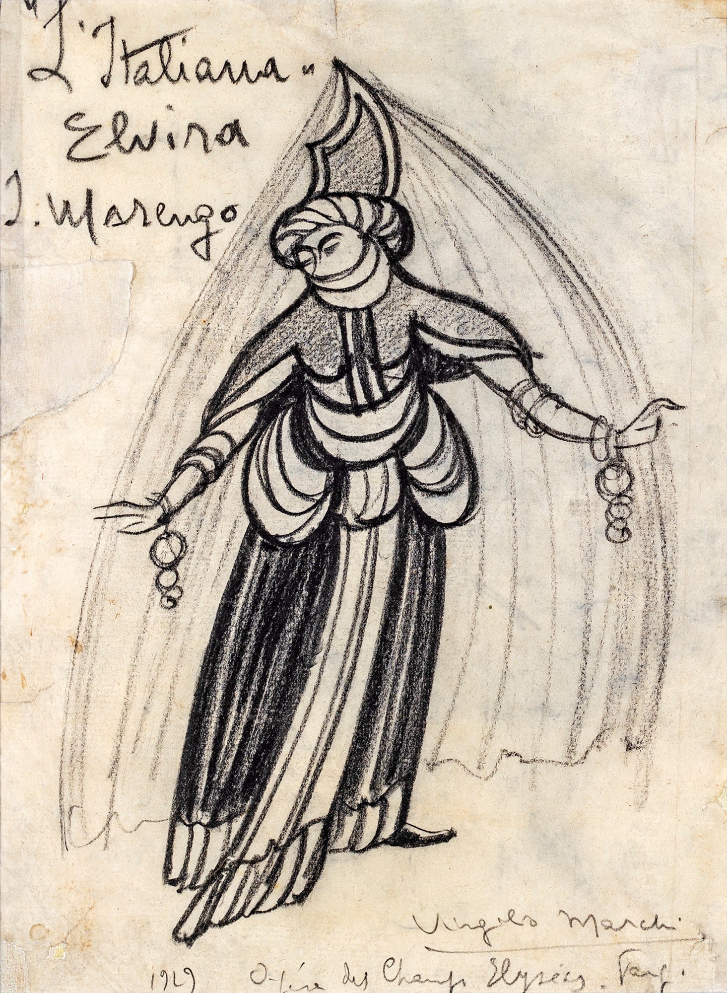 Virgilio Marchi Bozzetto di scena per Elvira da "L'Italiana in Algeri" di Rossini - Iscrizione in alto a sinistra: “L’Italiana”, Elvira, I. Marengo