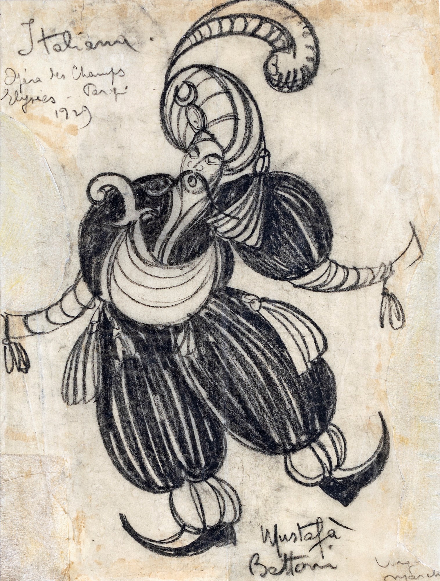 Virgilio Marchi Bozzetto di scena per Mustafà da L'Italiana in Algeri di Rossini - Data e luogo in alto a sinistra: “L’Italiana”, Virgilio Marchi, 1919, Opéra de Champs-Elysèes, Parigi