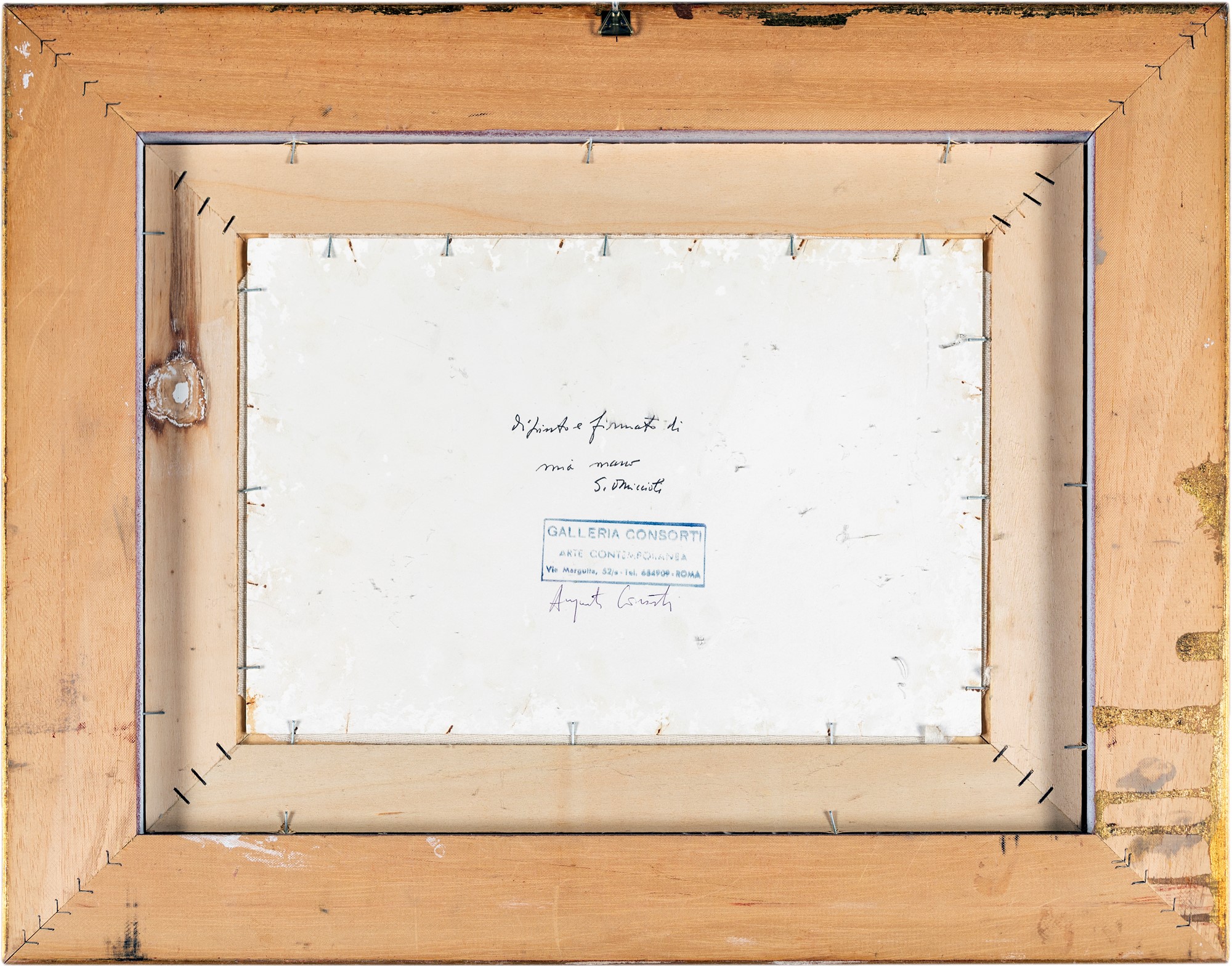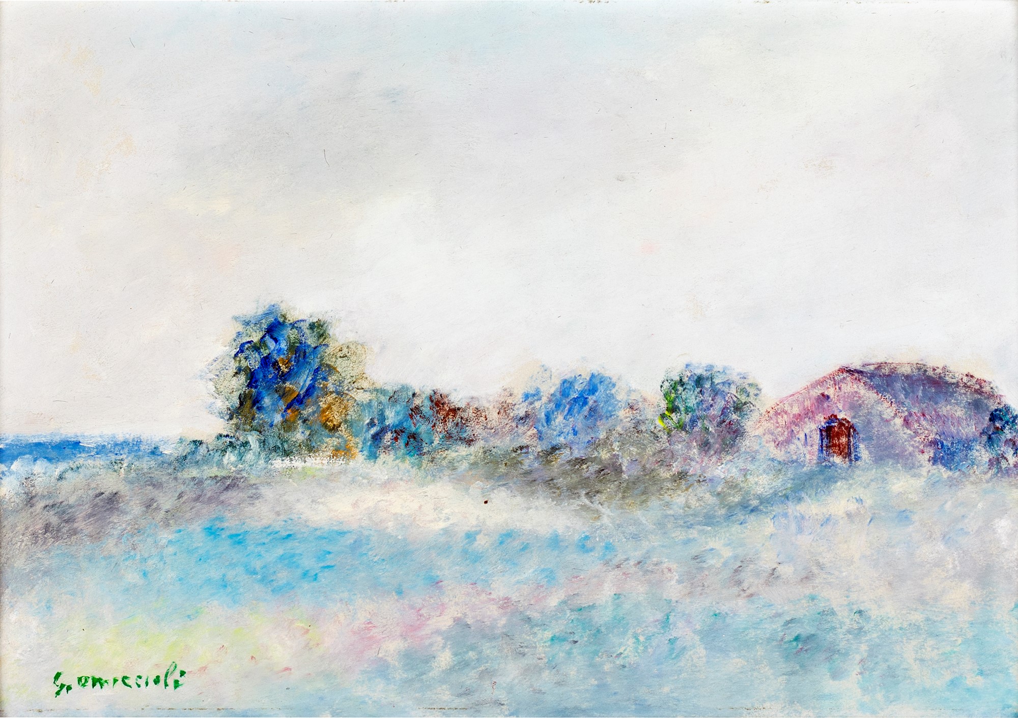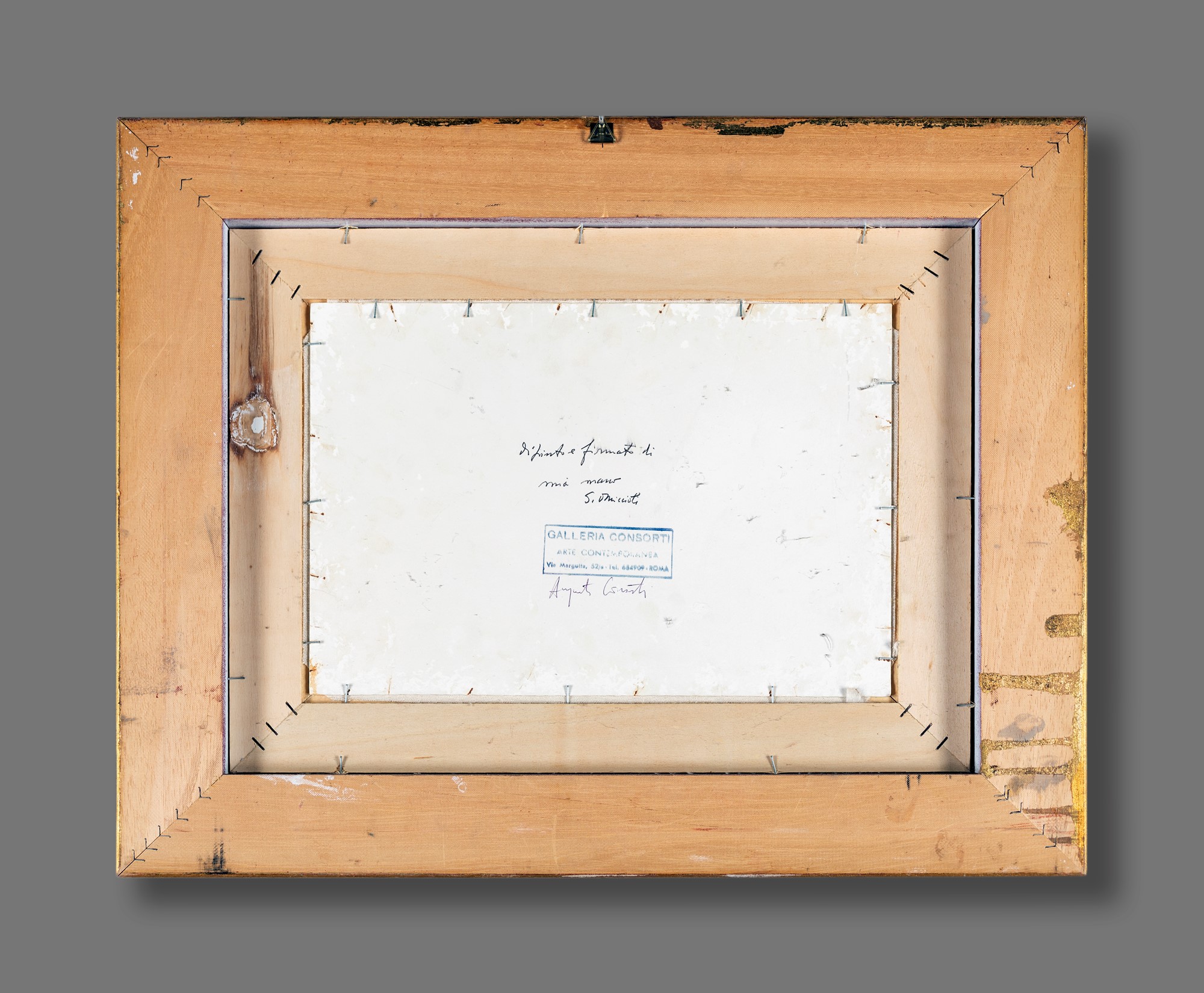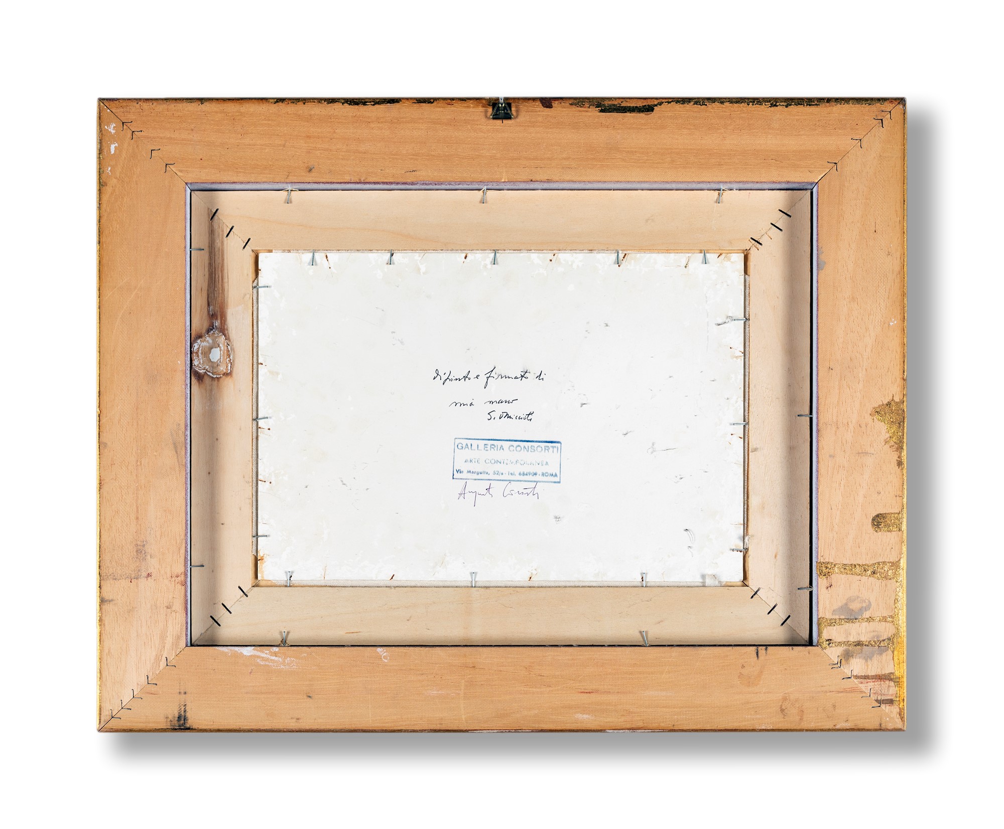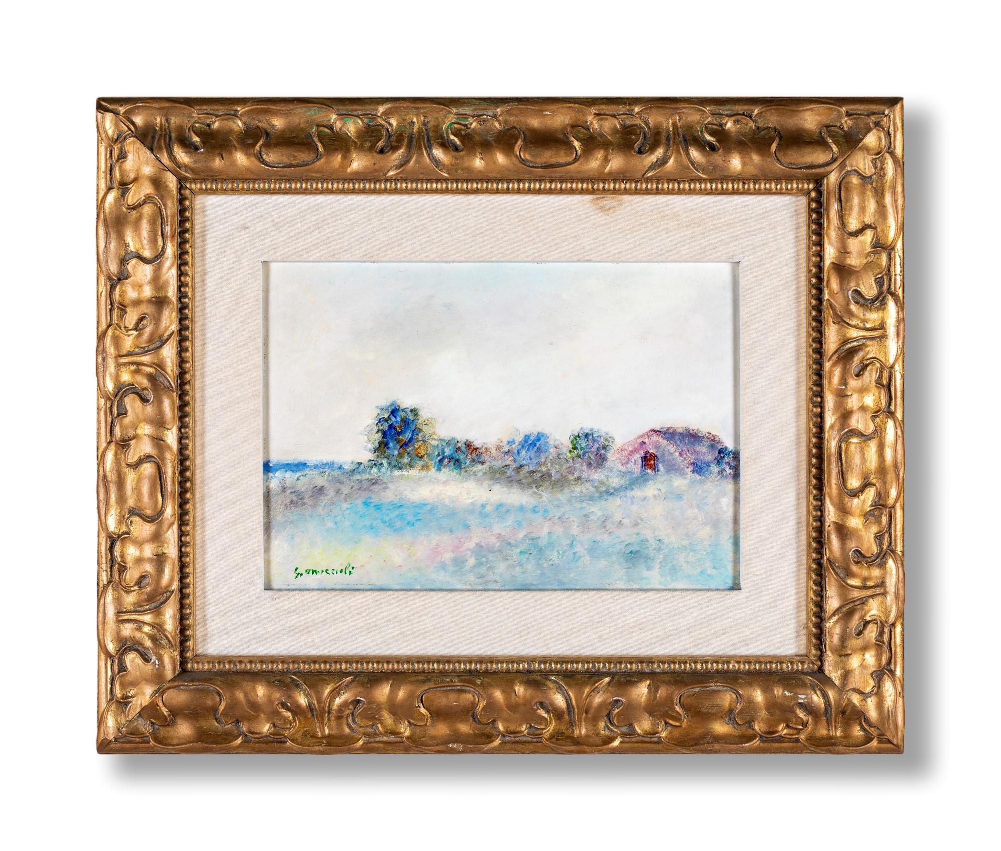 Giovanni Omiccioli Capanne a Fregene - Firma sul fronte a sinistra "G. Omiccioli". Al verso reca: "Dipinto e firmato di mio pugno, G. Omiccioli". Timbro "Galleria Consorti, Roma" e firma Augusto Consorti. - 25x35,5 - Olio su cartone