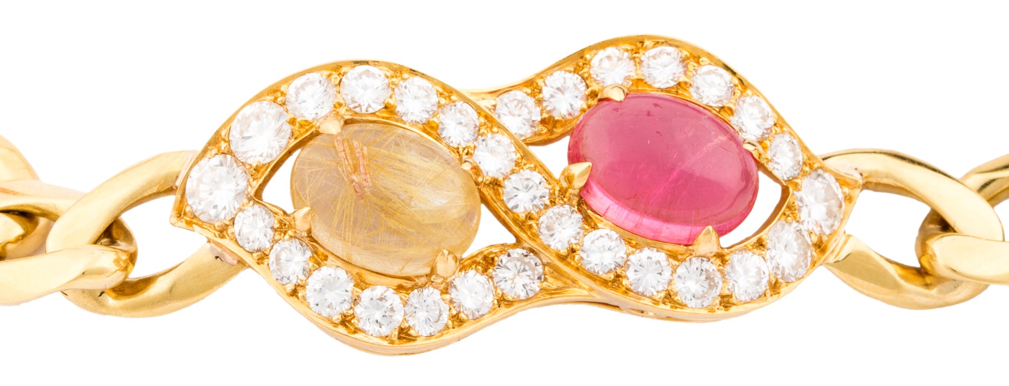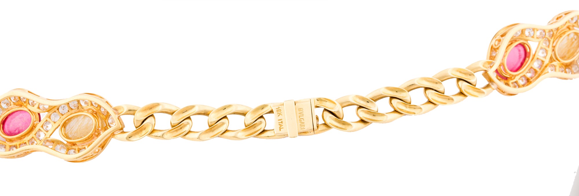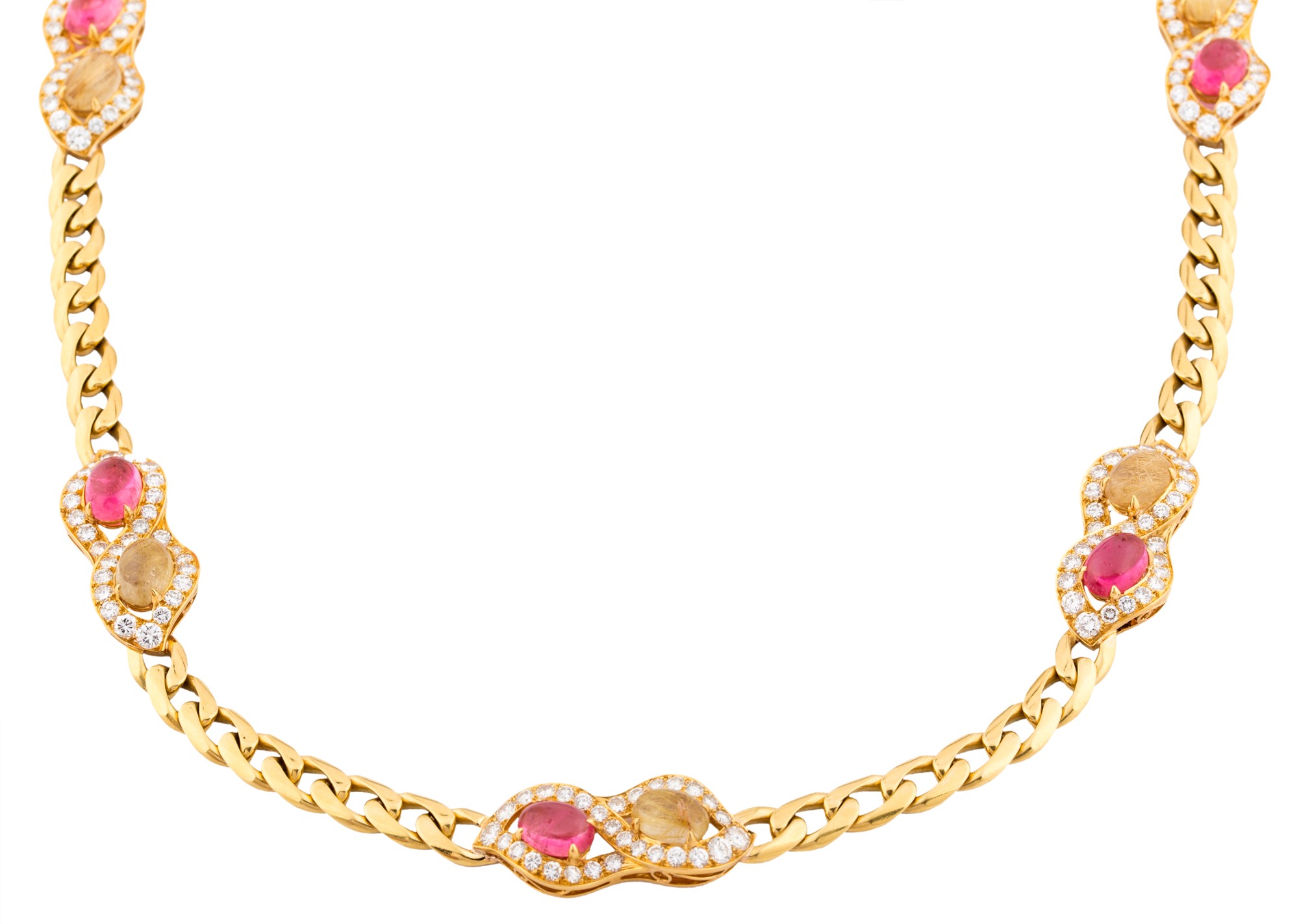 LUNGA CATENA BULGARI - in oro giallo gr.145,68 con 7 rubelliti ct.27, 7 quarzi rutilati ct.24,50 e 203 diamanti ct.19,00 F/G color VVS, cm 73